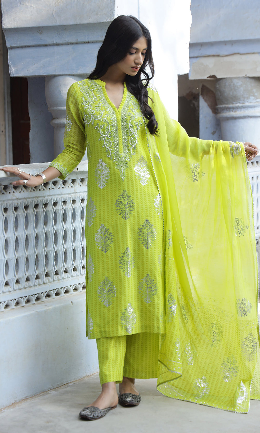 Summer Eid'23- Neon Green Foil Printed Straight Suit Set of 3