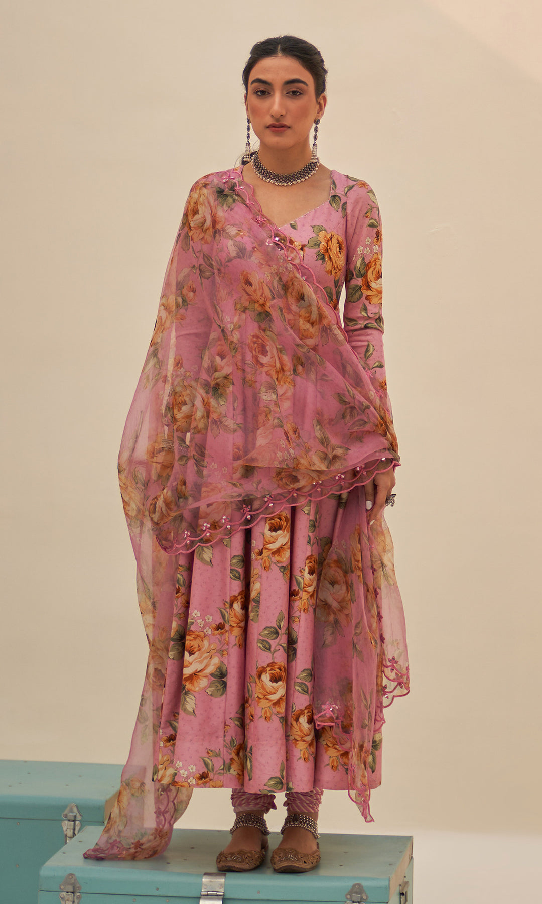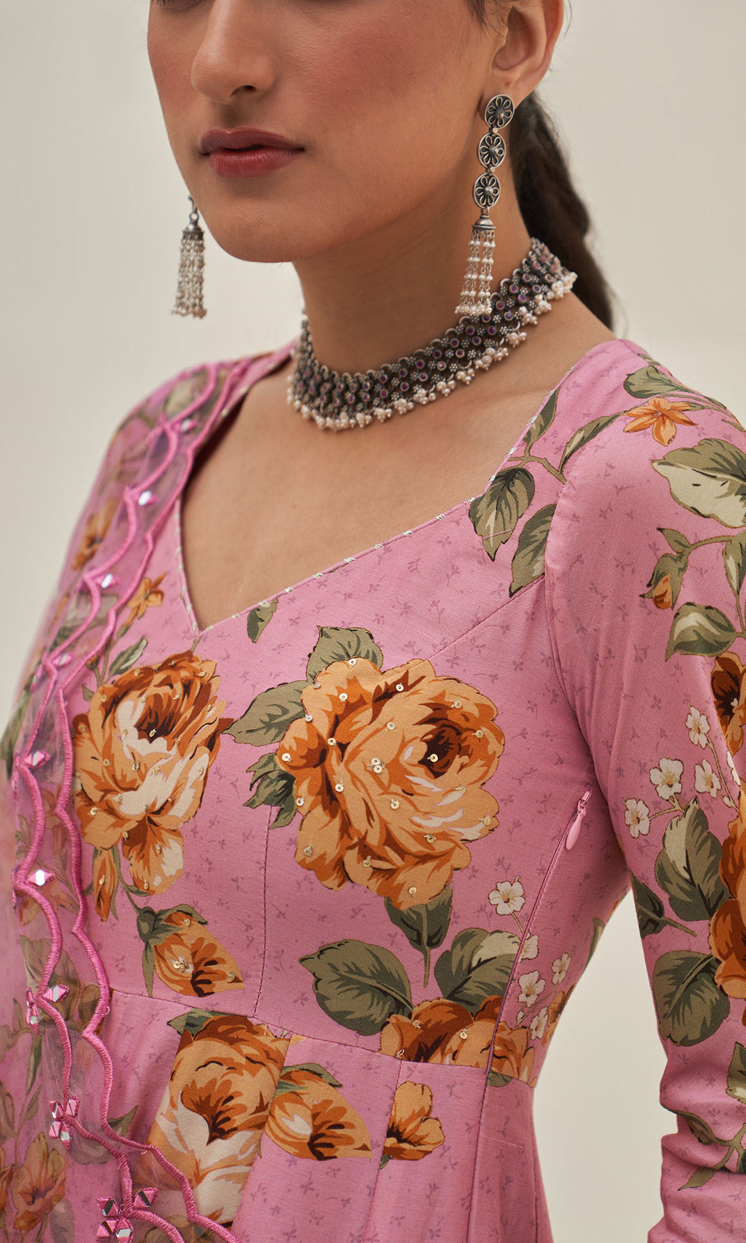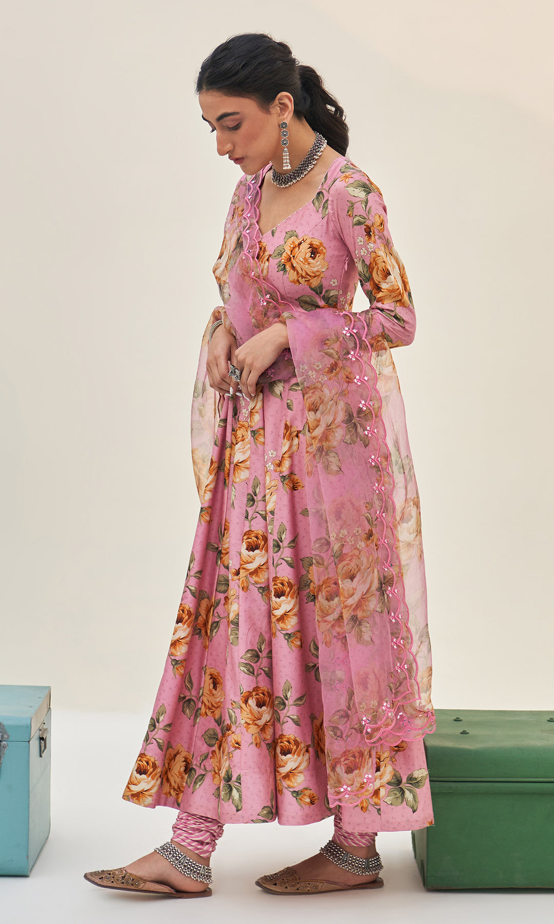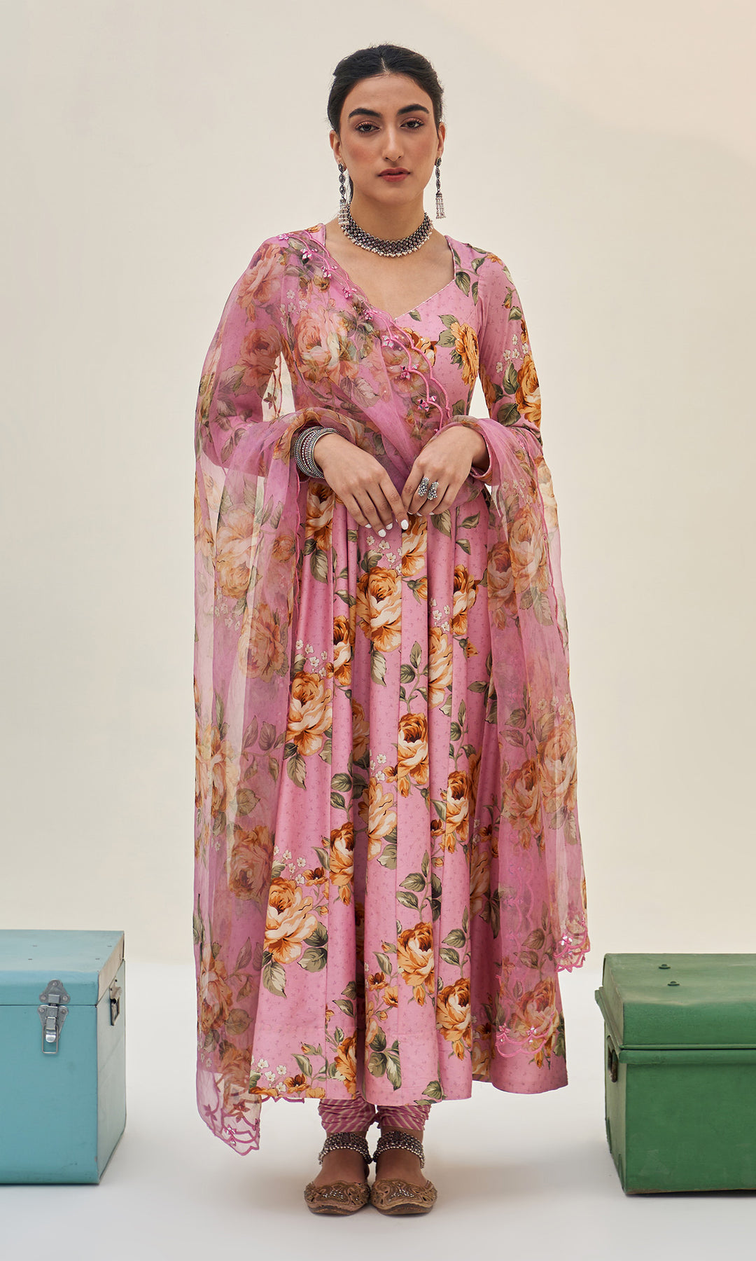 This set includes flotal printed anarkali , chooridar and dupatta . Anarkali yoke is embellished with sequins work . It comes with printed chooridar and mirror work scalloped dupatta .