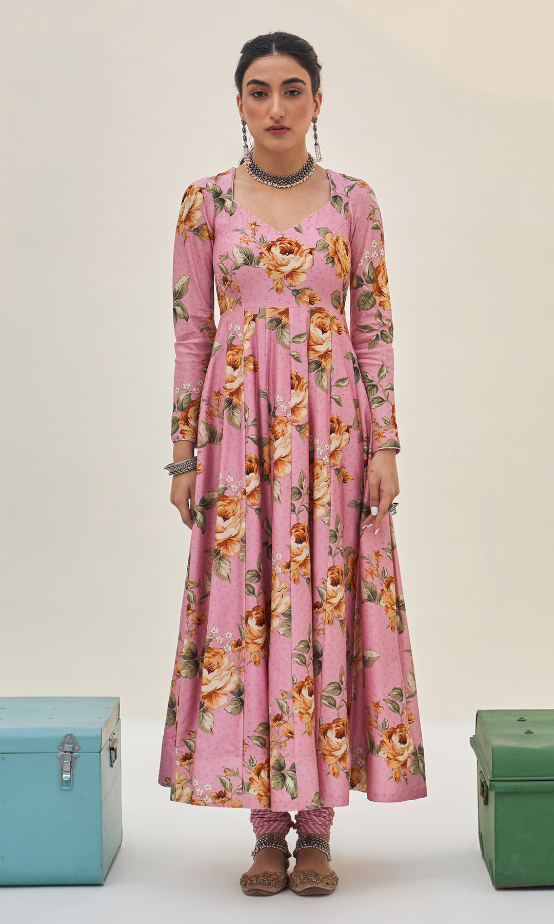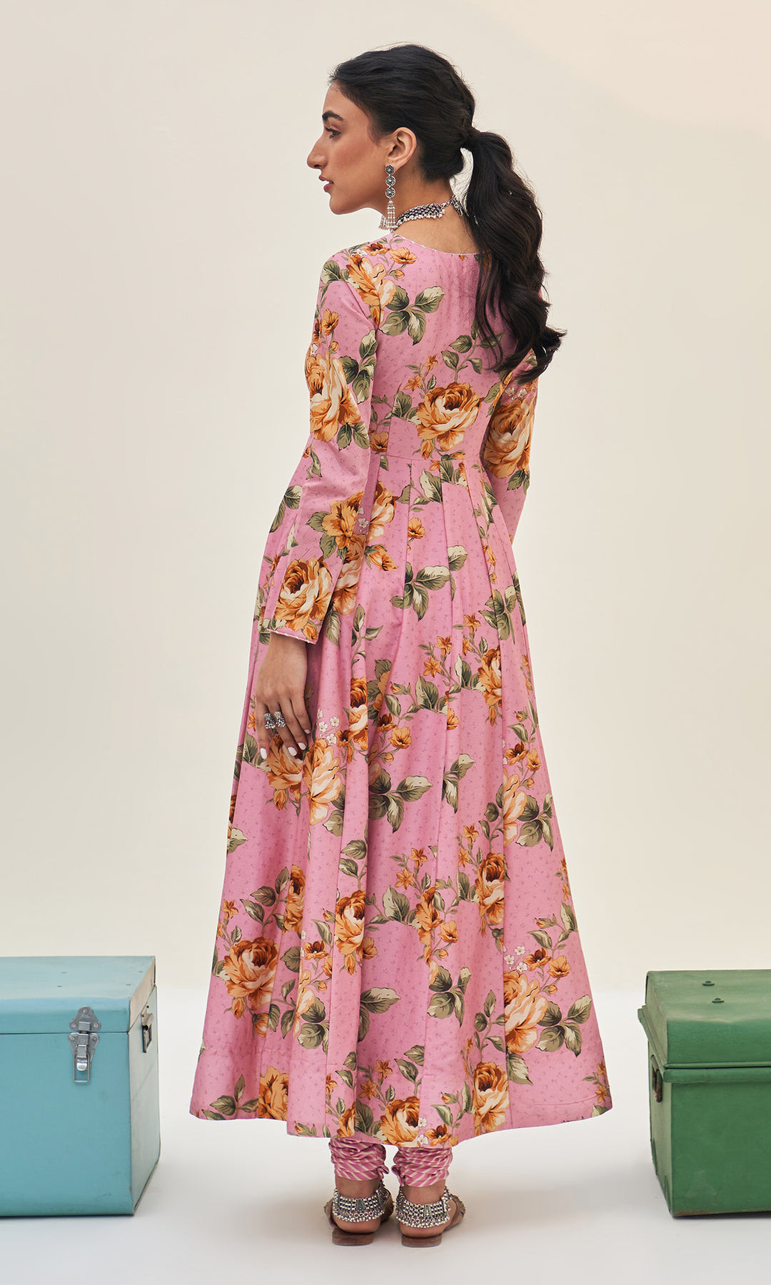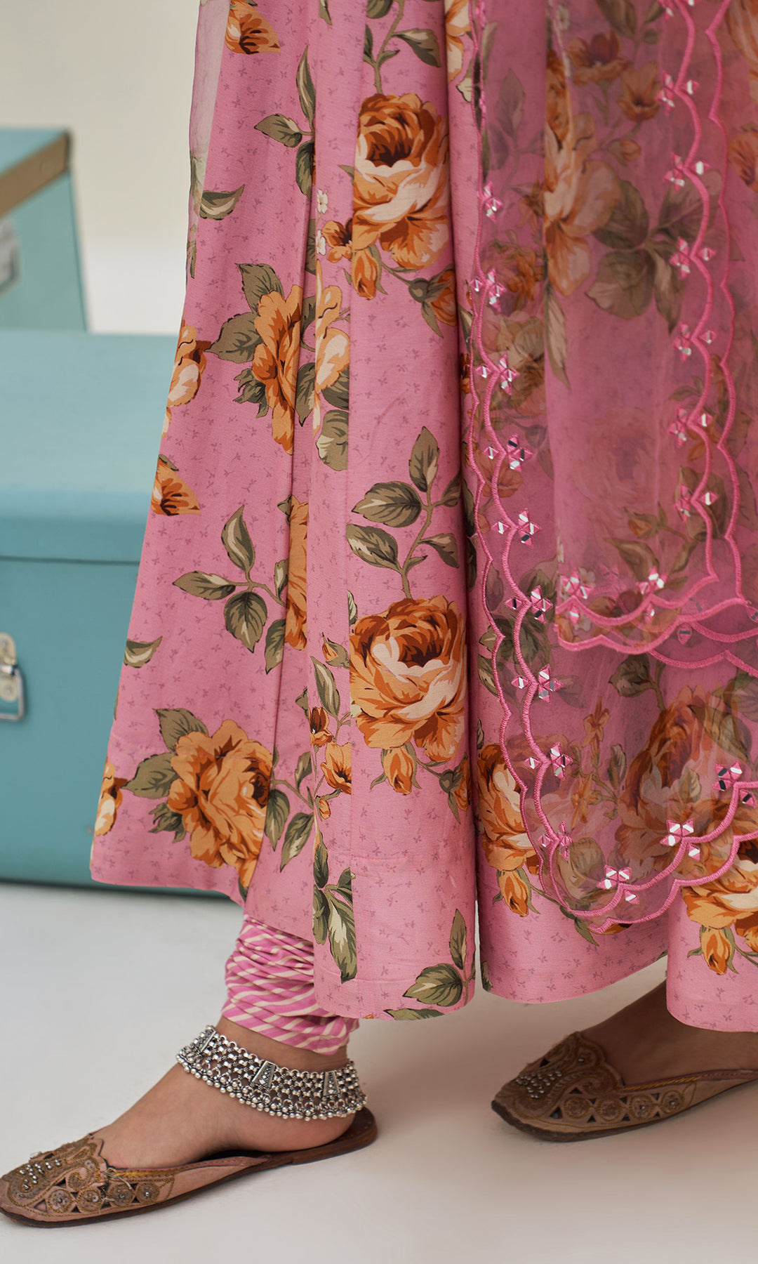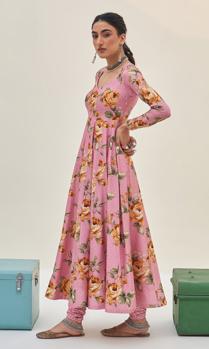 This set includes flotal printed anarkali , chooridar and dupatta . Anarkali yoke is embellished with sequins work . It comes with printed chooridar and mirror work scalloped dupatta .