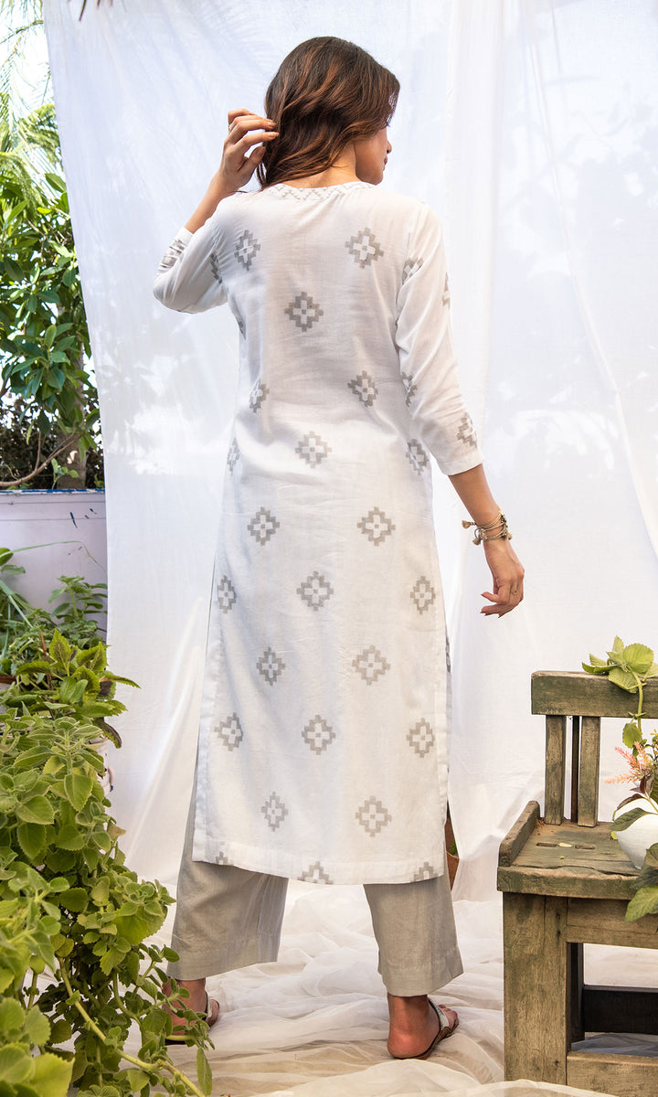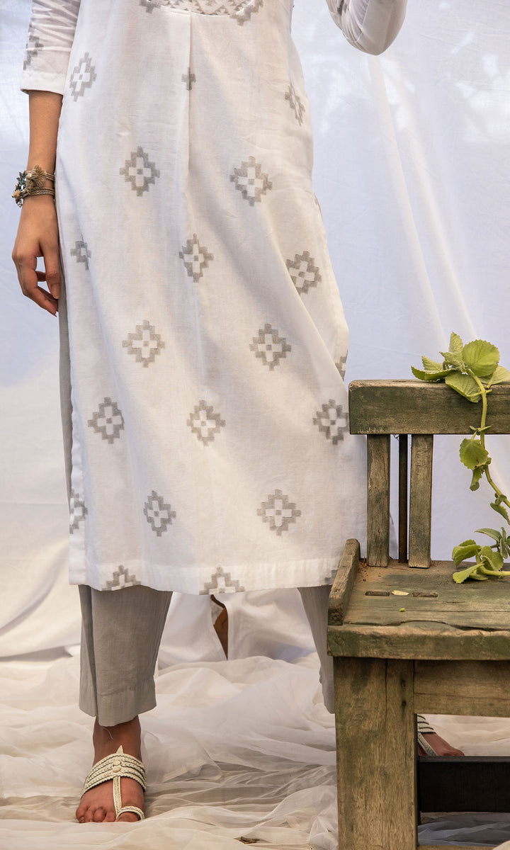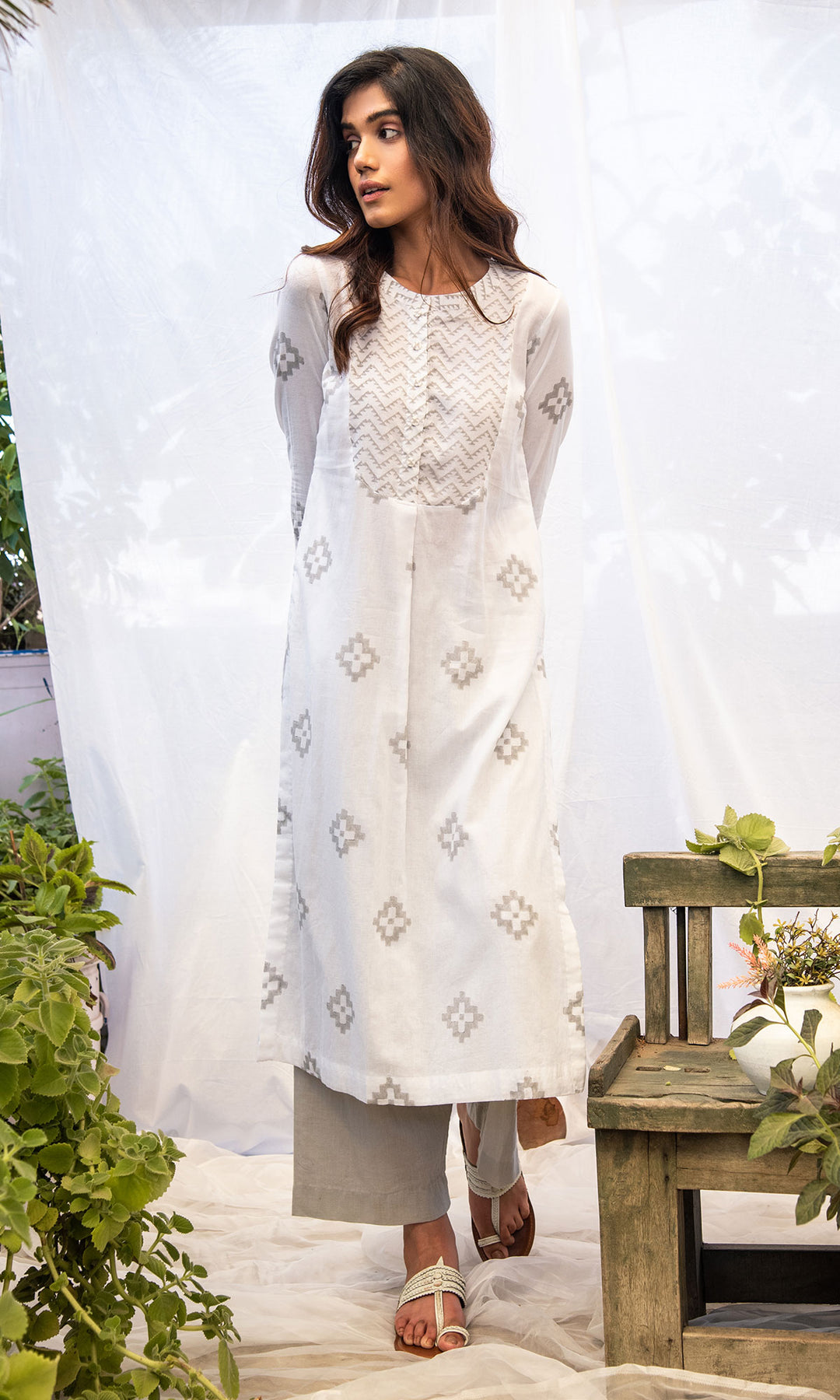 This two piece set includes kurta & Palazzo Ikat printed kurta with chevron printed yoke detailing with solid mulmul palazzo.