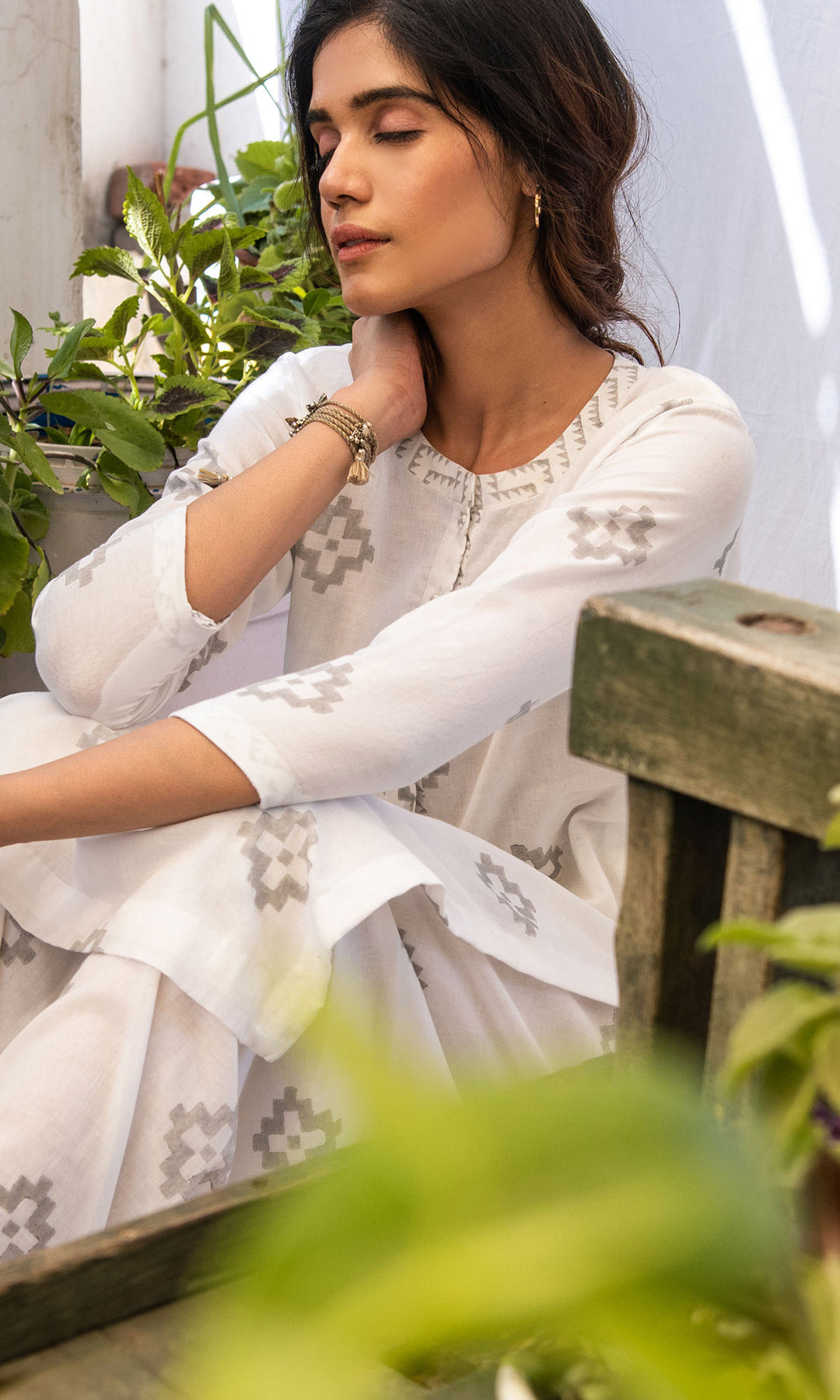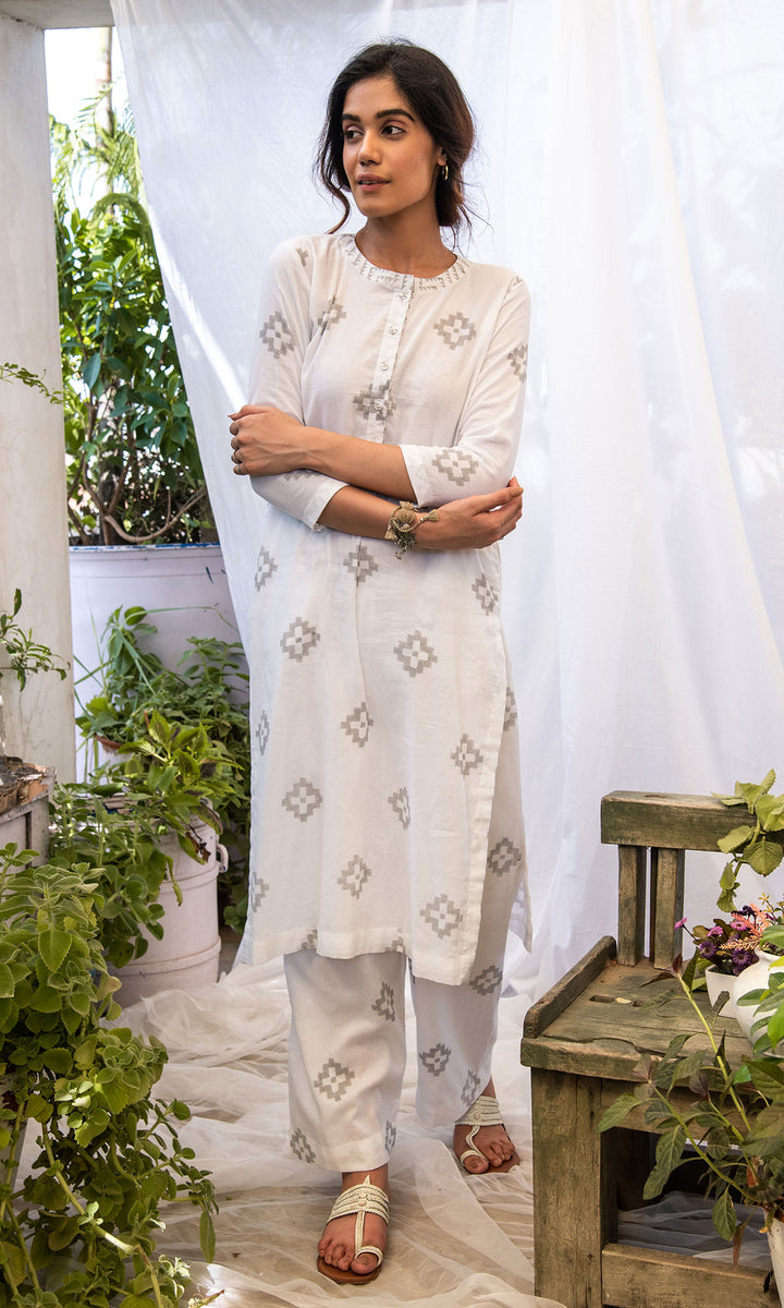This two piece set includes kurta & Palazzo Ikat printed straight kurta with ikat printed Mulmul Palazzo.