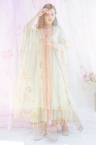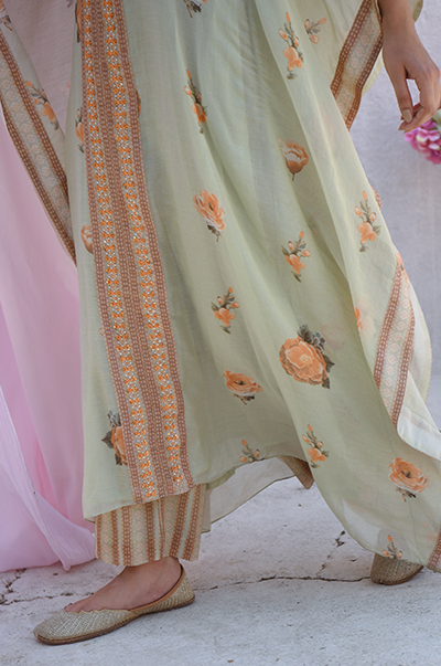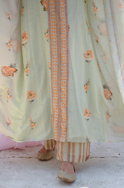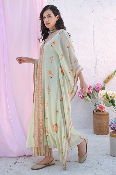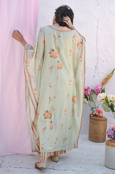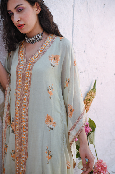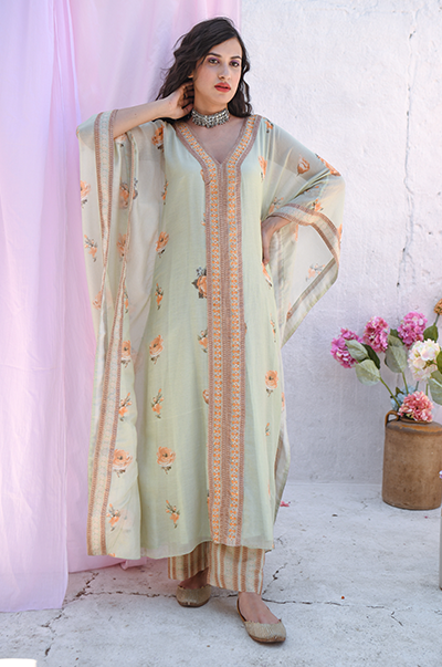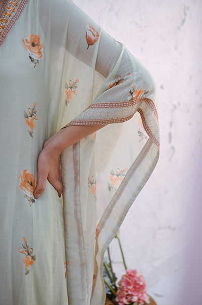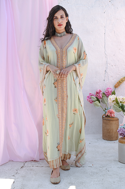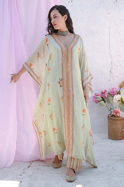 This two piece set includes Kaftan and palazzo Yellow Floral Digital printed Kaftan with front border hand embroidery detailing and printed palazzo.