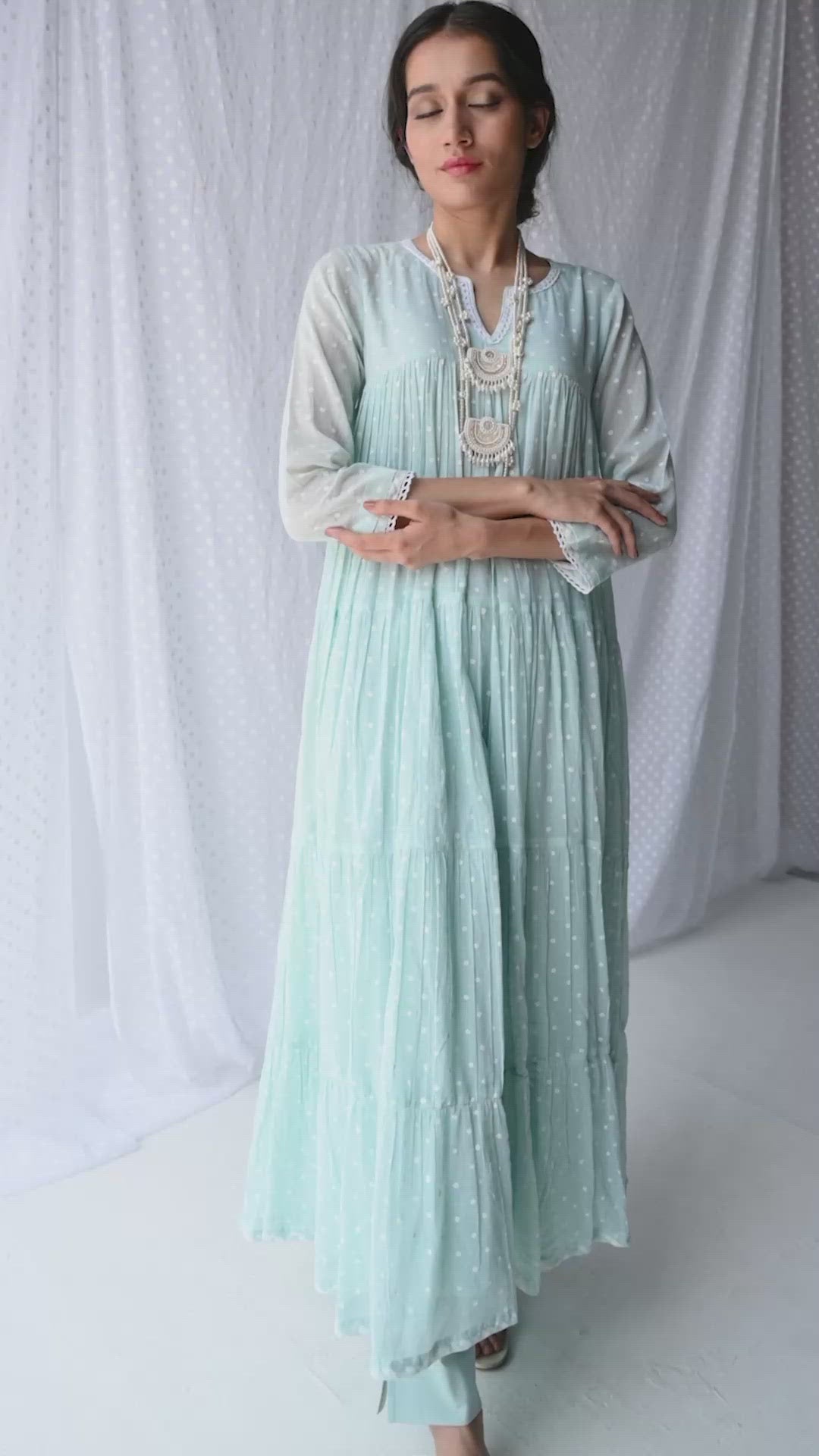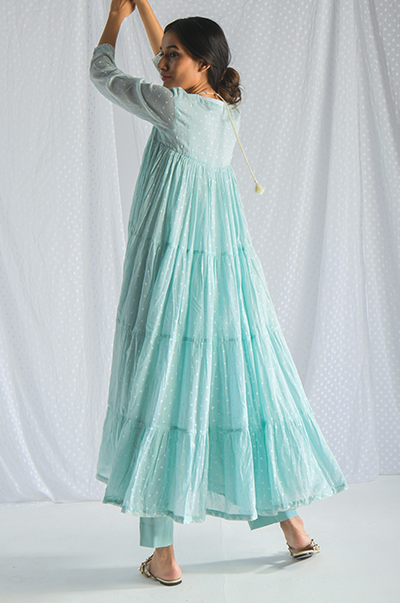 Mint Green dot printed gathered Anarkali with bue solid Pant with a side slit . Soft pink lehariya striped printed Dupatta finished with fringe lace.