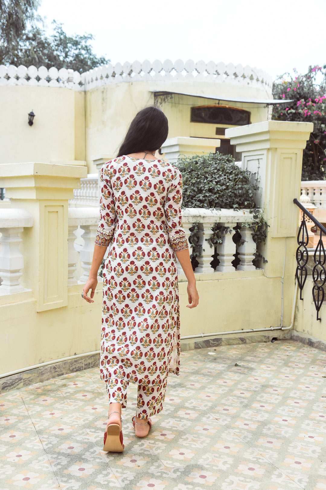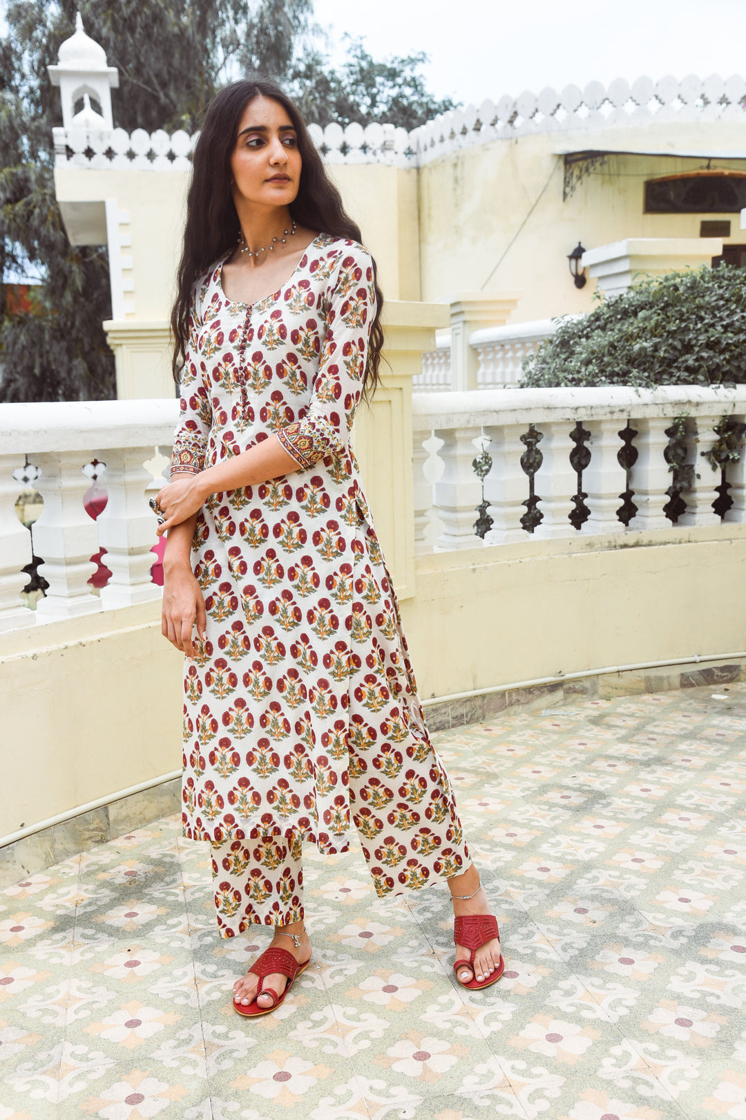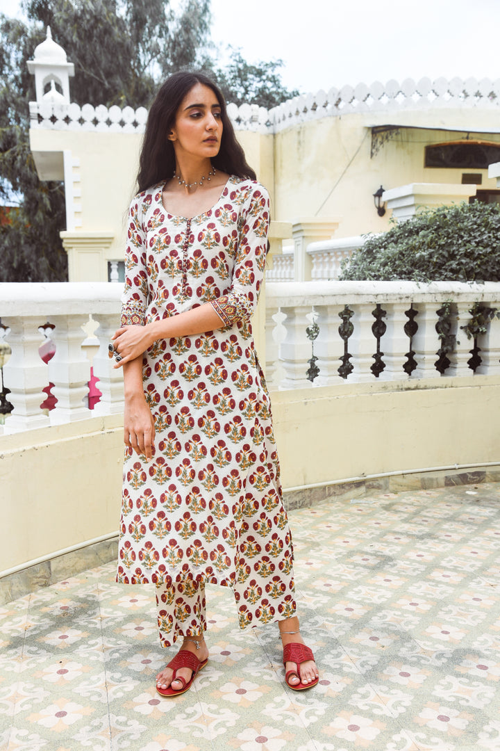 This two piece set includes Kurta, palazzo. Red Mughal block printed straight kurta with printed palazzo.