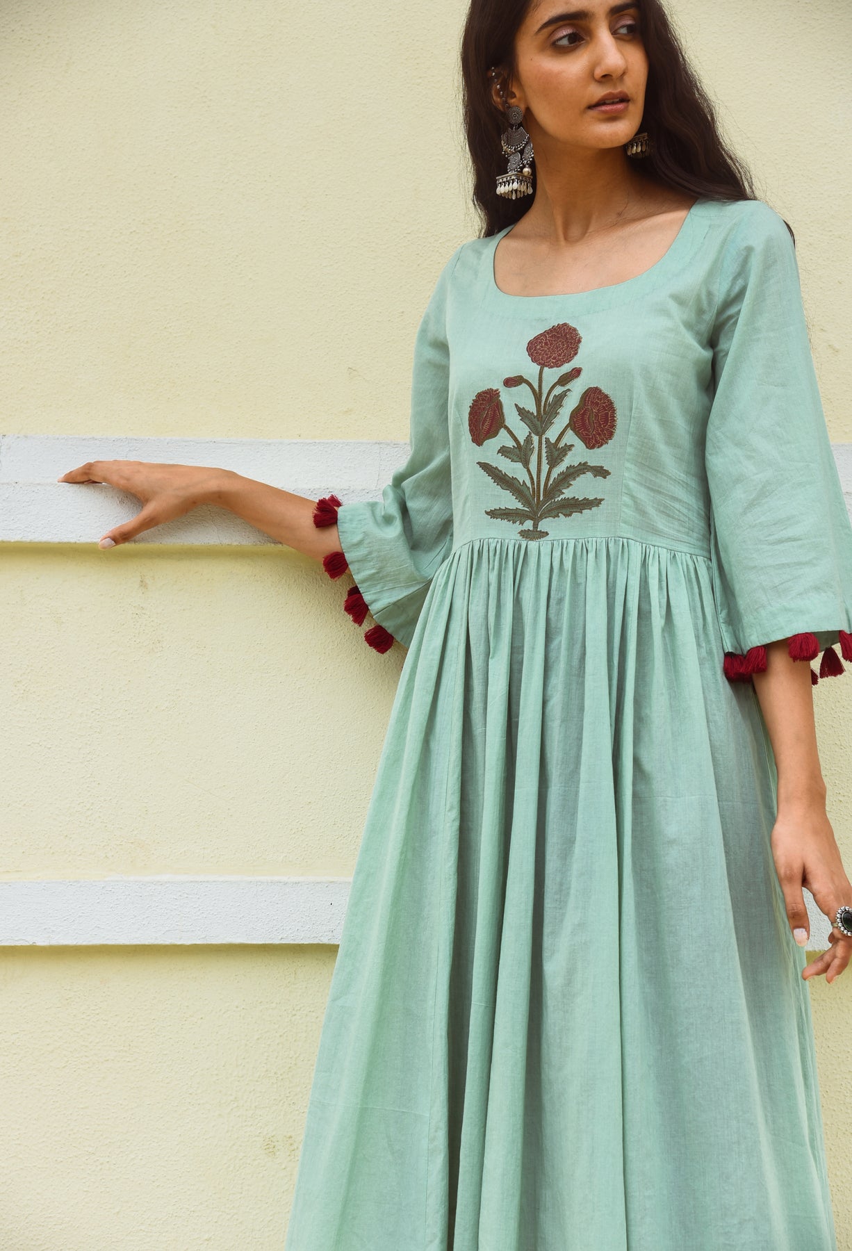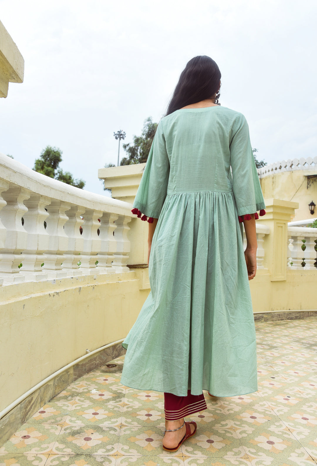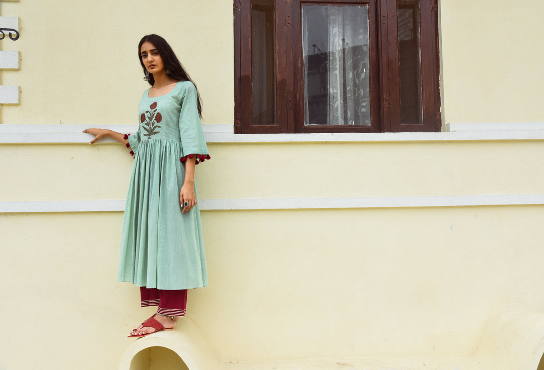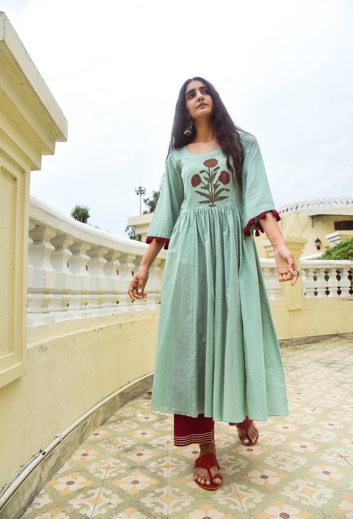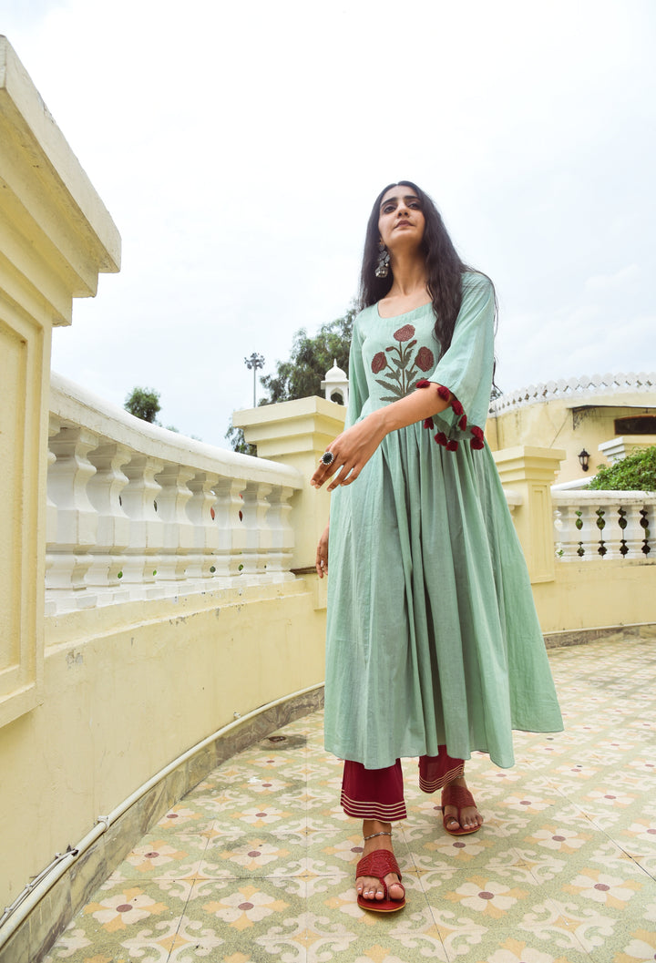 This two piece set includes Anarkali Kurta, Palazzo. Sage Green mughal yoke printed Anarkali kurta and Red palazzo.