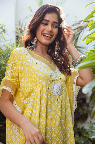 This two piece set includes kaftan and palazzo Lemon Yellow block printed kaftan with lace and mirror work and tassel detailing. Lemon Yellow palazzo with organza facing.