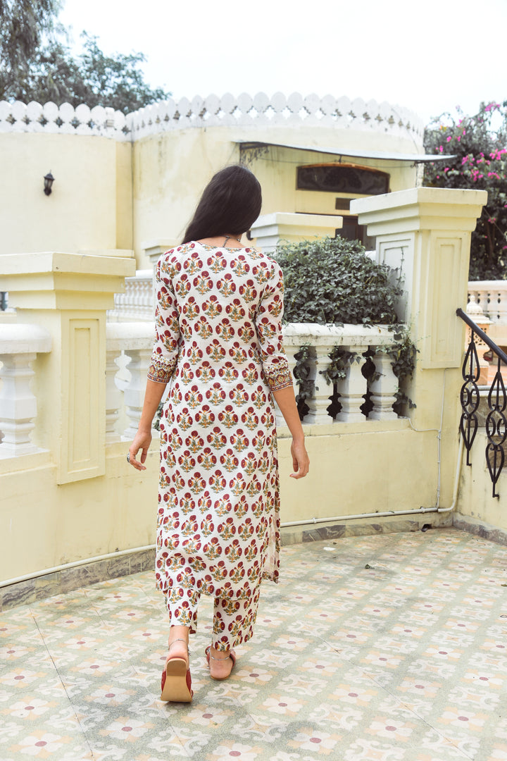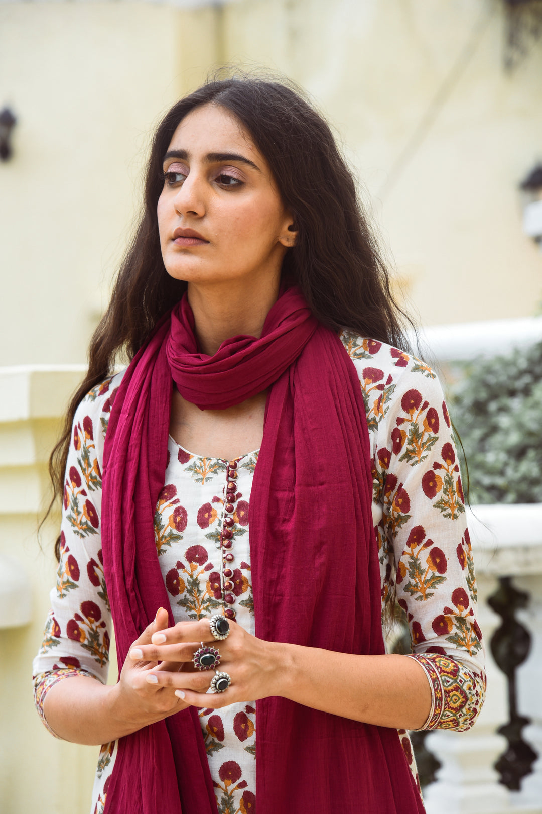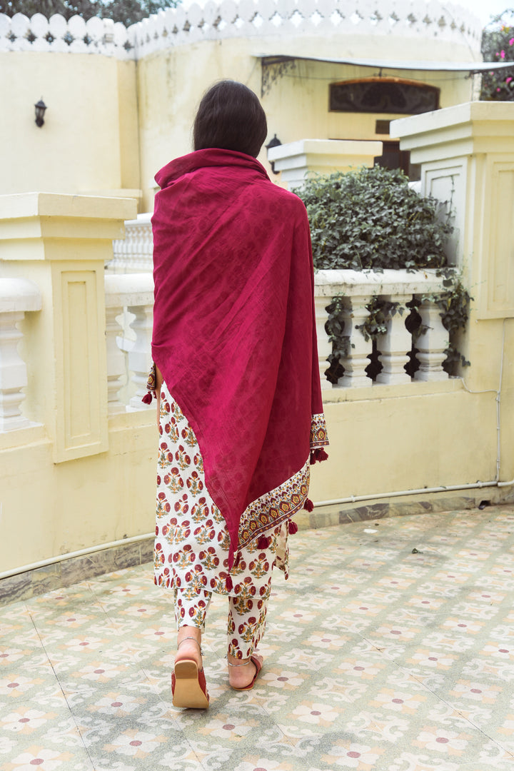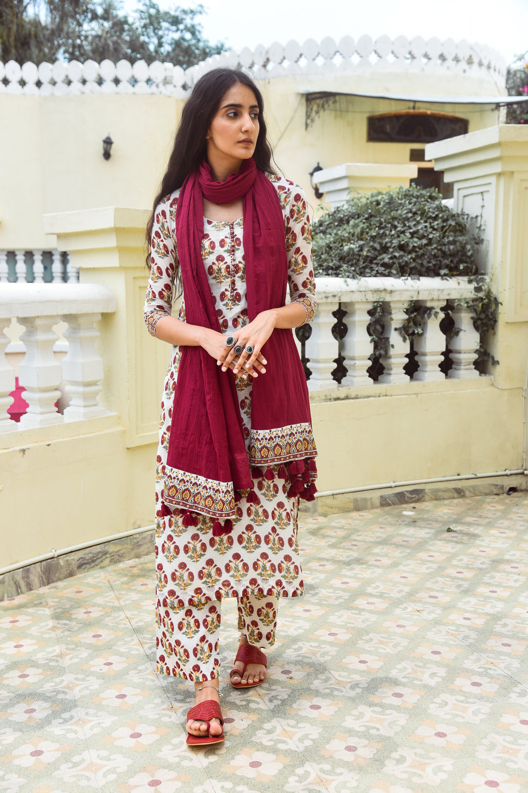 This three piece set includes Kurta, palazzo and dupatta. Red Mughal block printed straight kurta with printed palazzo and blue solid dupatta with printed border and tassel detailing.