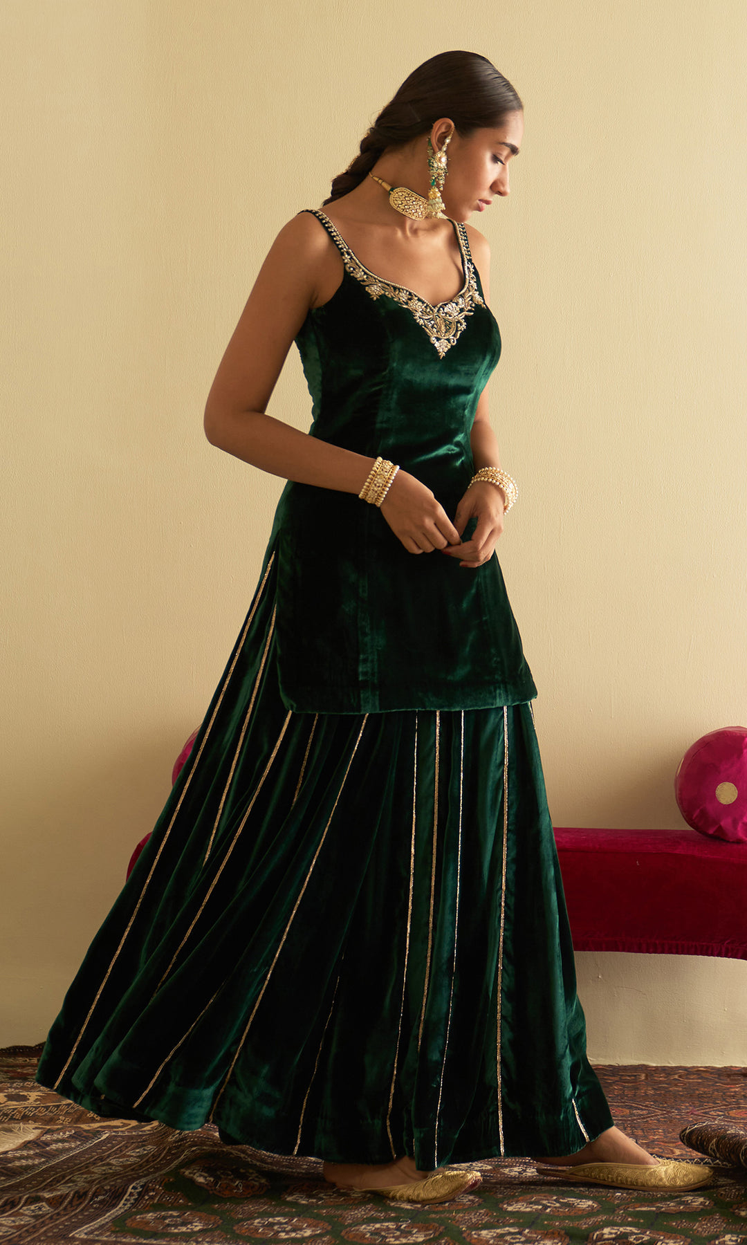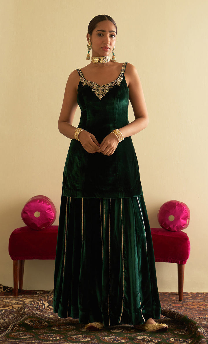 Sufiya Green Velvet Embroidered Short Sleeveless kurta with sharara and shawl(set of 3)