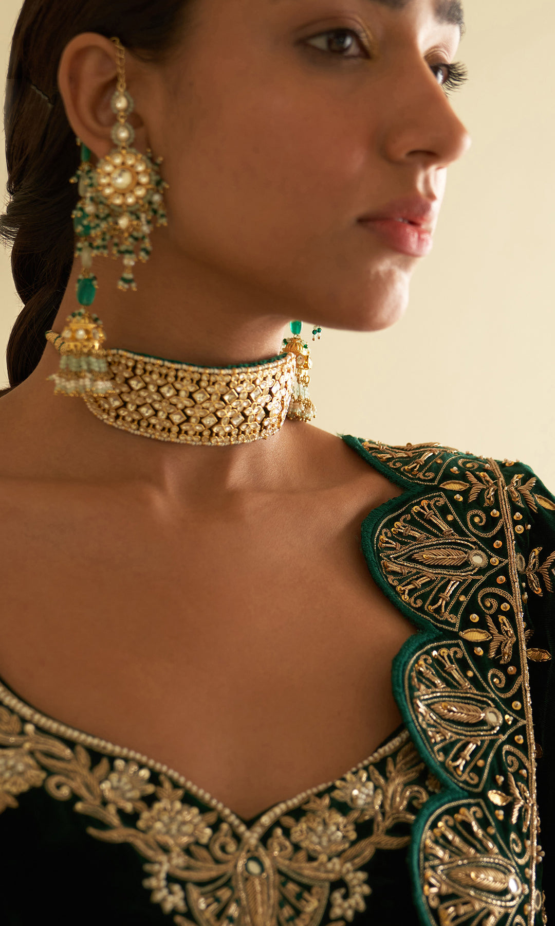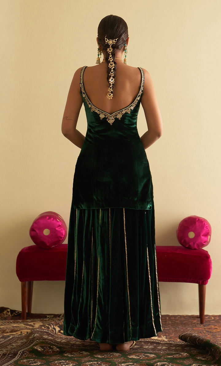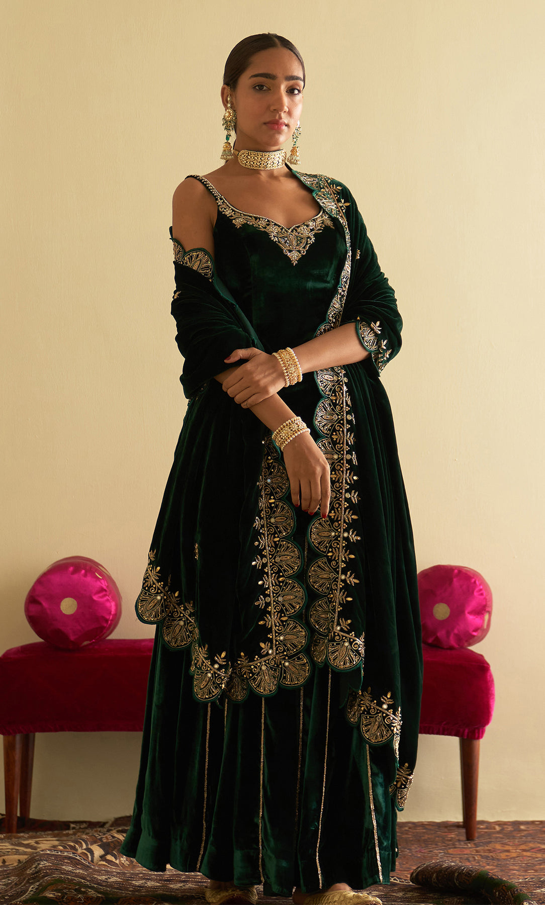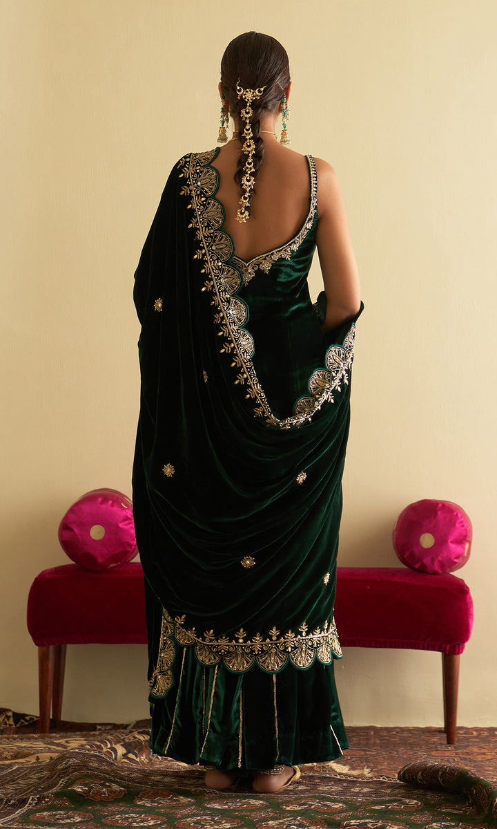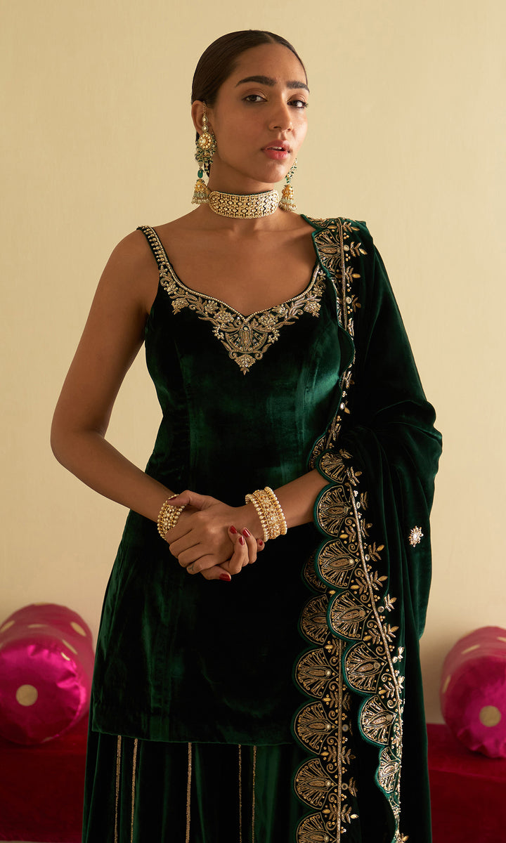 Sufiya Green Velvet Embroidered  Short Sleeveless kurta with sharara and shawl(set of 3)
