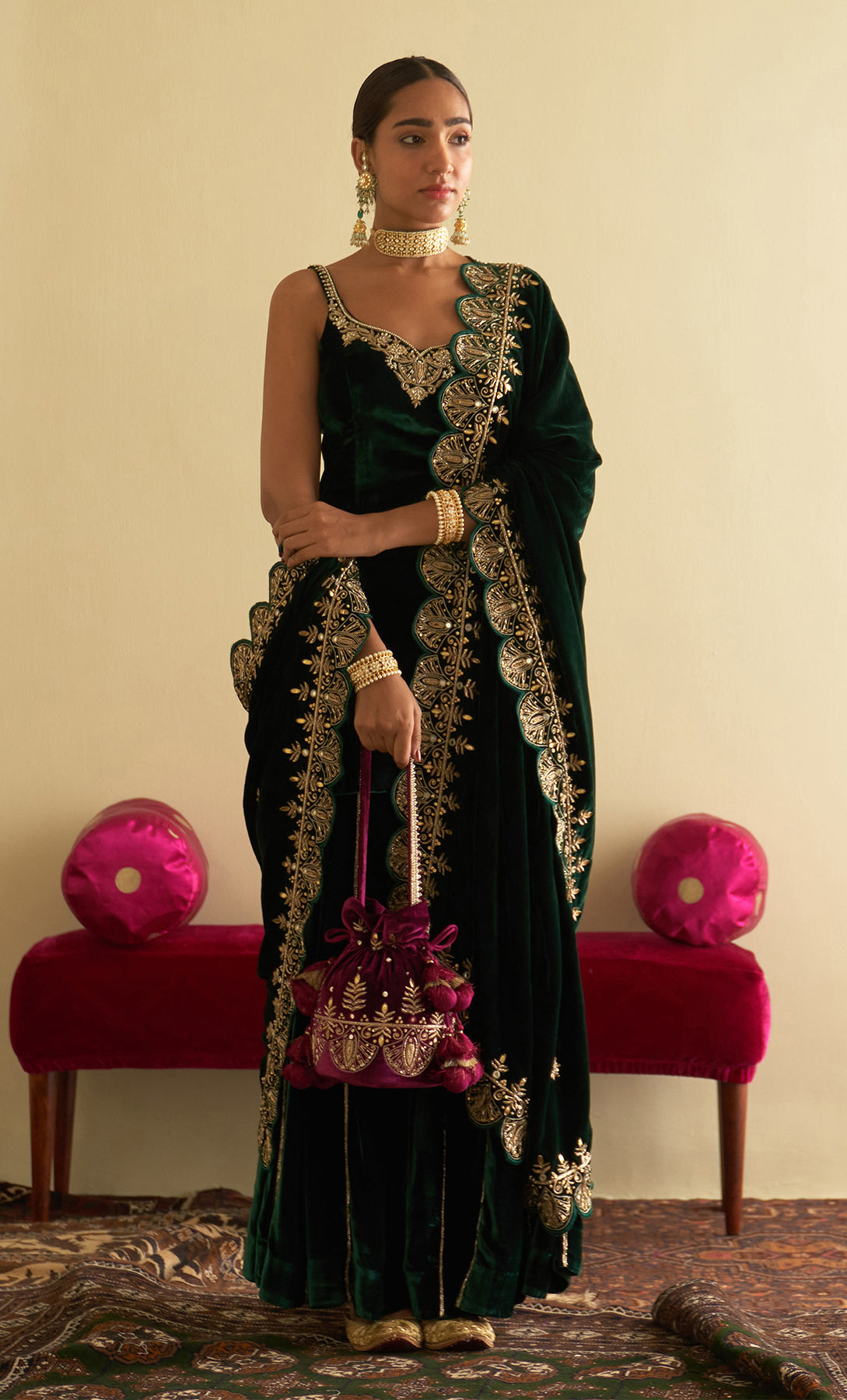 This set includes sleeveless Kurta , sharara and velvet scalloped shawl . Kurta and sharara are embellished with sequins , zari and gota embroidery. It comes with embroidered shawl .