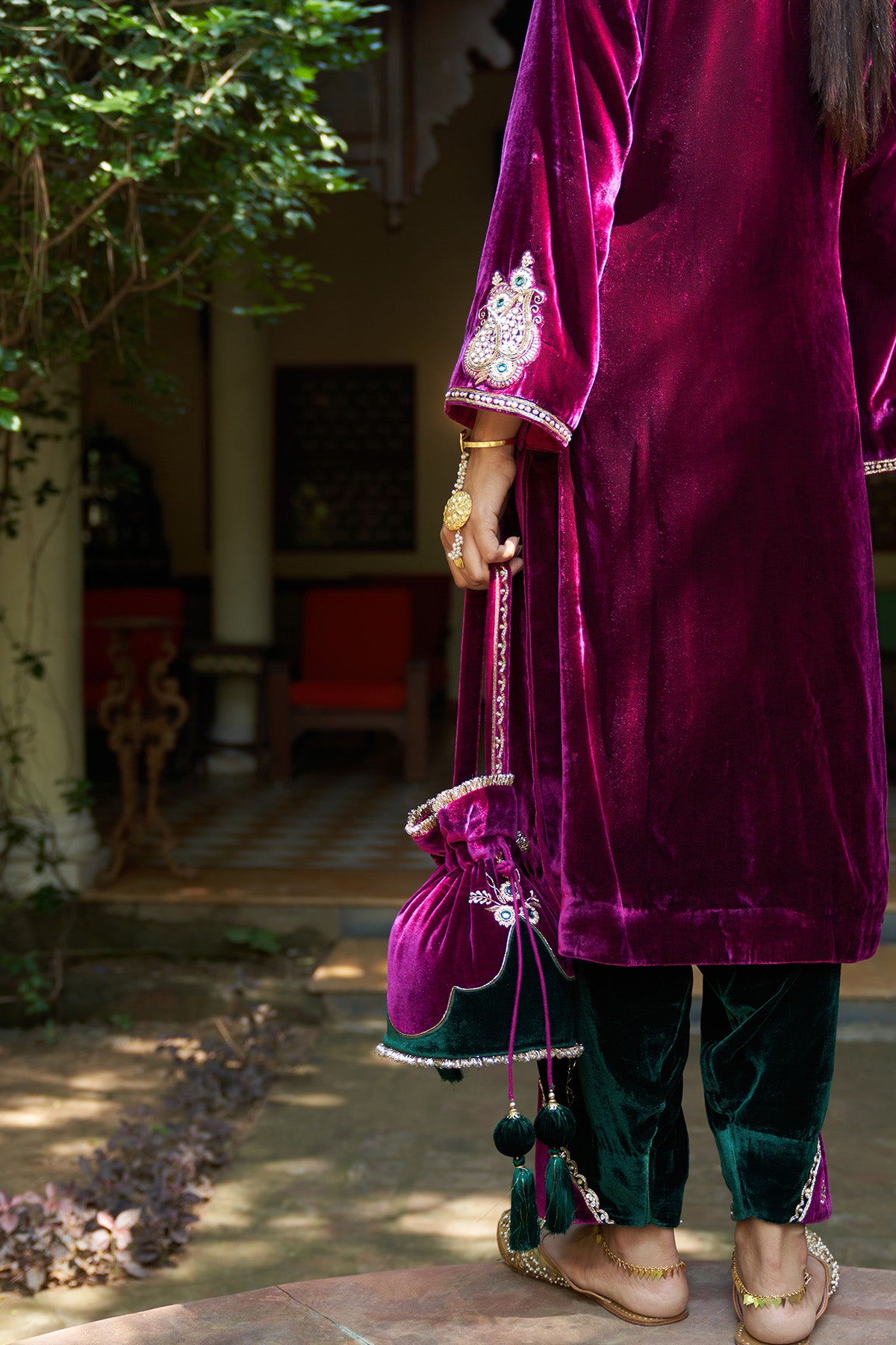 Zooni velvet Deep orchid embroidered kurta with patchwork salwar ( set of 2)