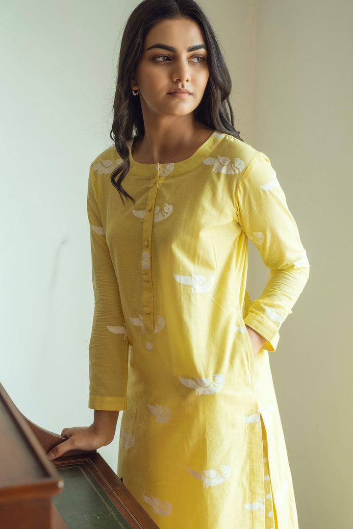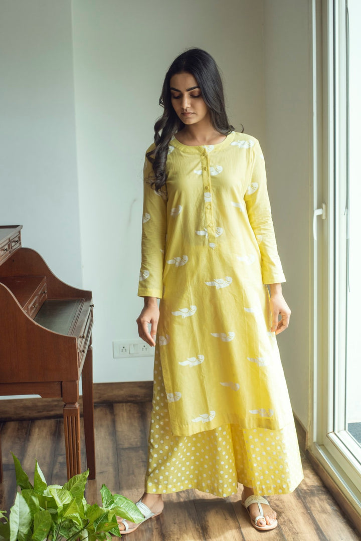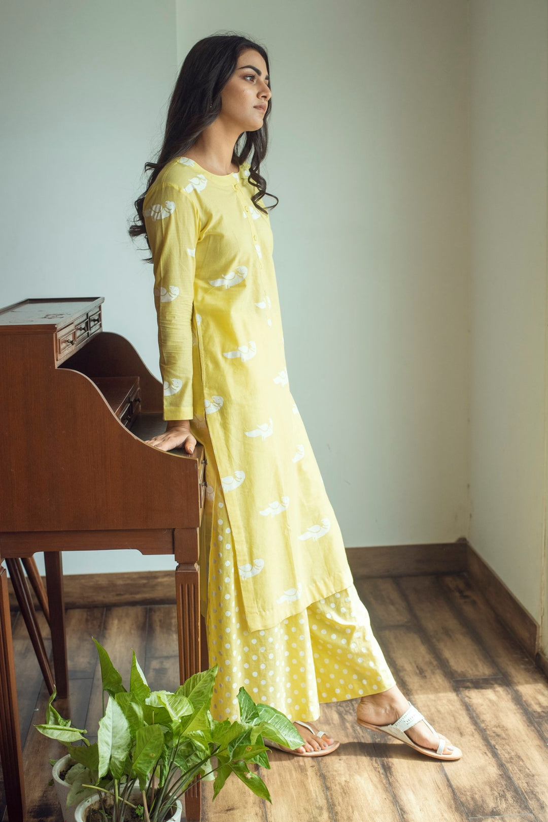 This is a set of 2 which includes Block printed kurta and block printed palazzo. Kurta has pockets.