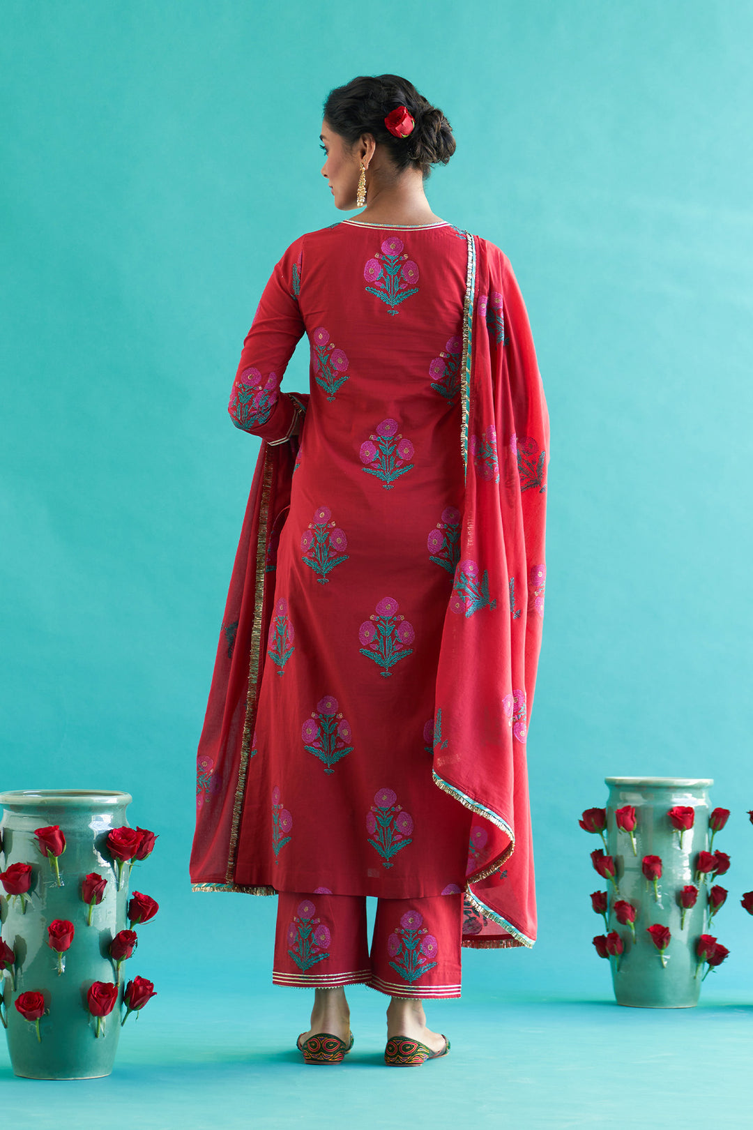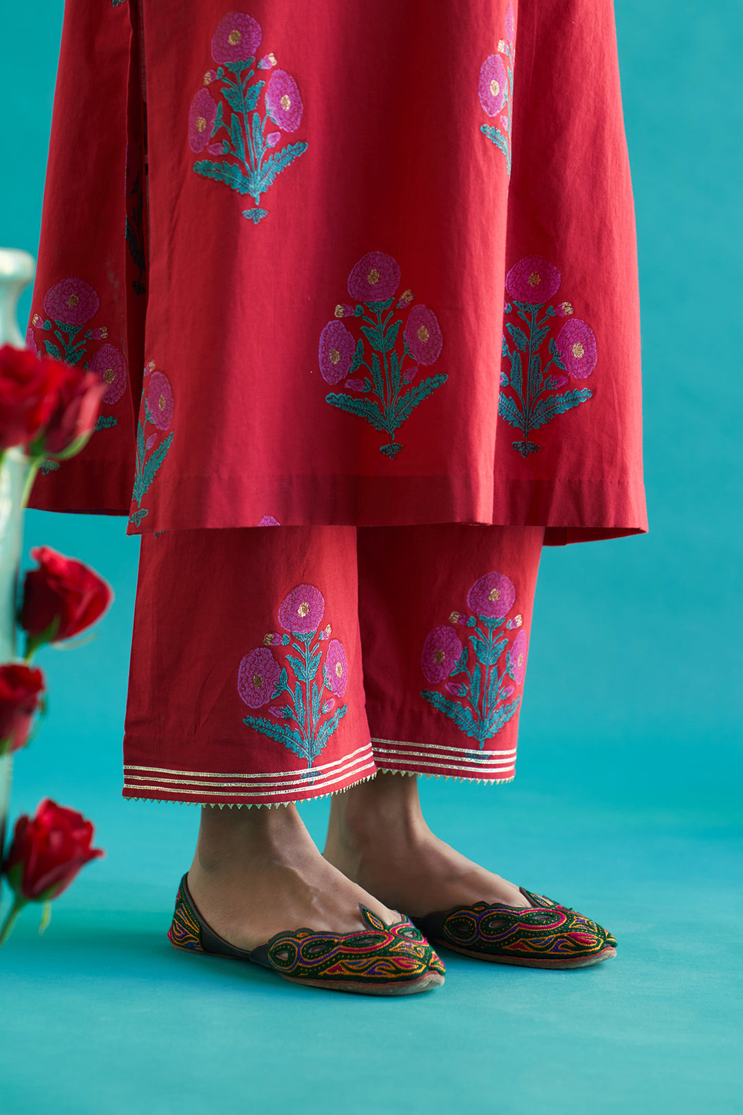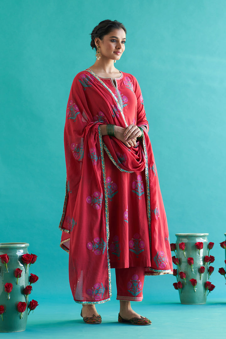 This set include block printed straight kurta with palazzo and dupatta. Kurta and palazzo is detailed with gota pinig and gota lines. Dupatta is detailed with gota piping and fringe lace.