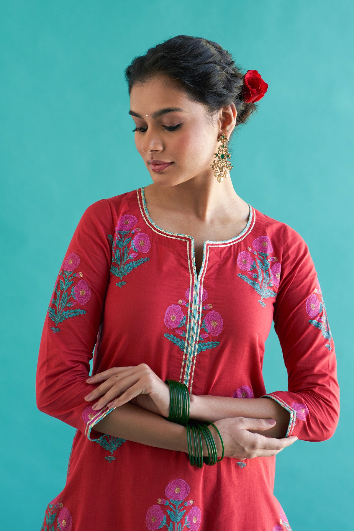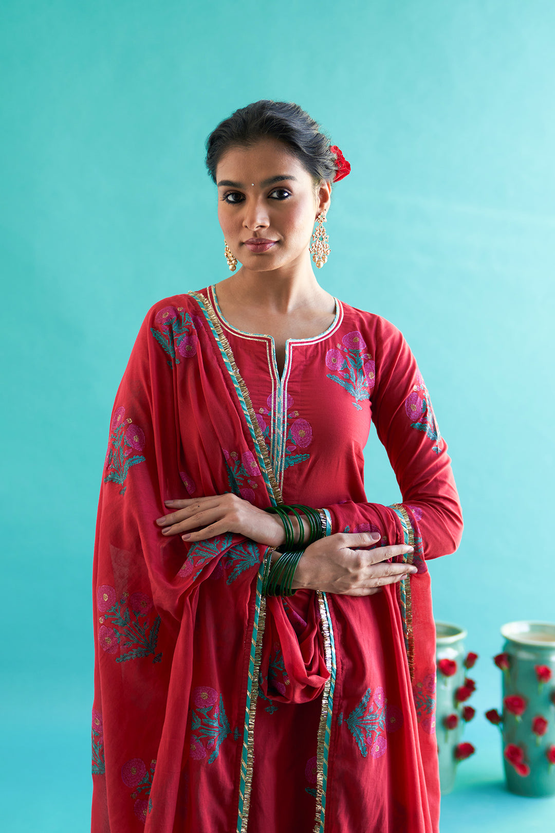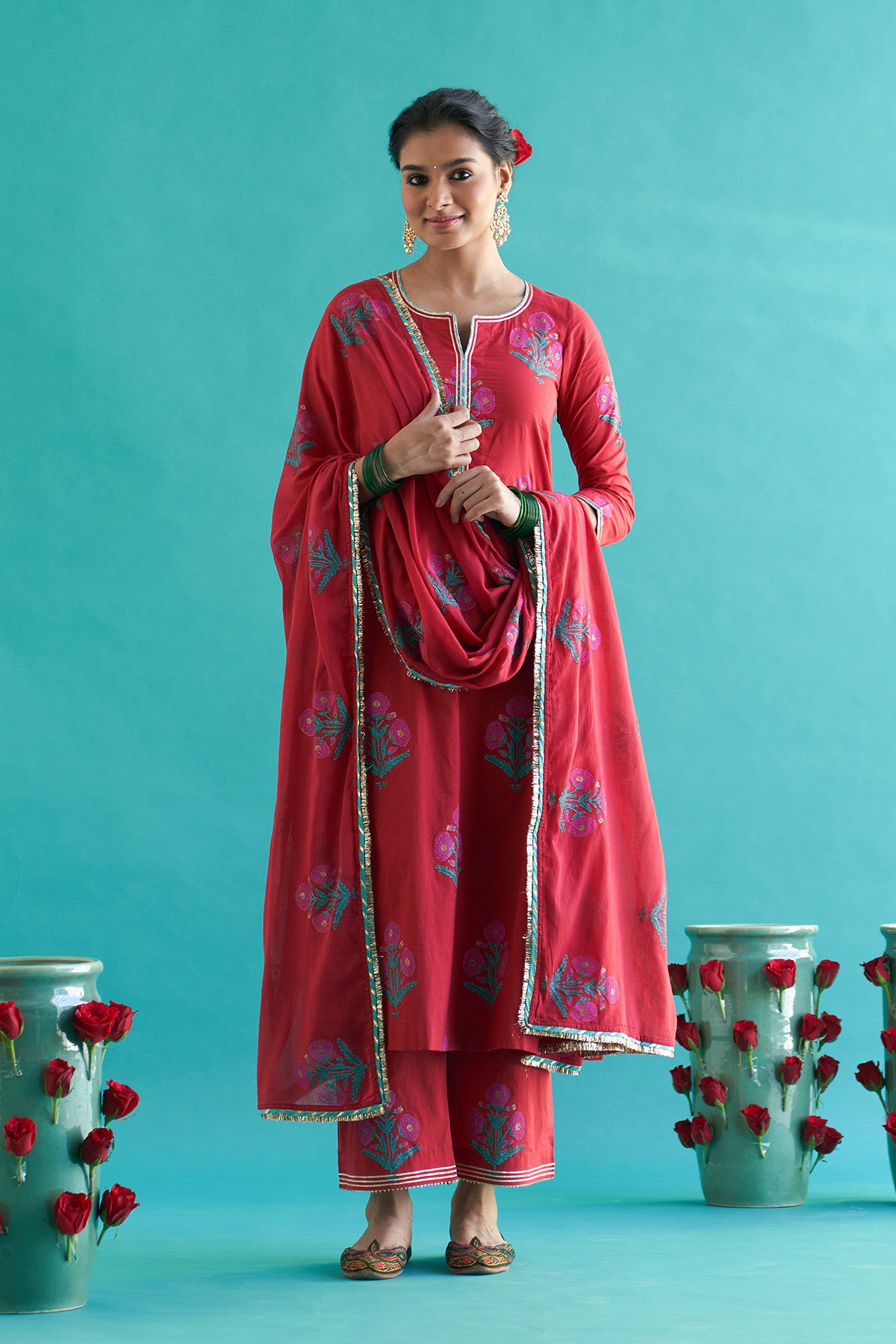 This set include block printed straight kurta with palazzo and dupatta. Kurta and palazzo is detailed with gota pinig and gota lines. Dupatta is detailed with gota piping and fringe lace.