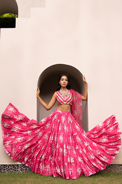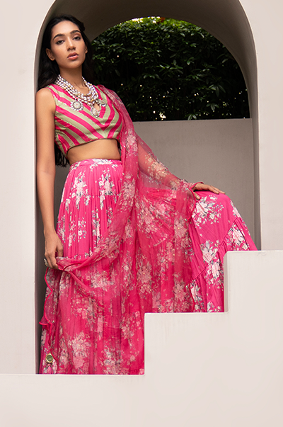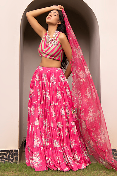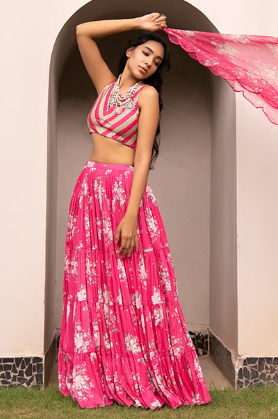 Rani pink and green Stripe sleeveless Blouse with delicate sequins detailing. Rani Pink Floral Print Lehenga and Floral print Organza dupatta finished with sequins and tassel detailing.