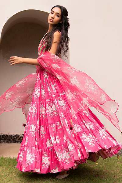 Amitha Sharma in Falak Rani Pink Floral print Gathered Lehenga with stripe blouse and Dupatta- Set of 3