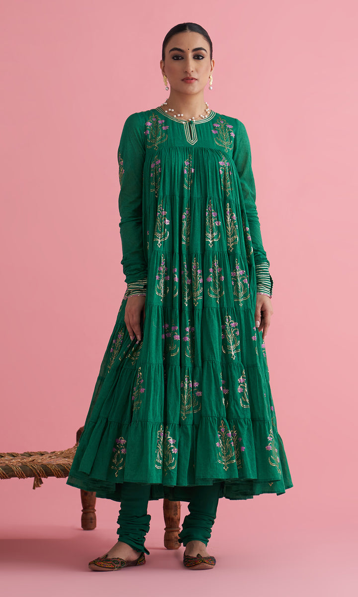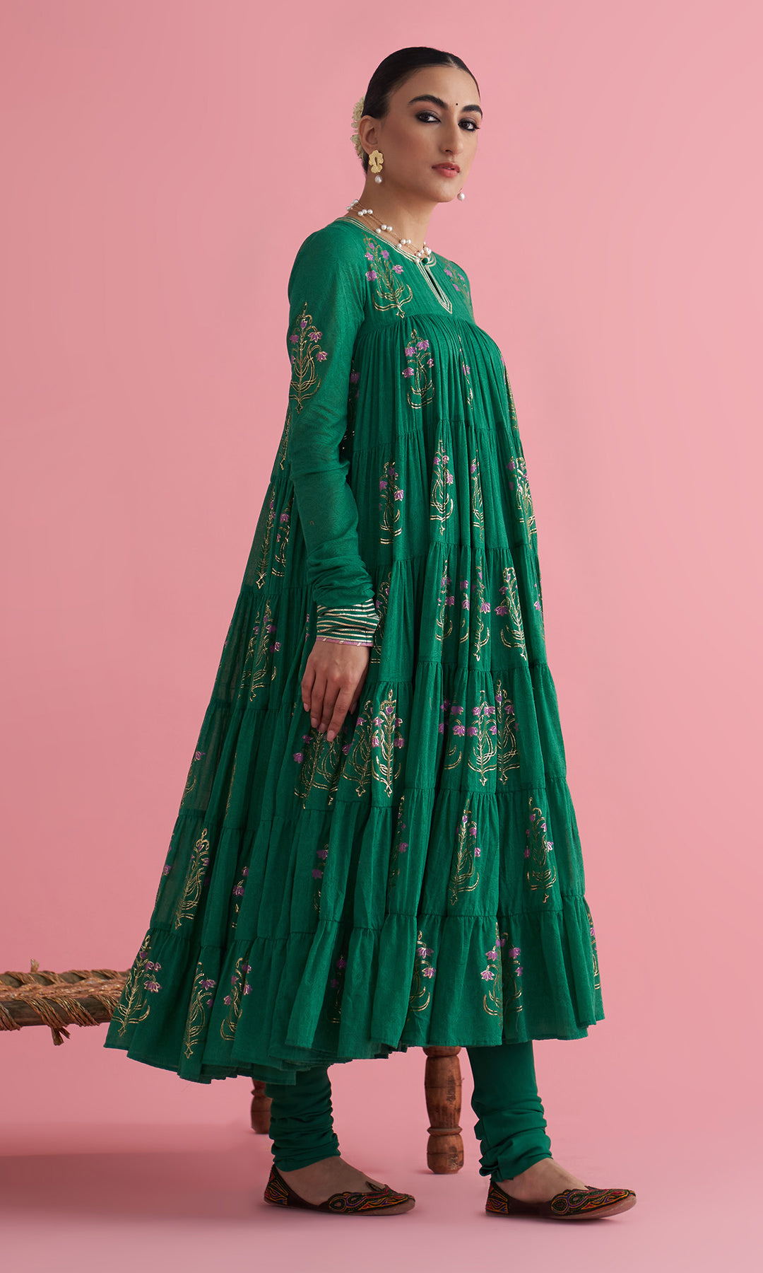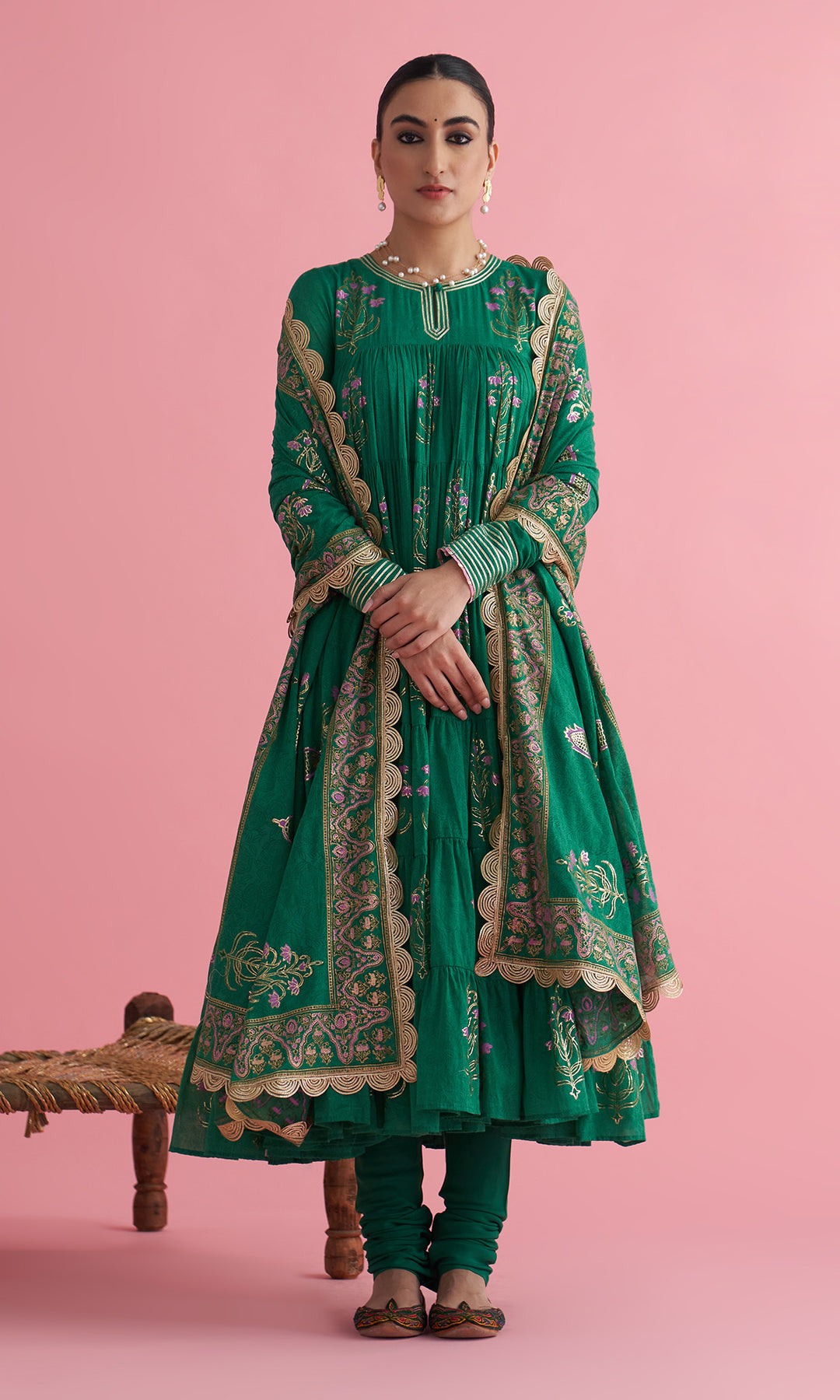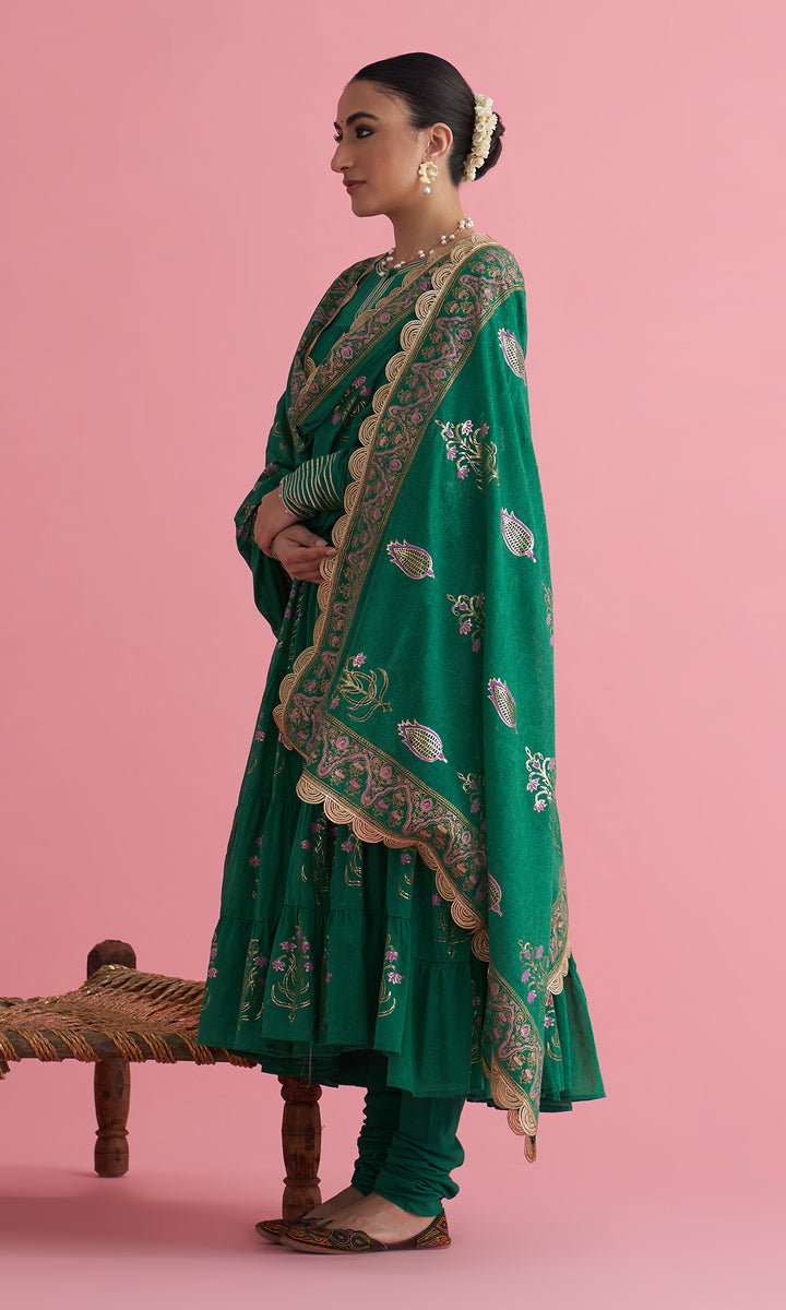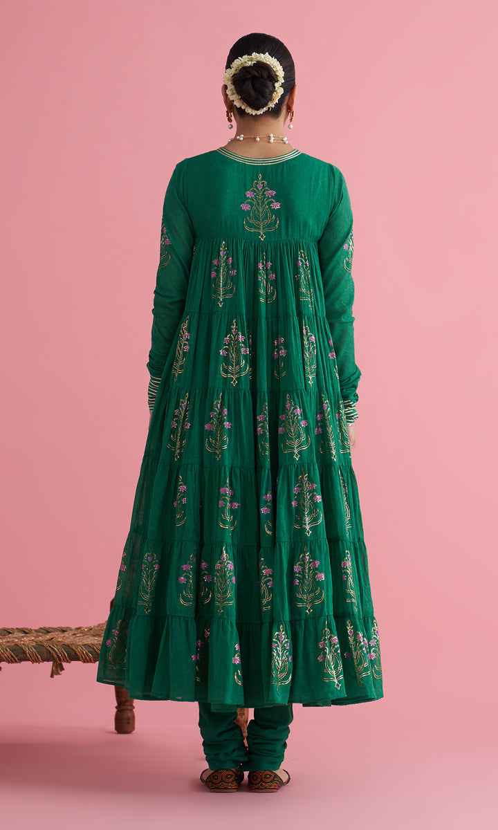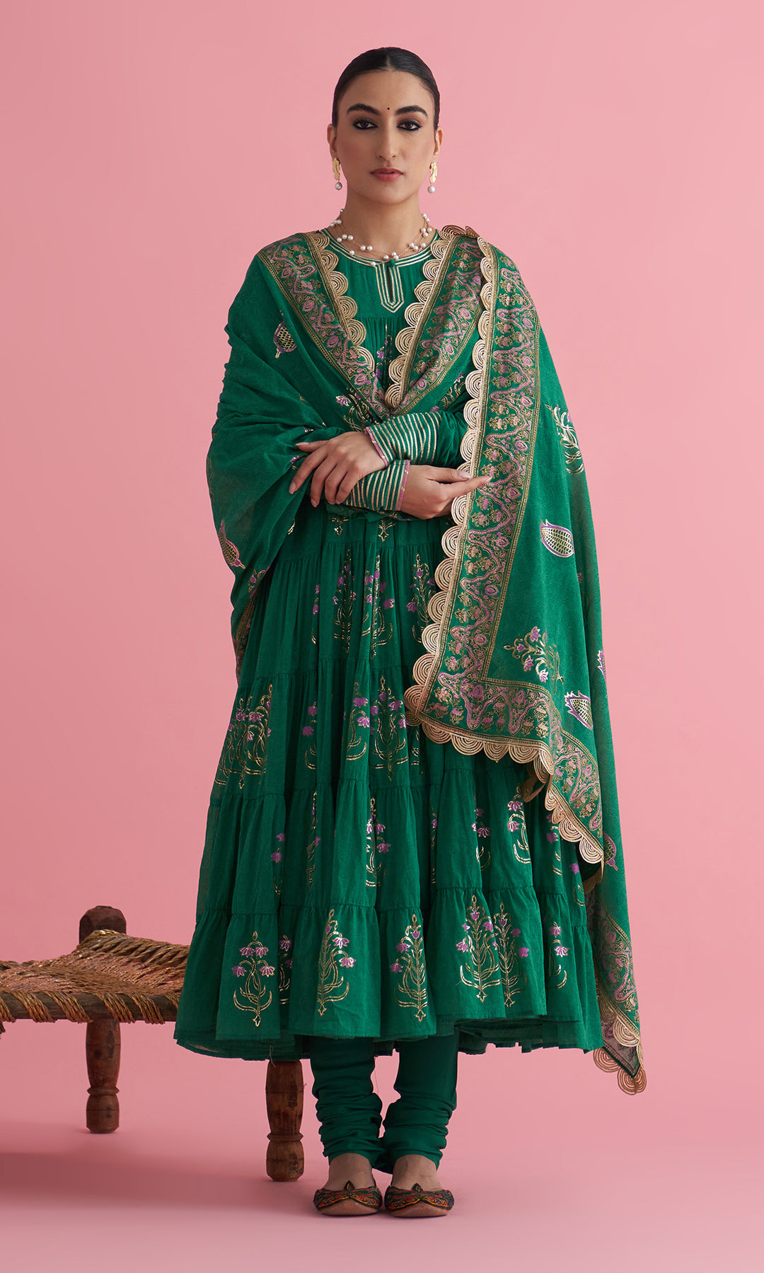 Apala Green Foil Print Boota Tiered Anarkali with Chooridar and Dupatta (set of 3)