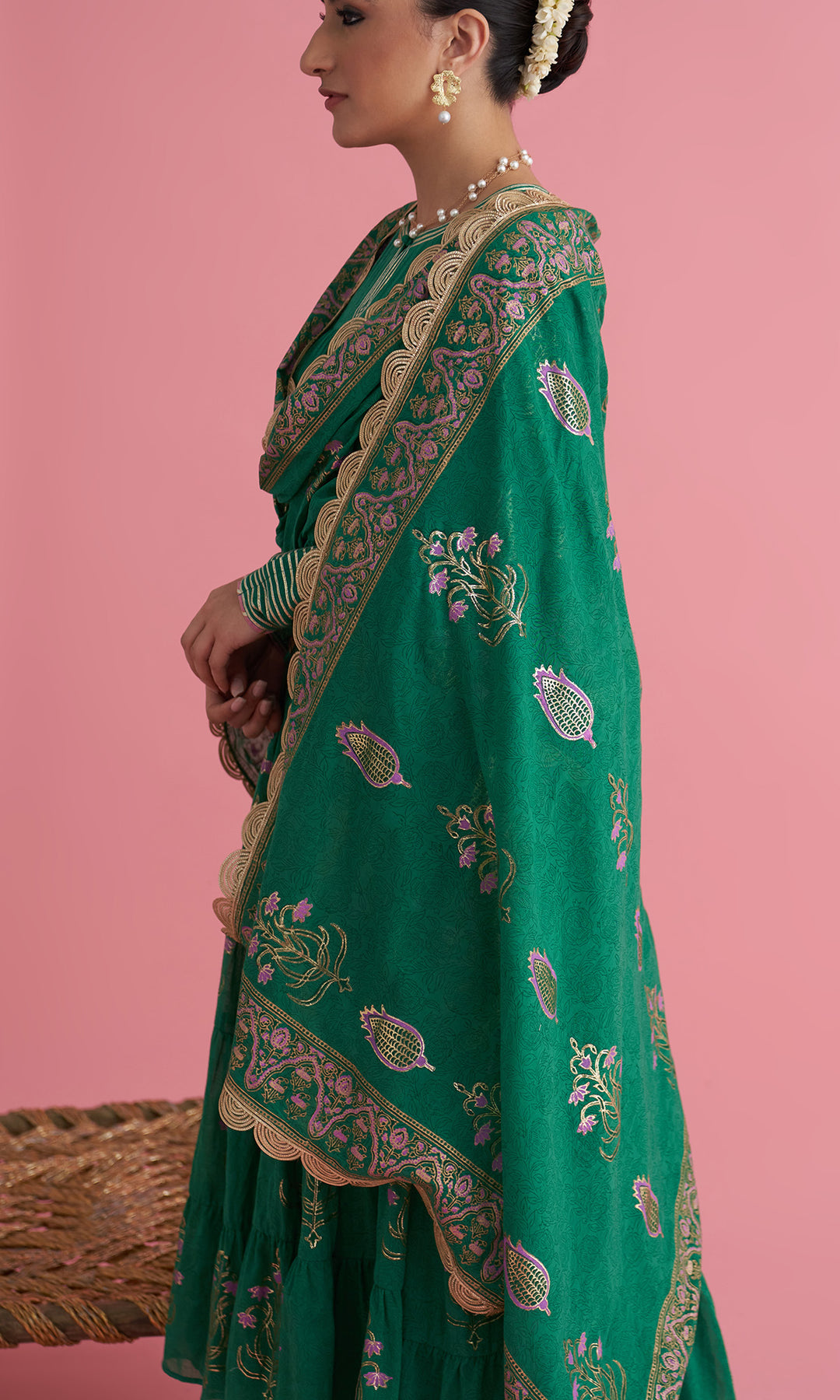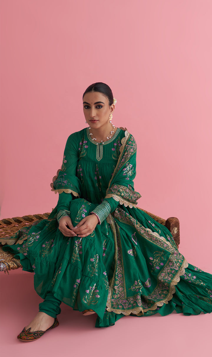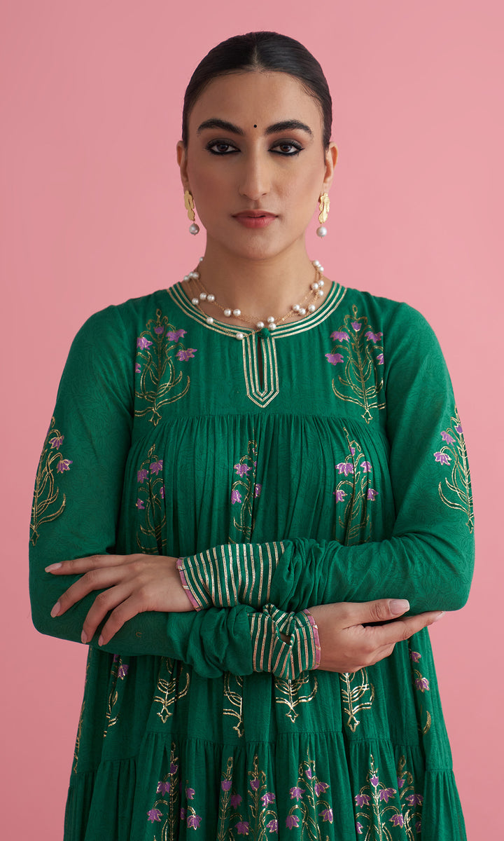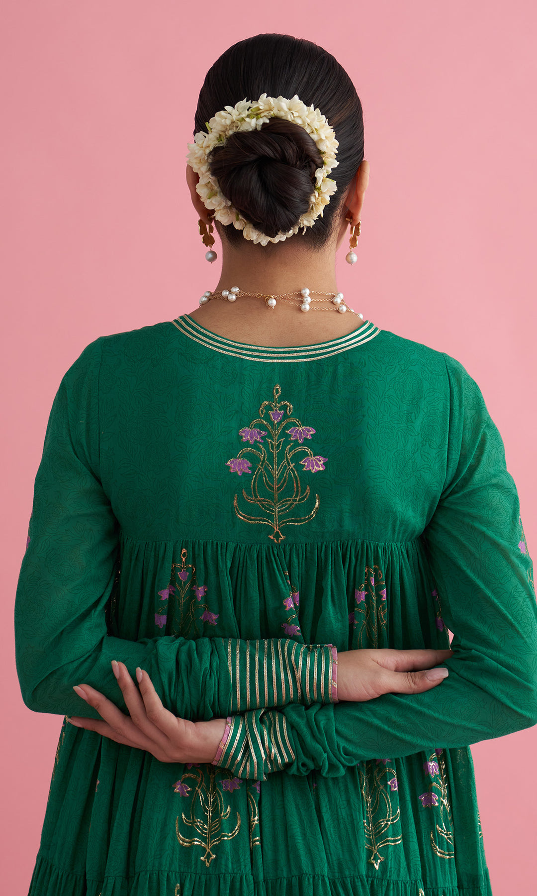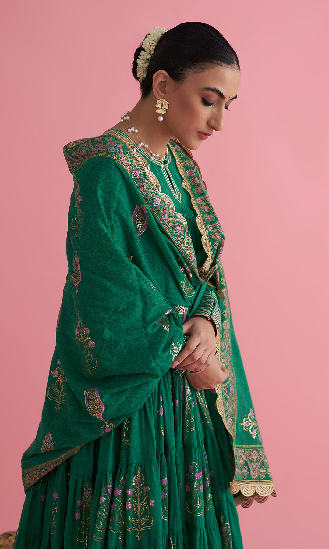 Apala Green Foil Print Boota Tiered Anarkali with Chooridar and Dupatta (set of 3)