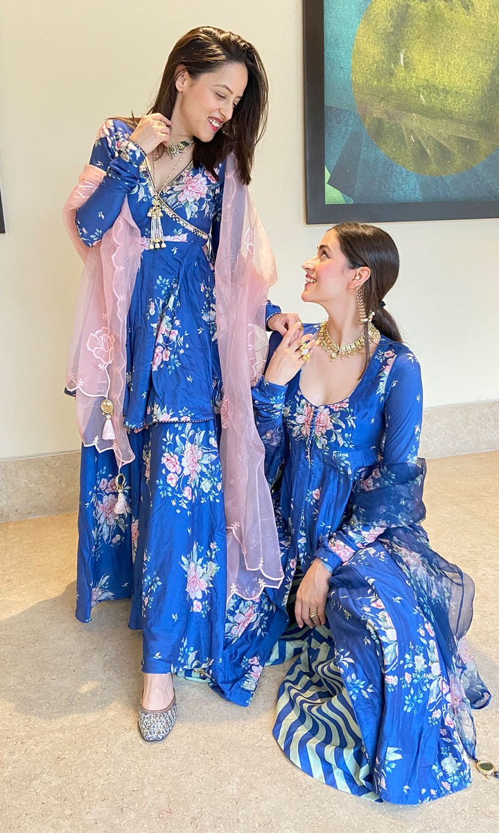 Arisha Sharma in Falak Blue Front Open Floral Anarkali with Palazzo and Dupatta- Set of 3