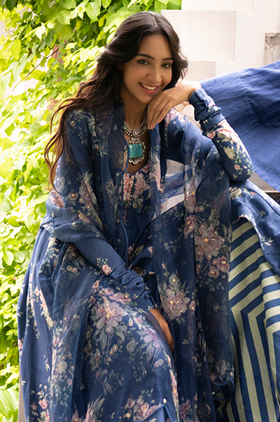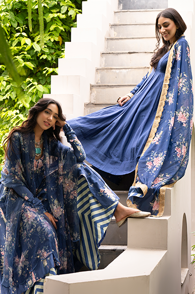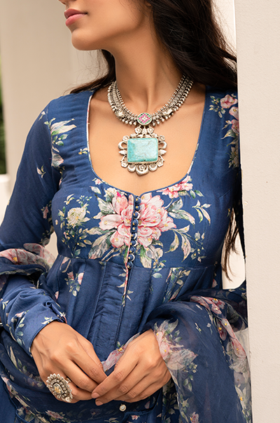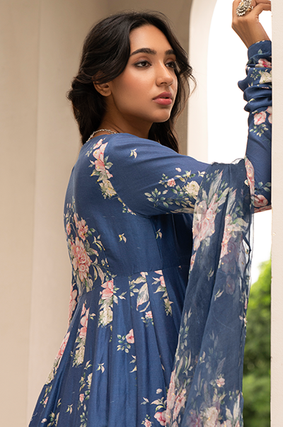 Blue Front open floral print Anarkali with delicate sequins and luppi buttons detailings. Kali Flared Palazzo and floral Print organza dupatta finished with sequins and tassel detailing.