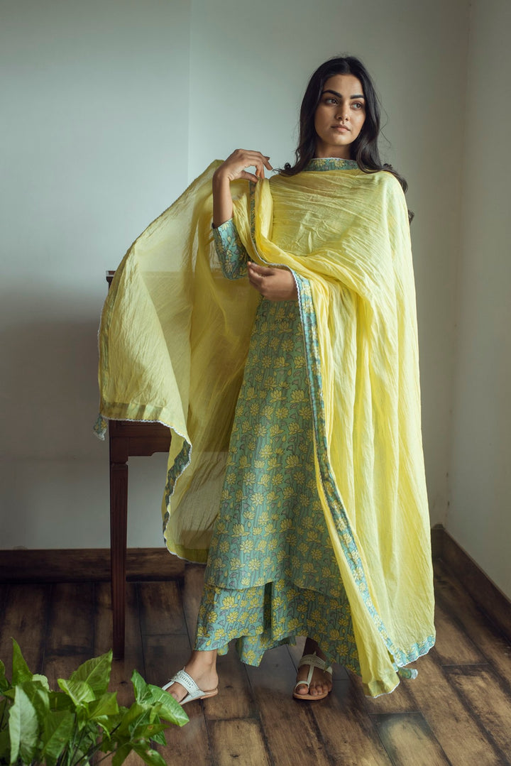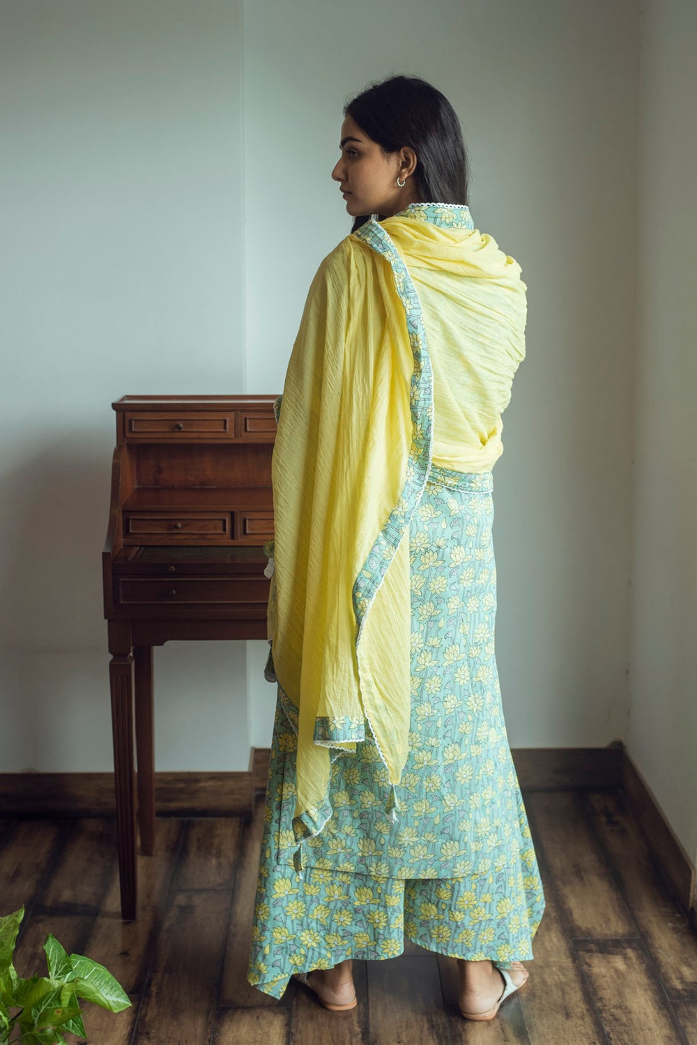 Block printed kurta with asymmetric palazzo set of 3. Kurta has pockets