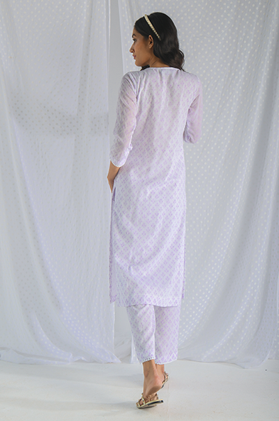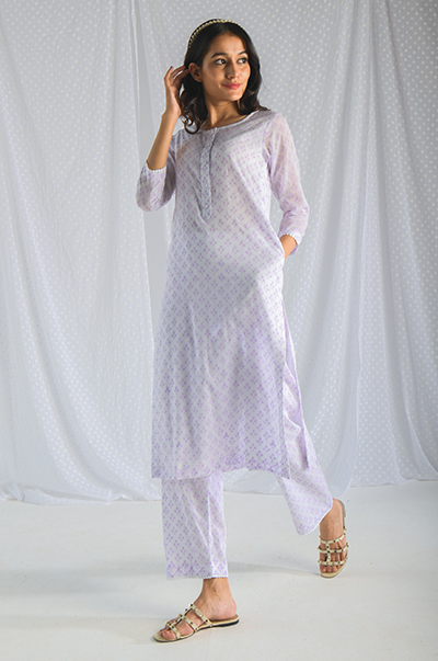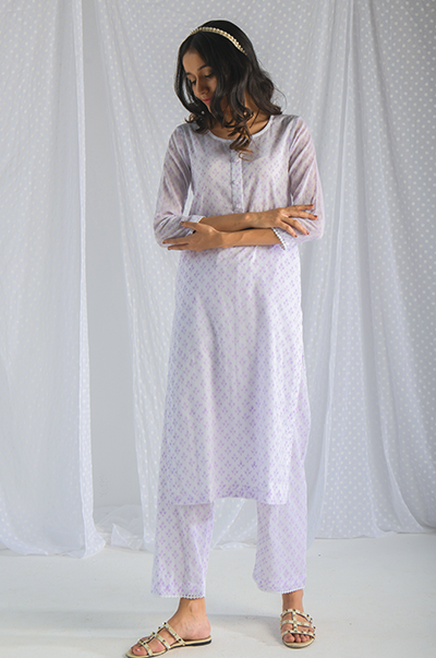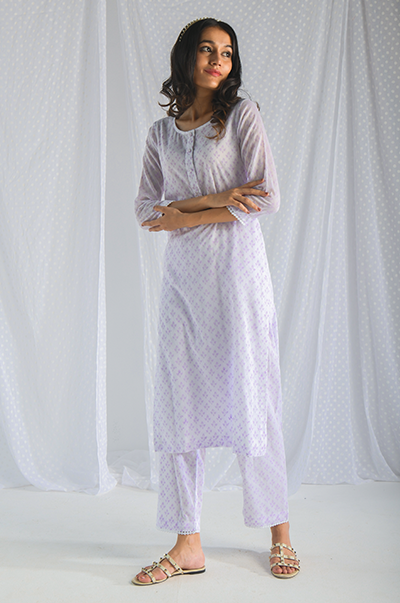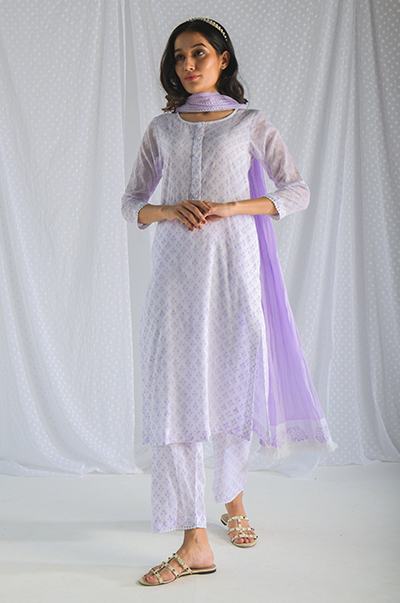 White with lilac floral buti printed Kurta and Pant. Lilac Dupatta with elephant printed border finished with fringe lace.