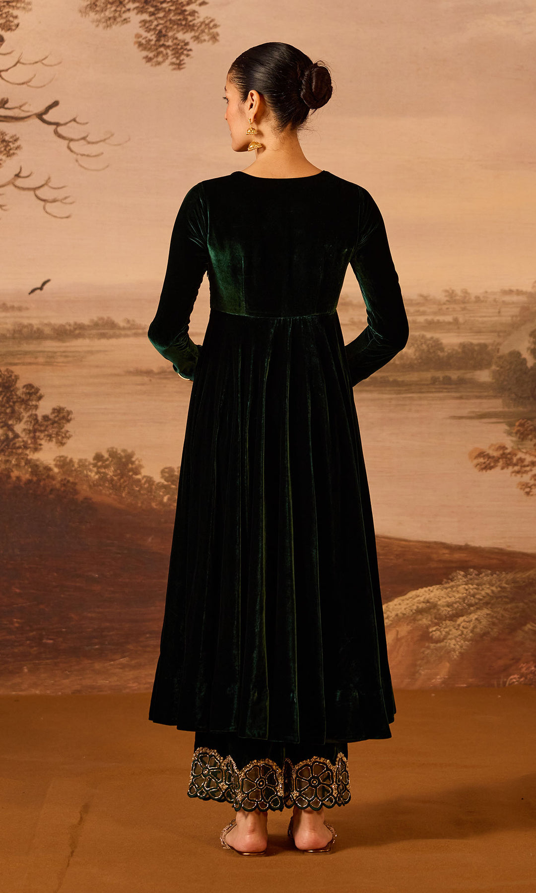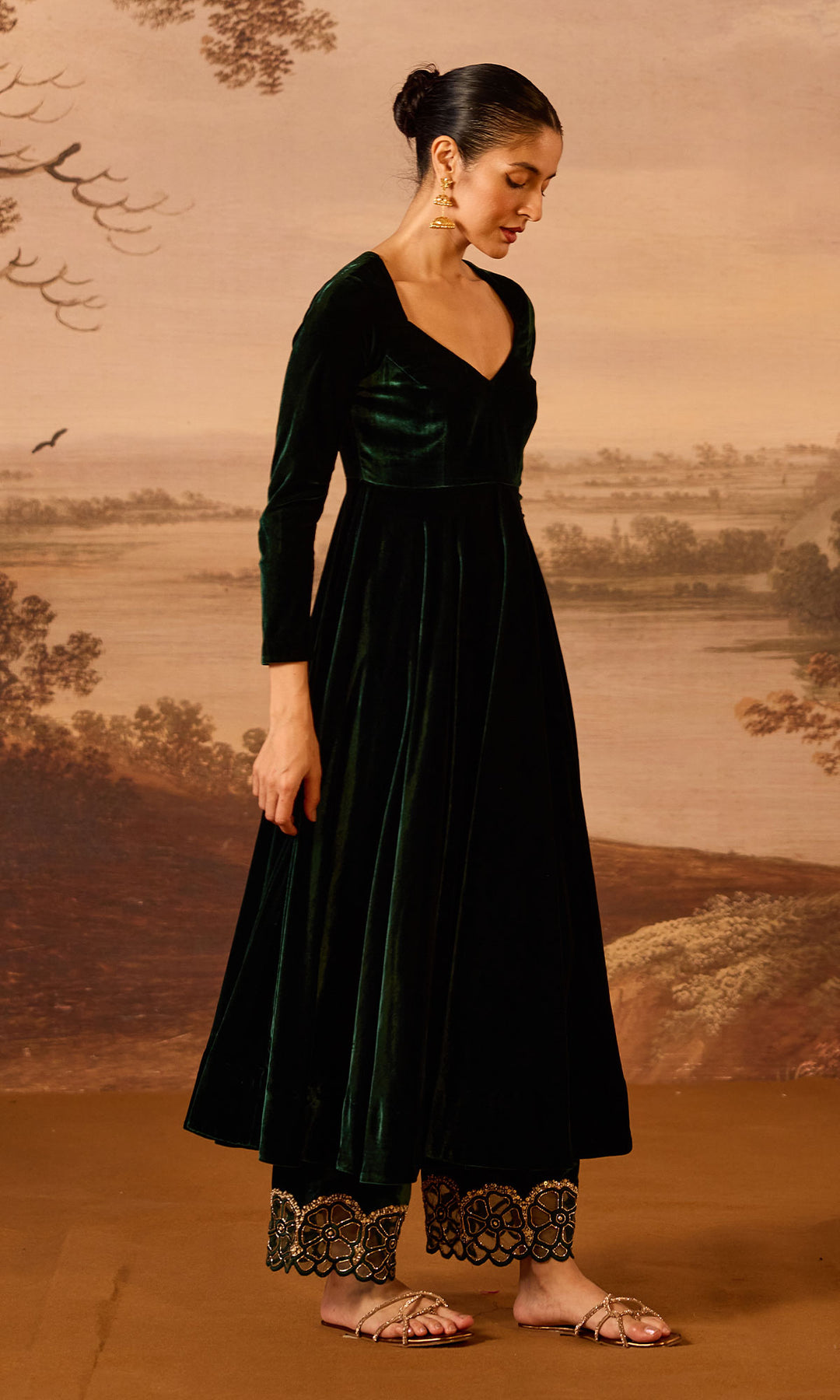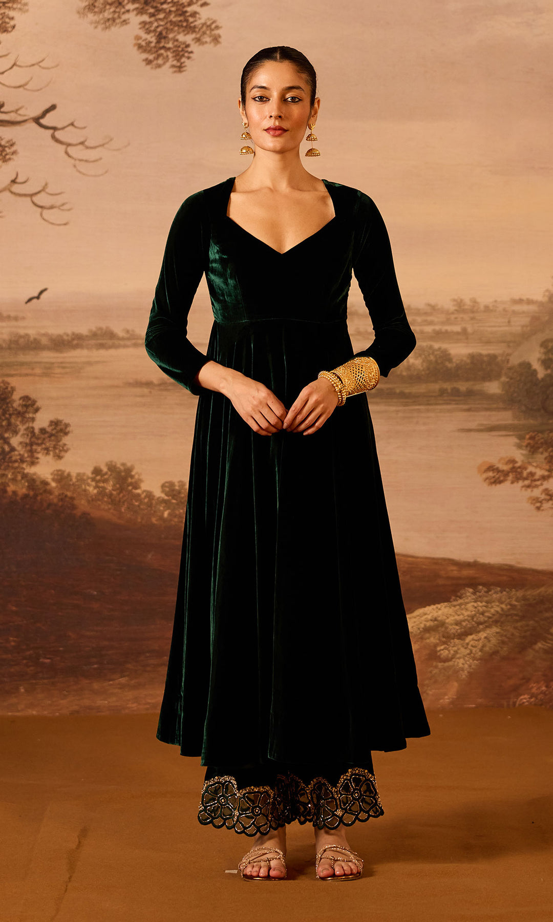 This set includes a silk velvet anarkali paired with matching palazzo and dupatta. The palazzo and shawl are beautifully detailed with machine and hand embroidery.