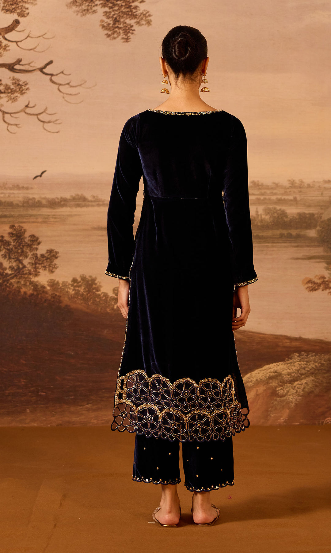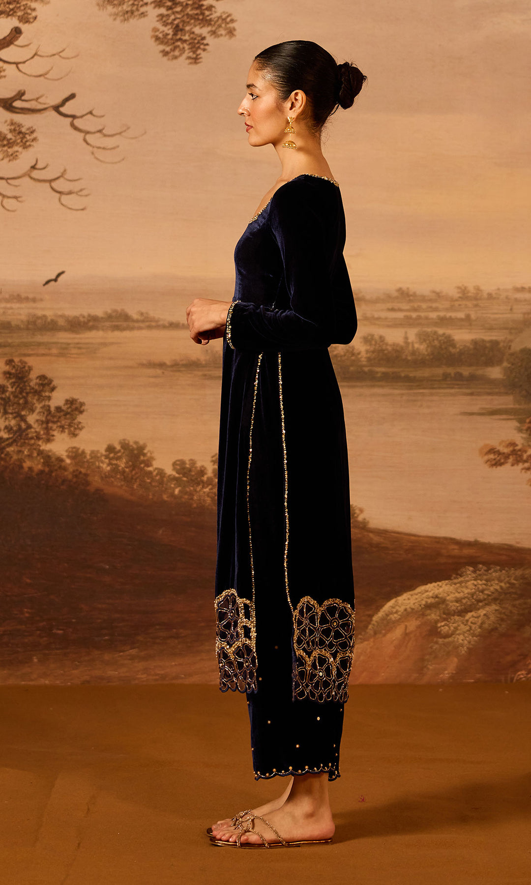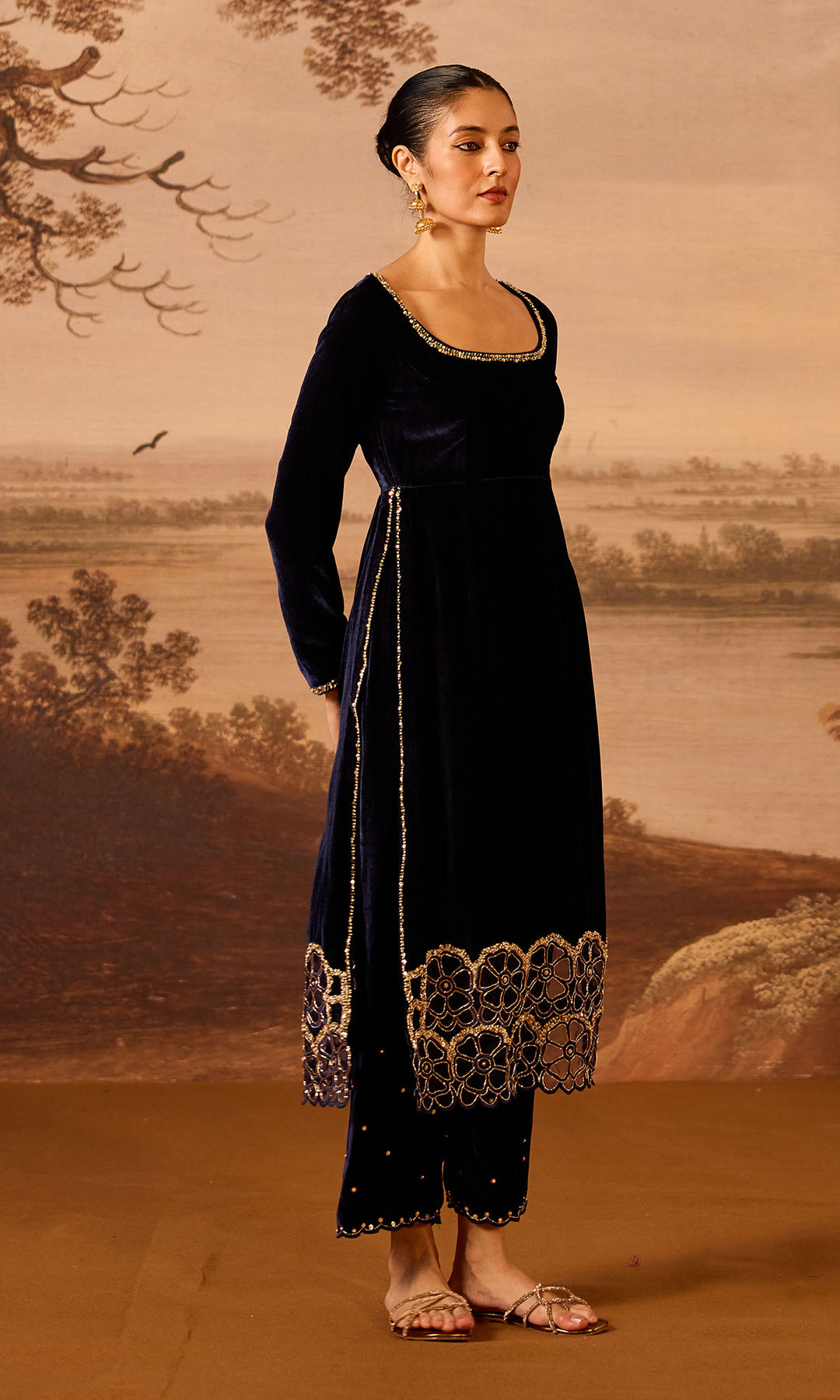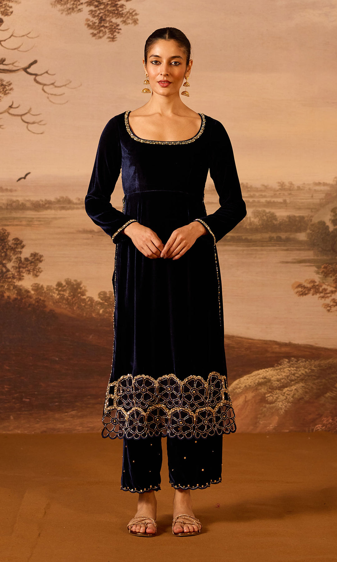 This set includes a high-slit kurta beautifully detailed with machine and hand embroidery, paired with matching palazzo and dupatta.