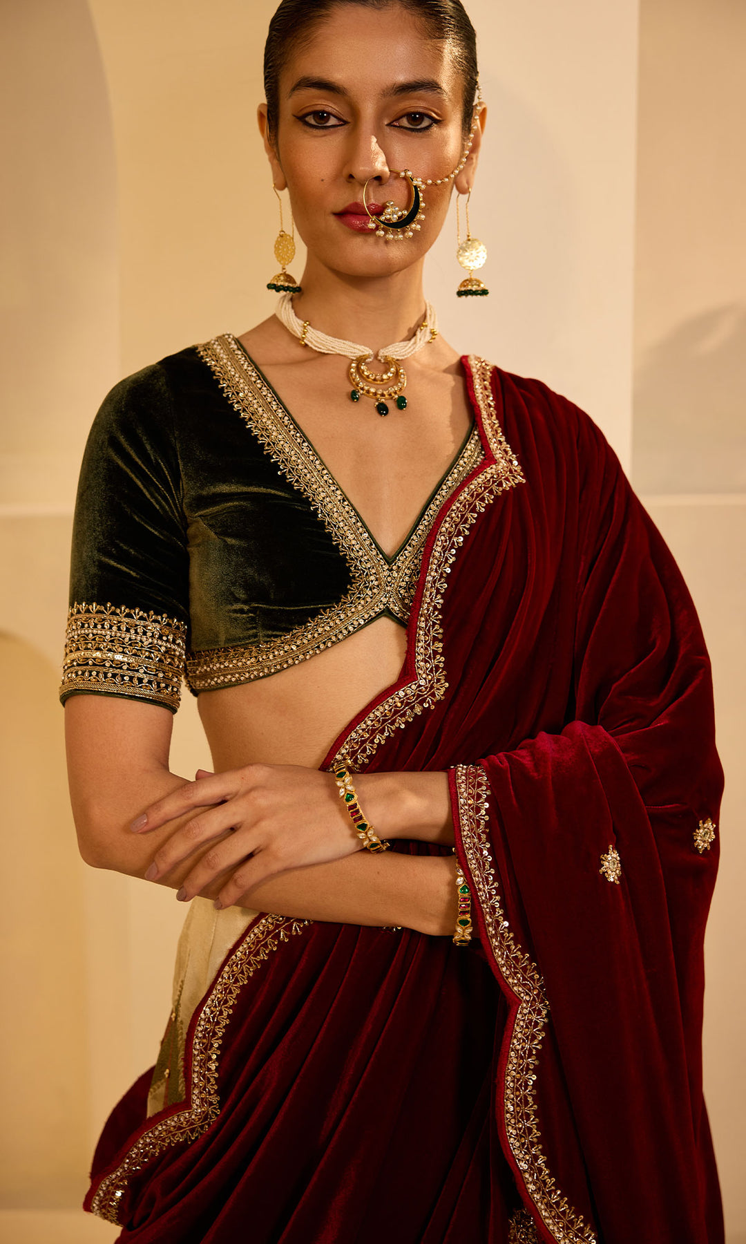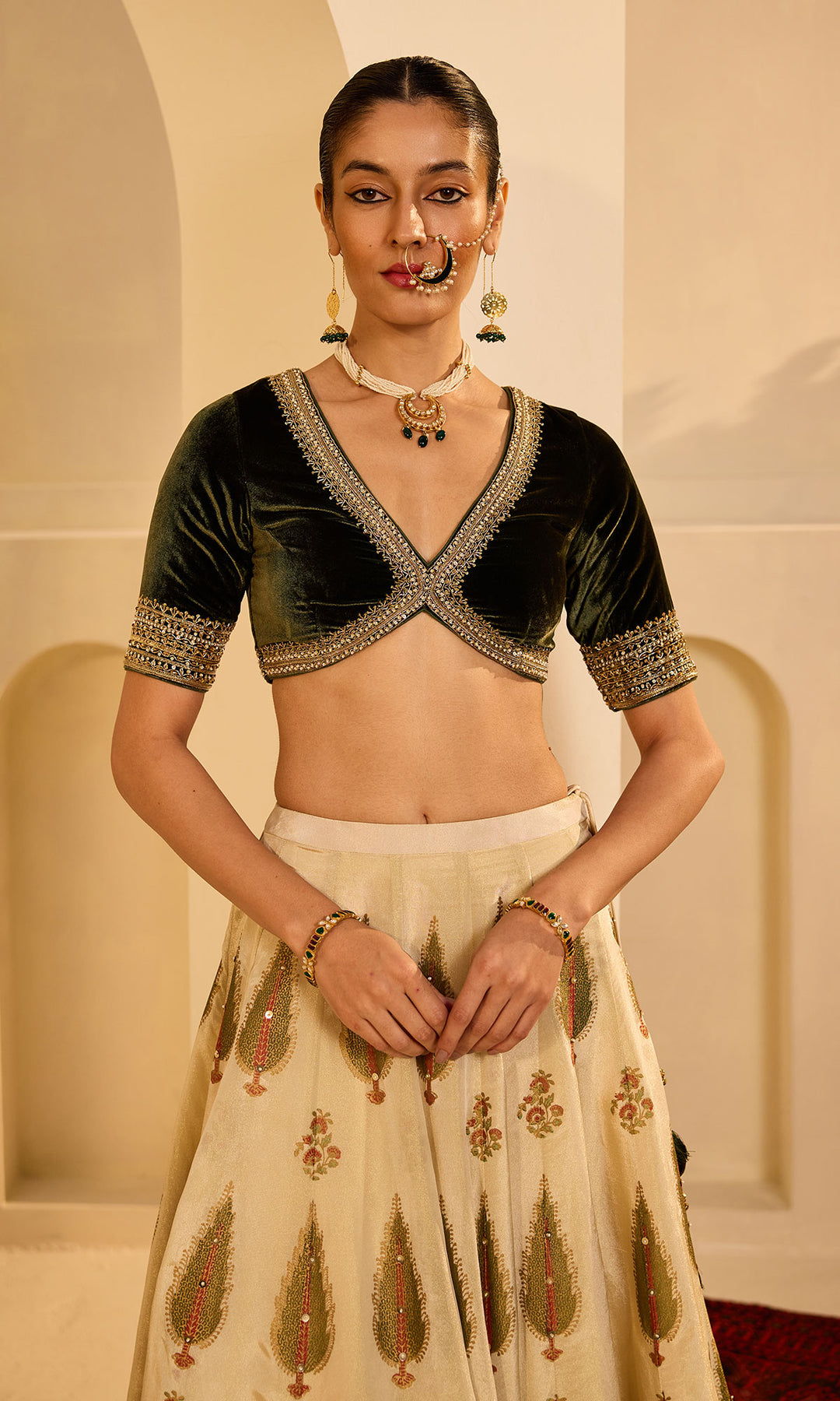 This set includes block printed lehenga with silk velvet blouse and shawl. Lehenga is detailed with velvet patches on ghera and hand embroidery . It comes with silk velvet aari and hand