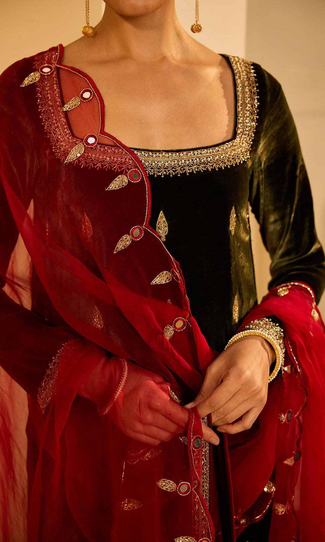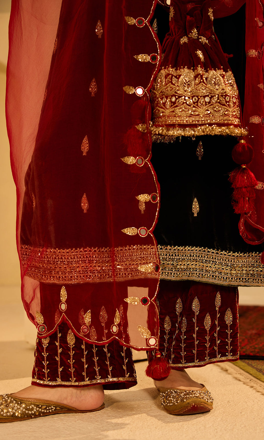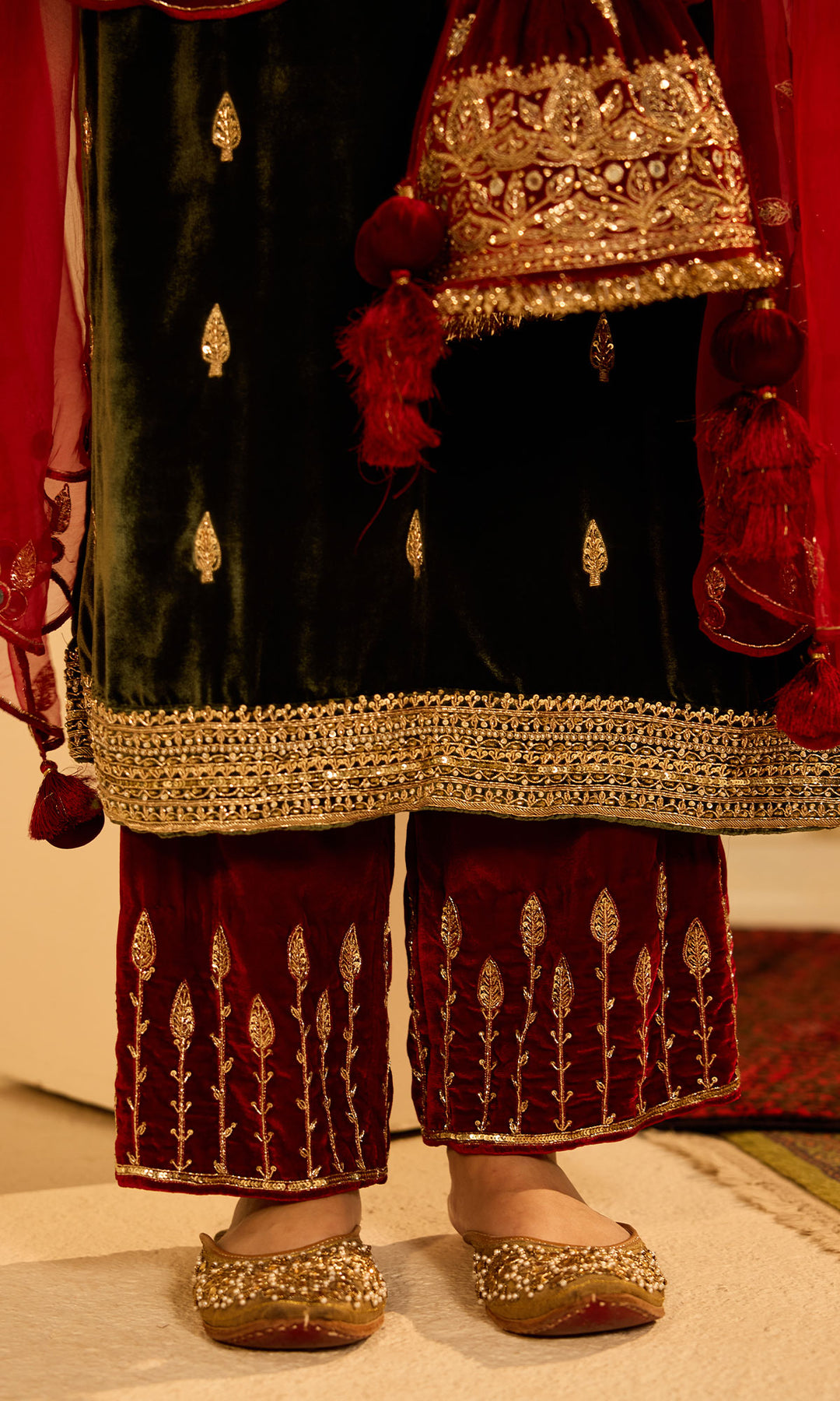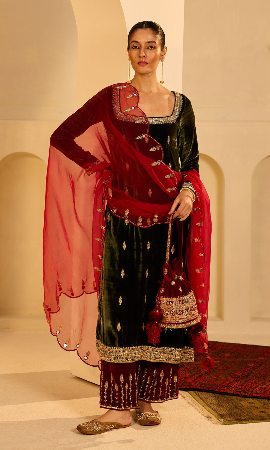 This Set Includes straight silk velvet kurta, Palazzo and dupatta . Kurta Neck And Sleeves Are Embellished With Sequins , Dabka And aari Work. It Comes With Embroidered Palazzo And dupatta.