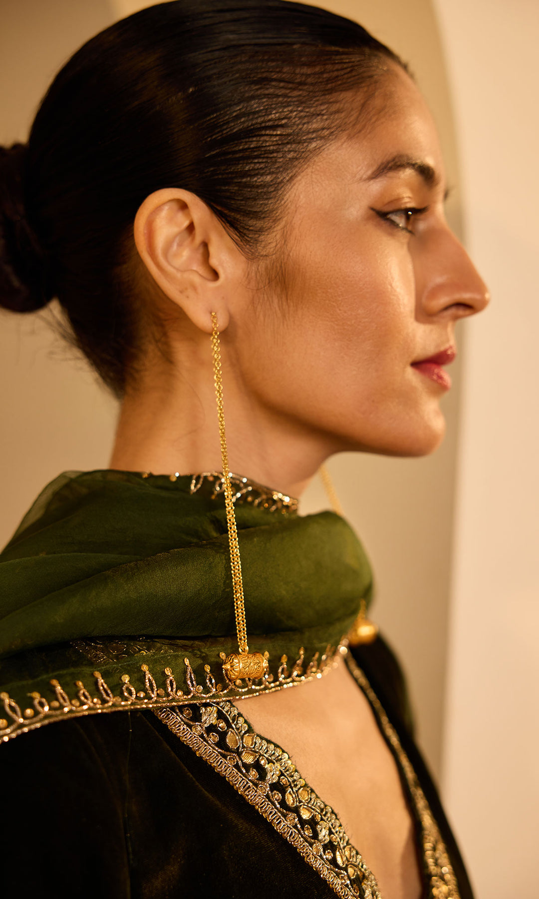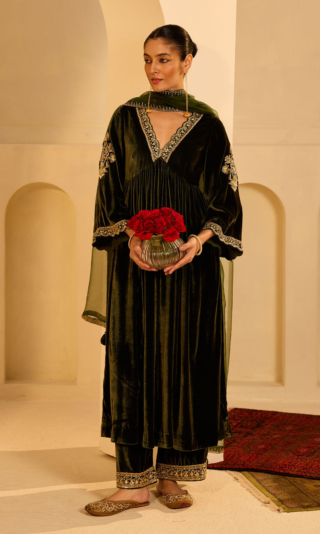 This Set Includes V Neck Anarkali , Palazzo And Dupatta. Anarkali Neck And Sleeves Are Embellished With Sequins, Dabka And gota Work. It Comes With Embroidered Palazzo And