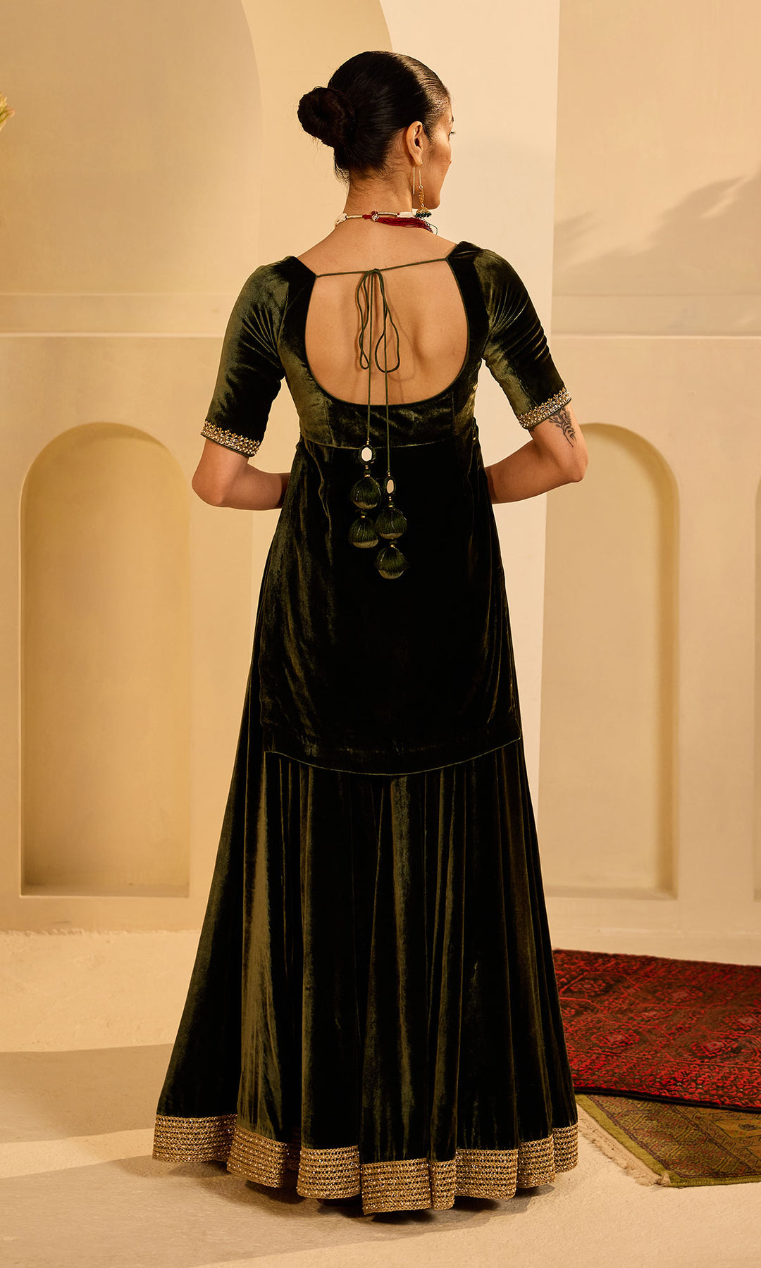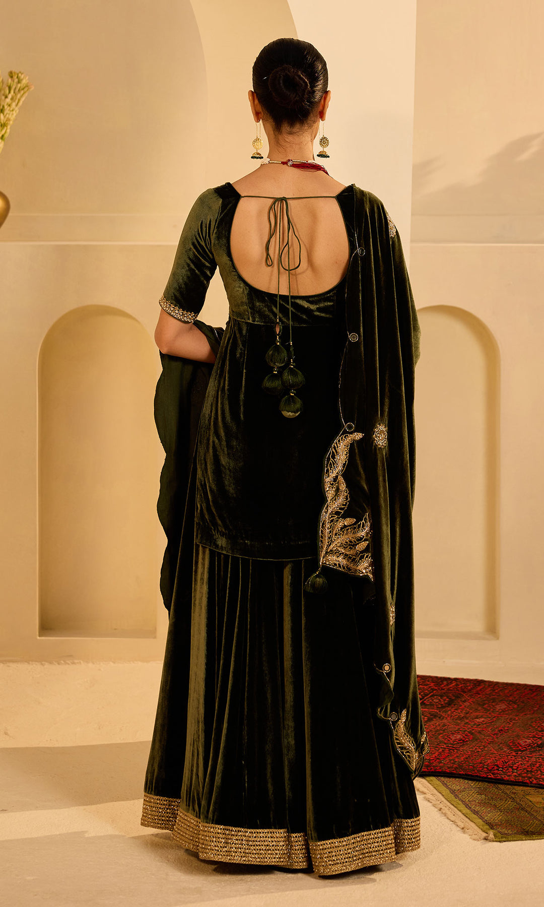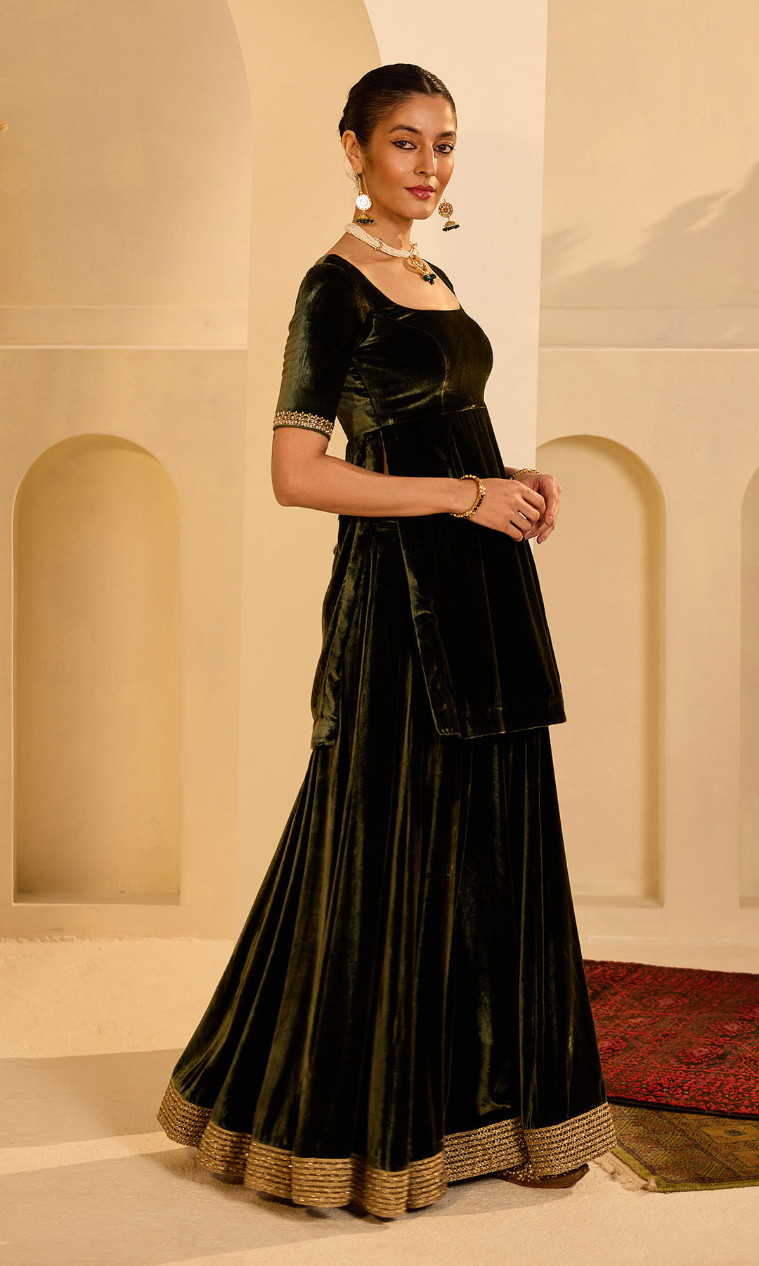 This set includes Kurta with Sharara and shawl. Kurta is embellished with sequins, pearls dabka work. It comes Sharara is detailed with pearl embroidered lace .silk velvet shawl is detailed with aari and hand embroidery .