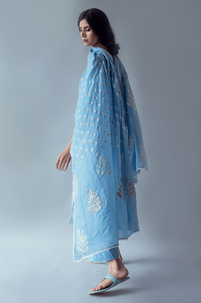 This three piece set includes Kurta, Palazzo and dupatta. Blue leaf printed kurta with gota embroidery. Gota embroidered palazzo with Blue printed mul dupatta with gota embroidery.
