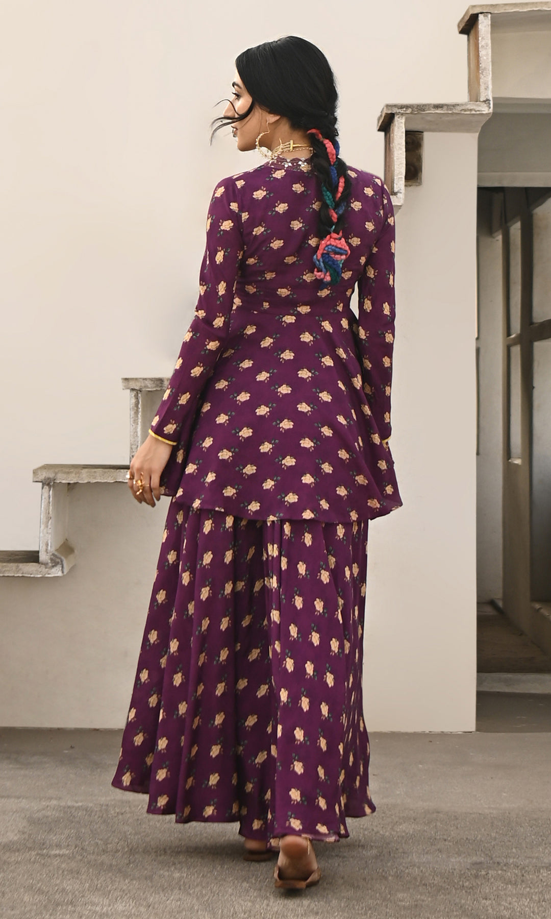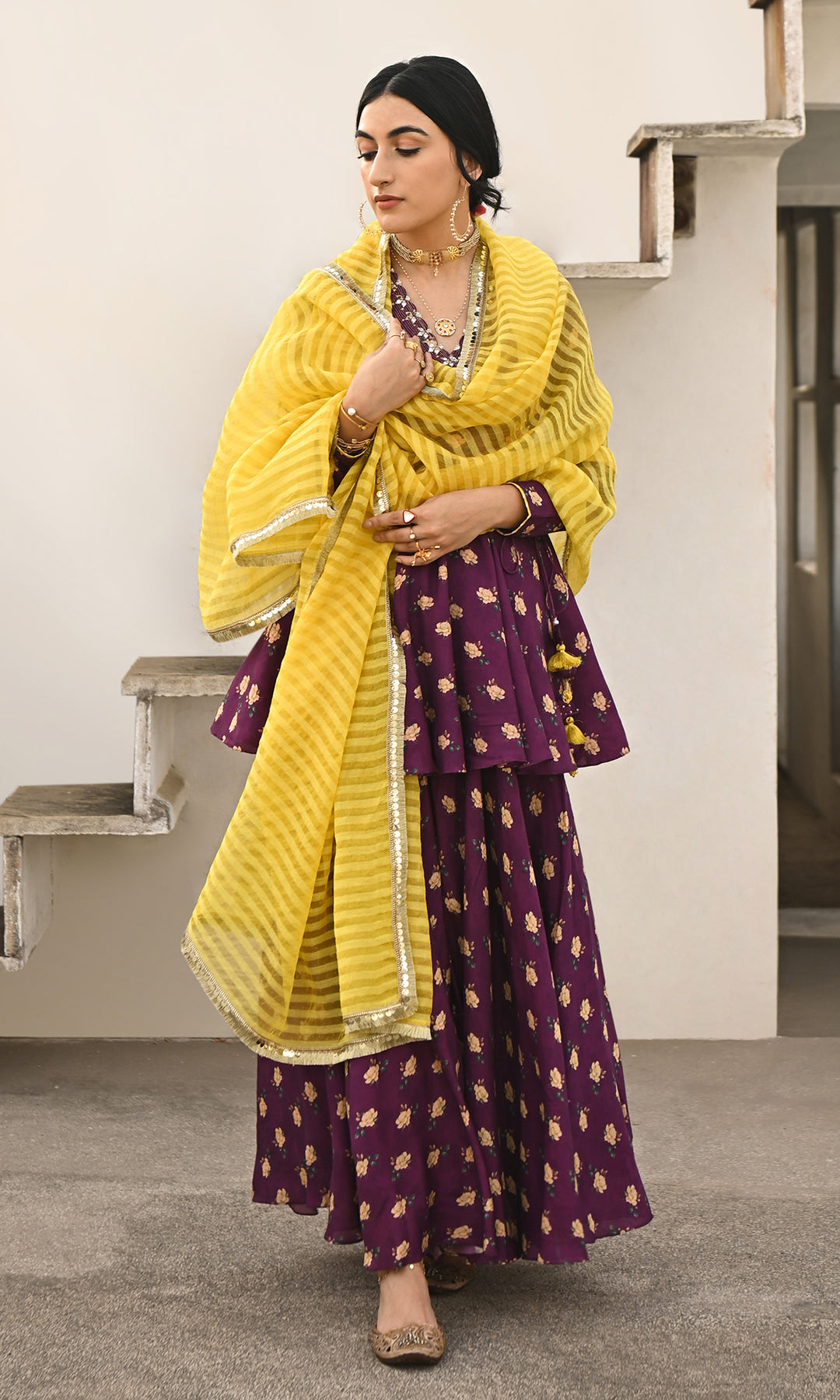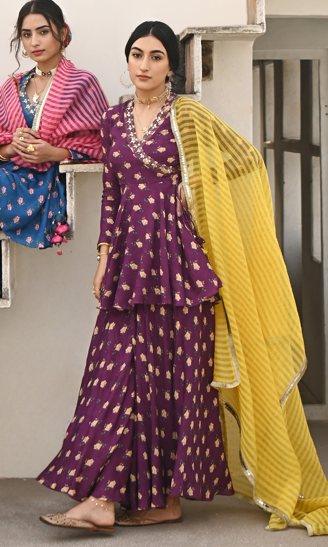 This set includes printed short Kurta , Sharara and Dupatta. Kurta yoke has mirror and sequins embroidery. It comes with printed Sharara. Dupatta is finished with fringe lace.