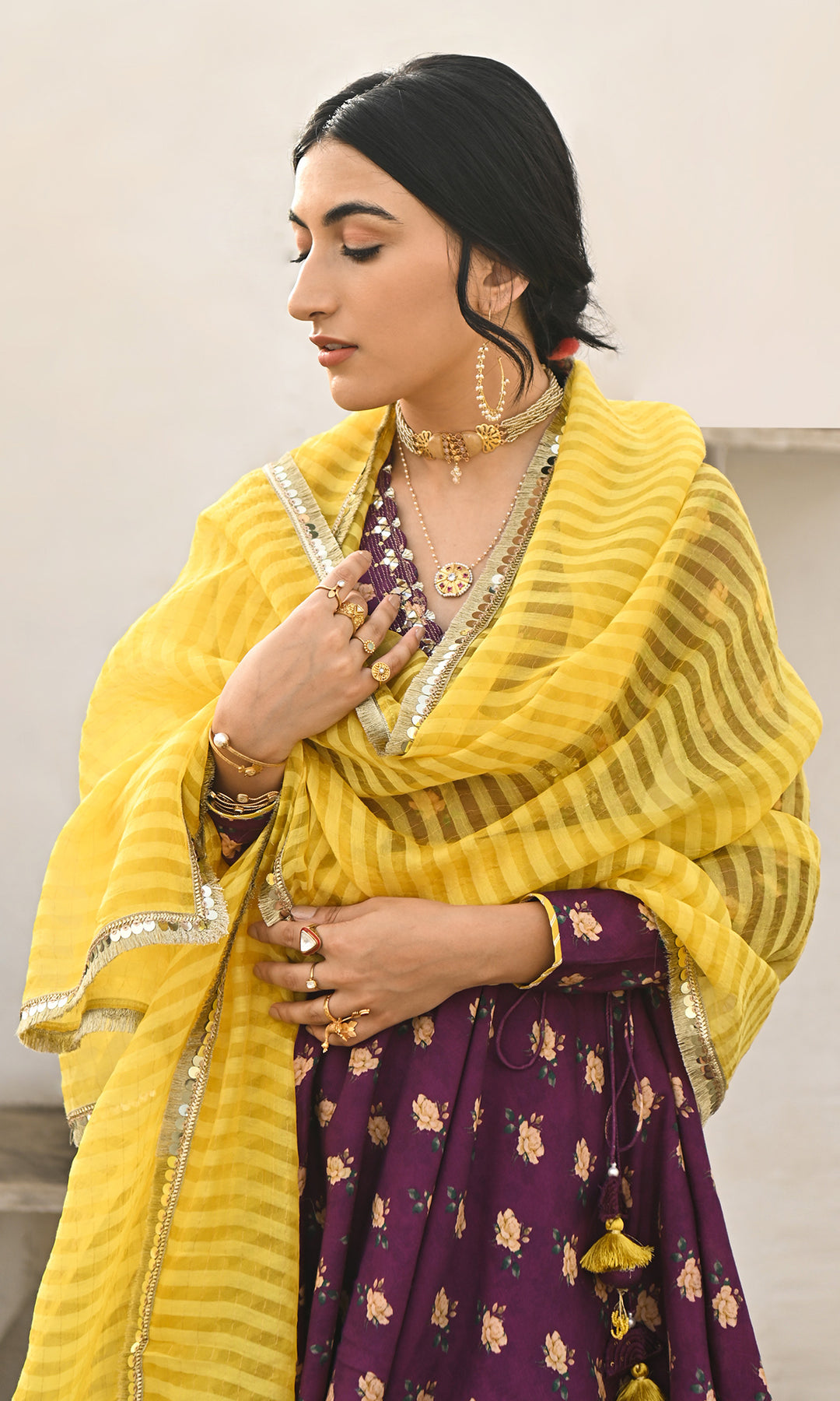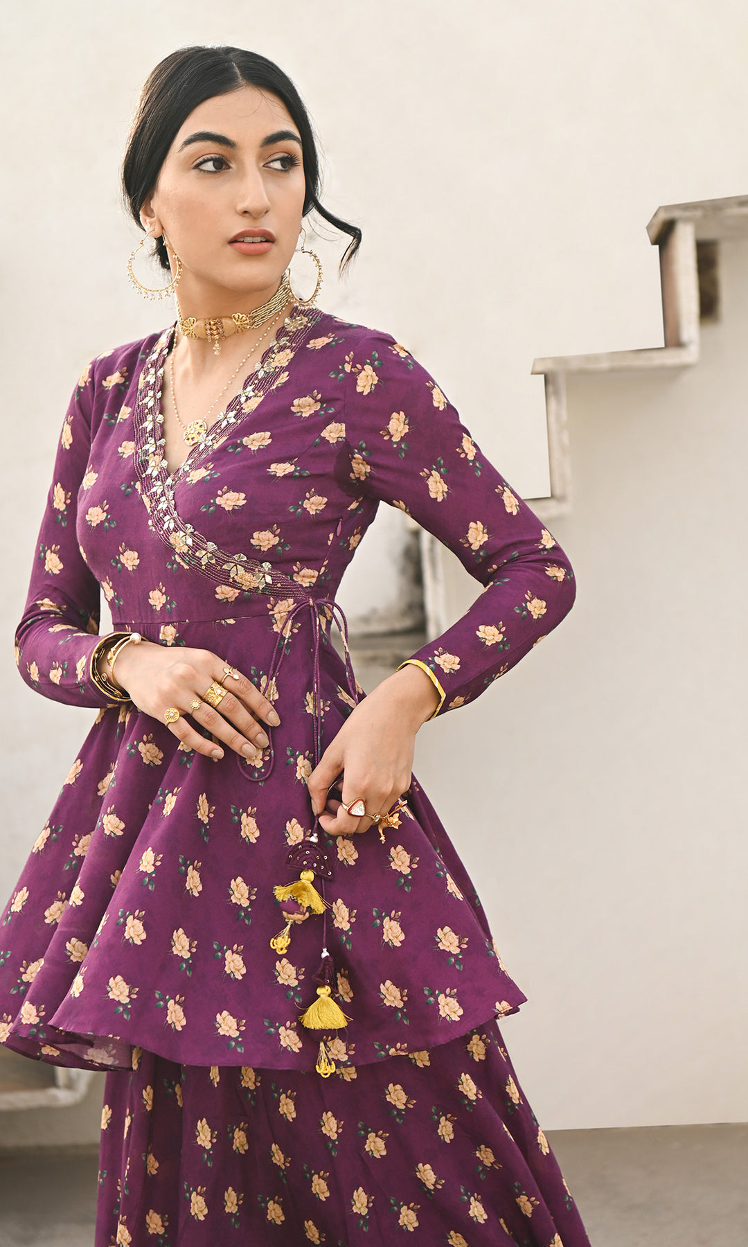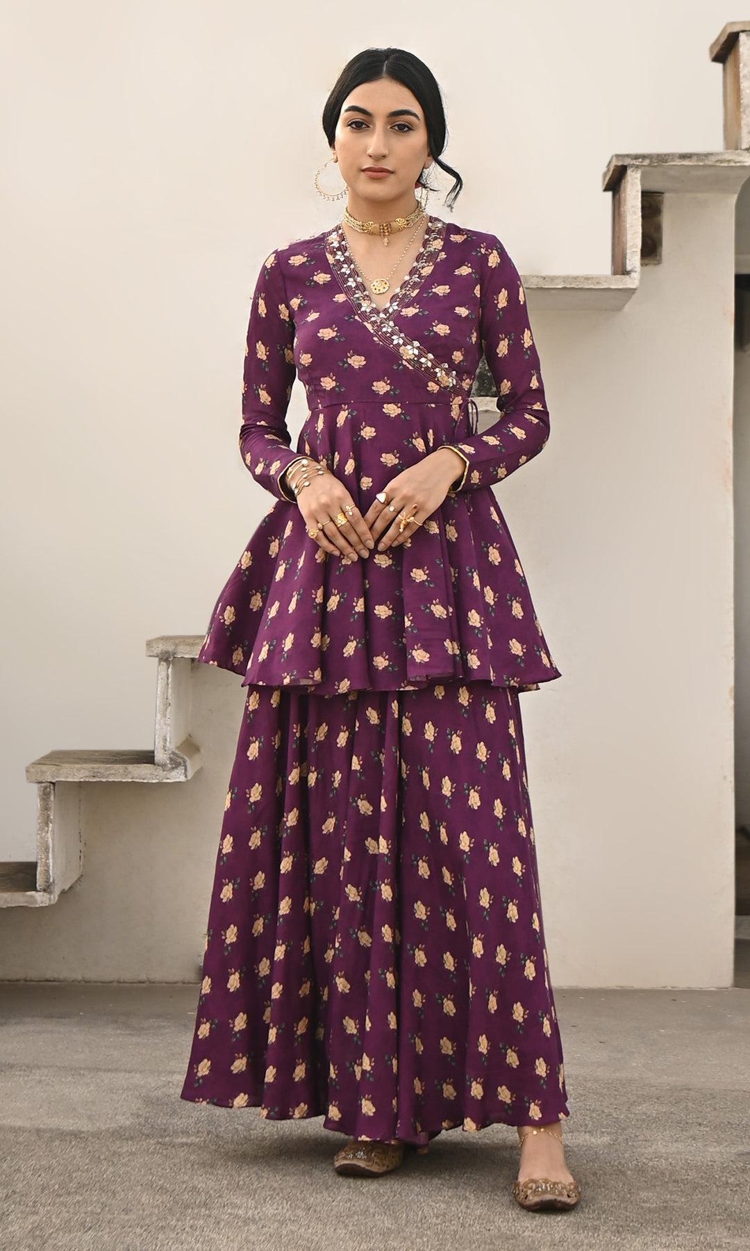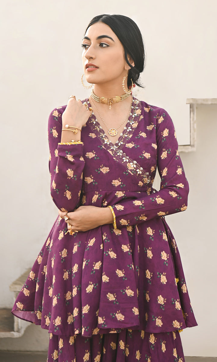 This set includes printed short Kurta , Sharara and Dupatta. Kurta yoke has mirror and sequins embroidery. It comes with printed Sharara. Dupatta is finished with fringe lace.