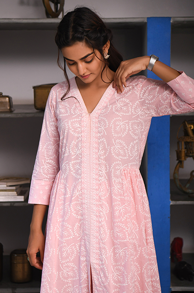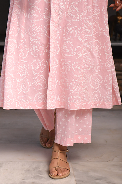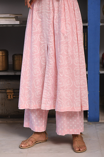 White Khari Hand Block Leaf Print, front open Kurta with Side Gather detailings and Pockets. Small Floral Booti Print Palazzo.