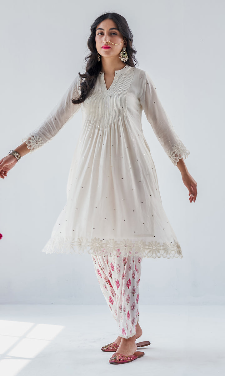 This set includes Mukaish work pintuck kurta, block printed salwar and dupatta. Sleeves and hemline are finished with scalloped lace. It is with block printed salwar. Dupatta has Mukaish work and is finished with scalloped lace.