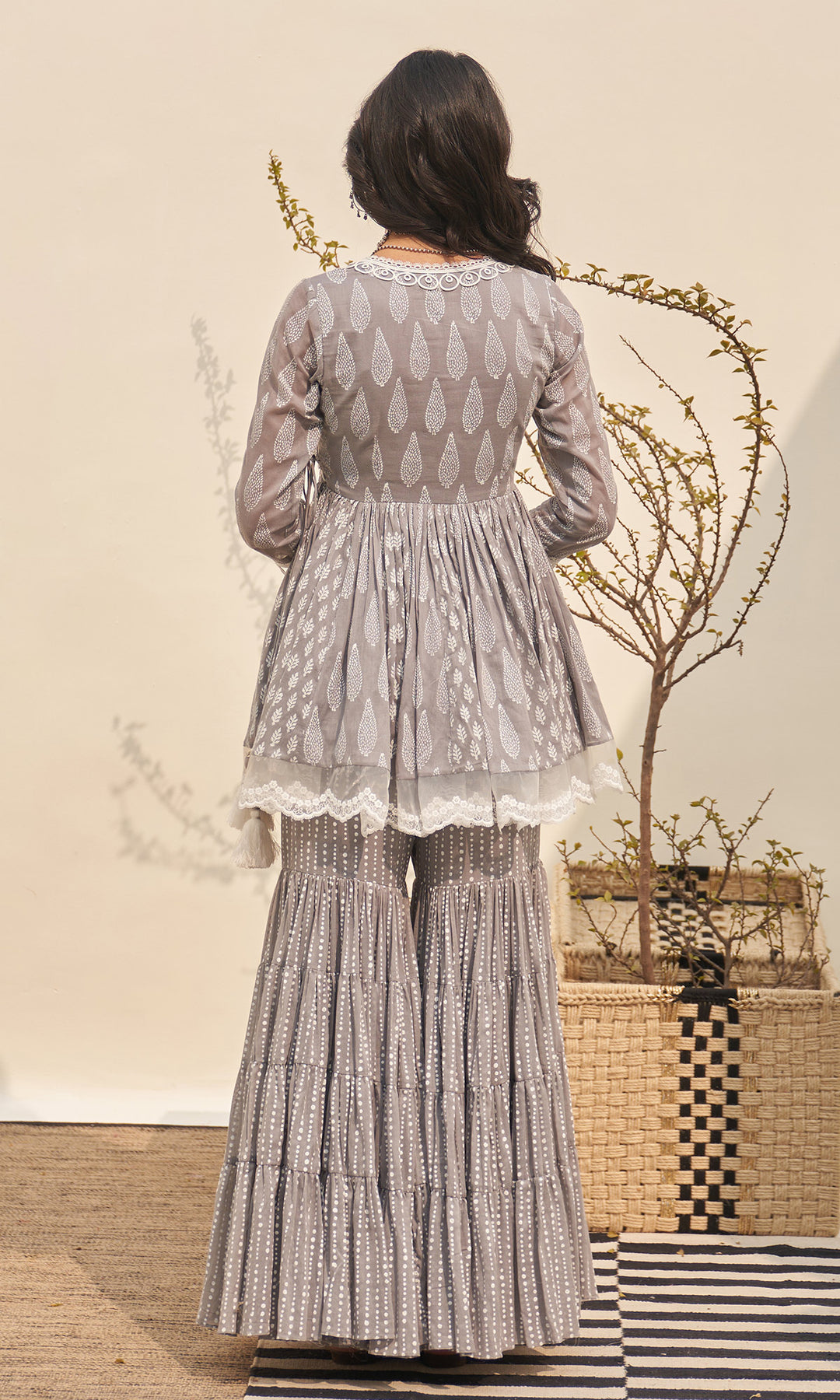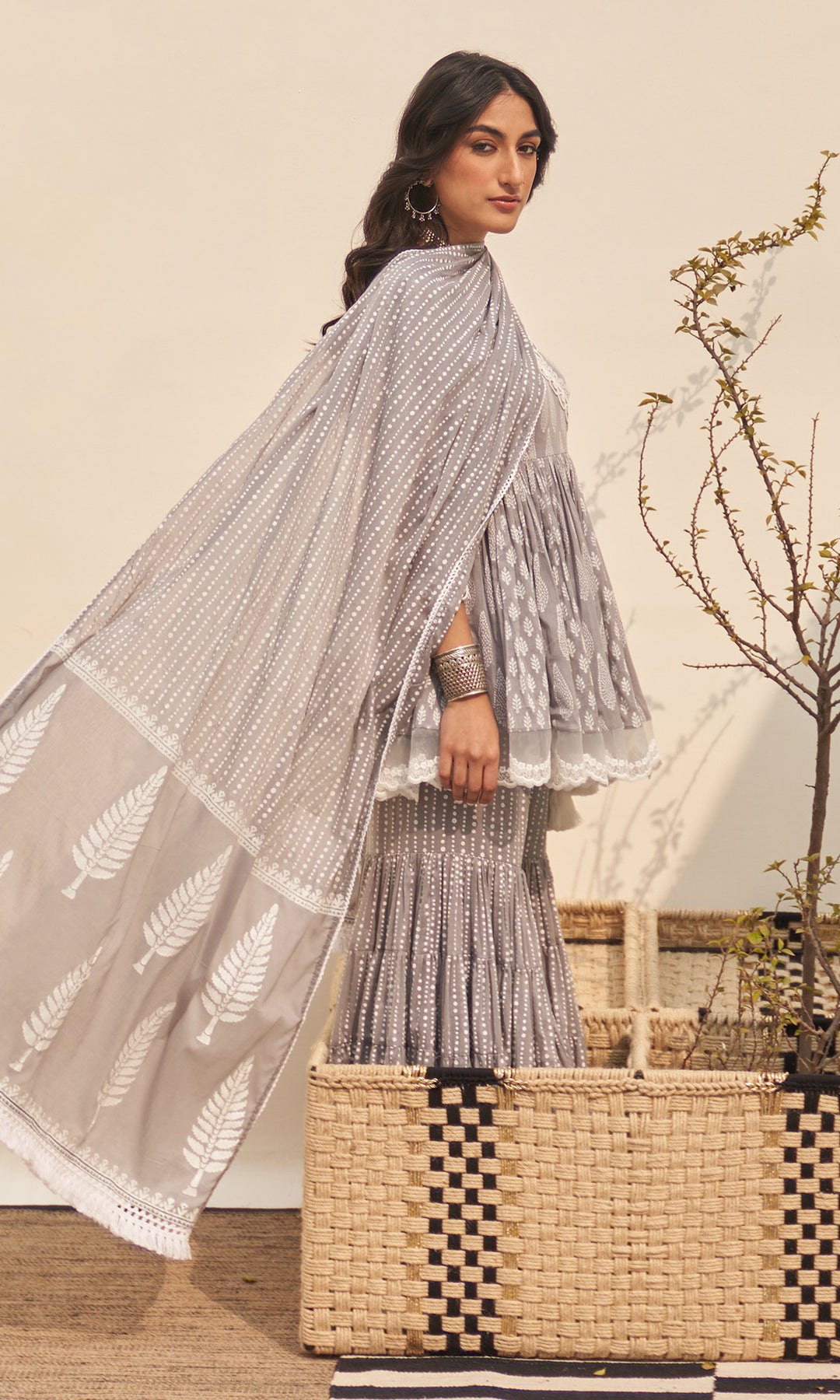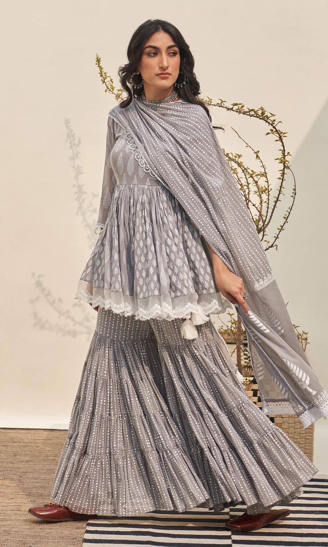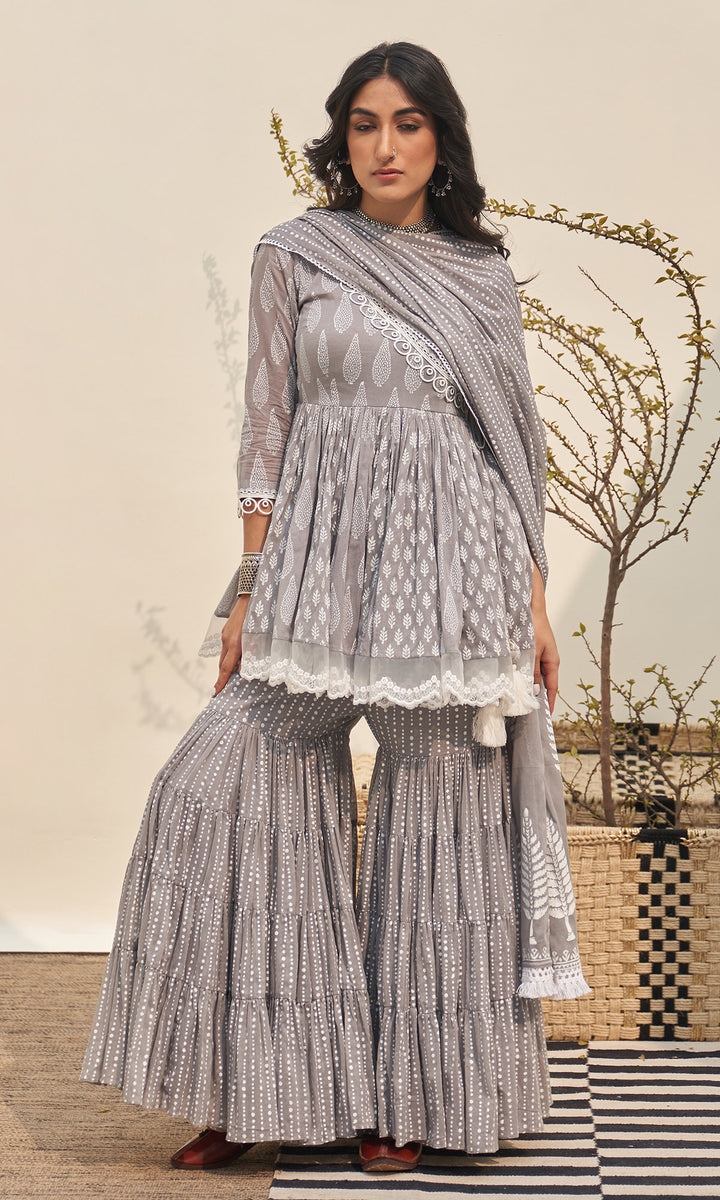 Jannat 2.0 Grey Block Printed Sharara Set - Set Of 3
