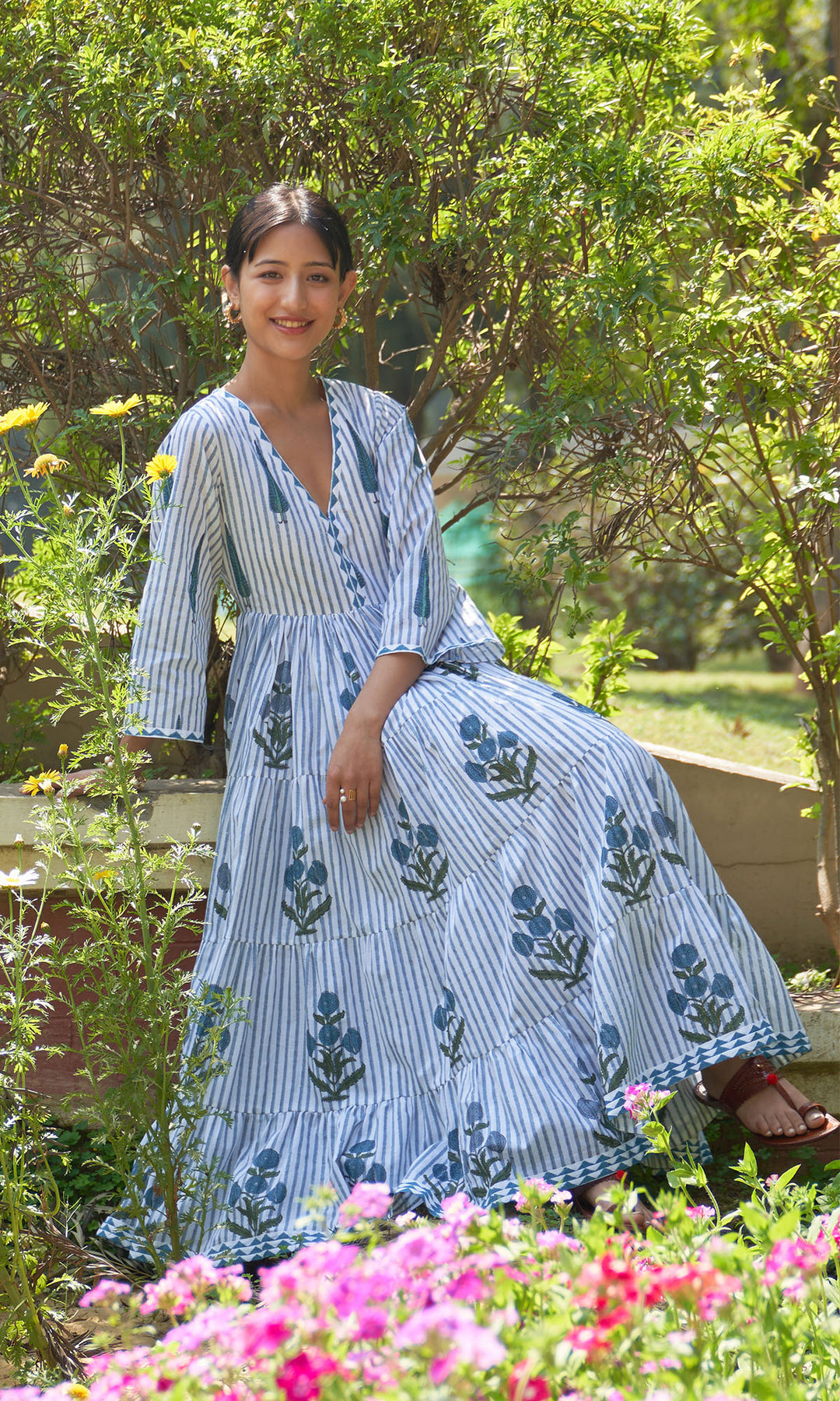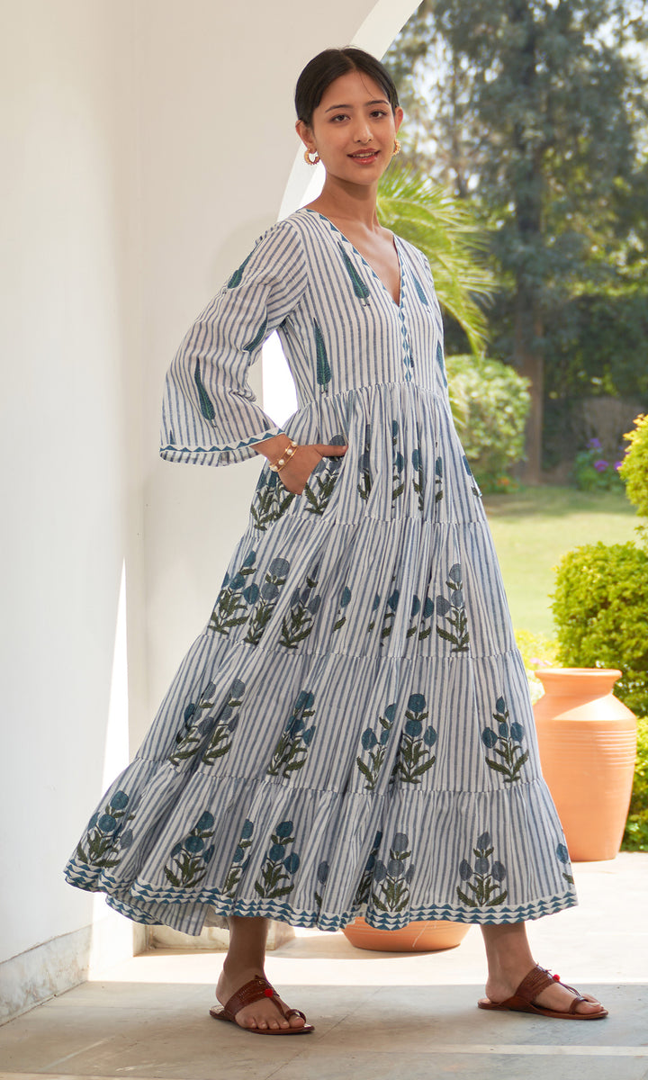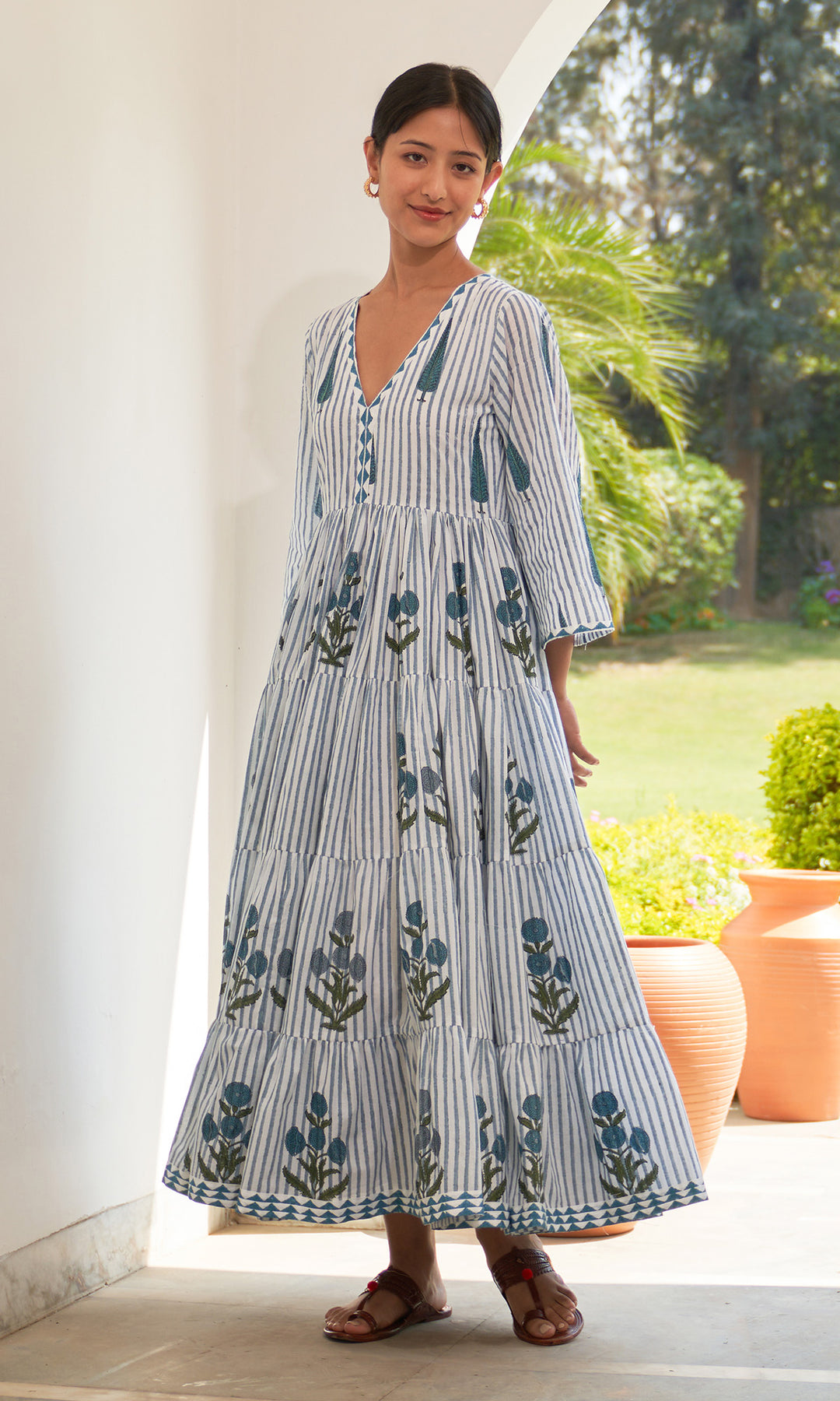 Iris Cotton Blue Stripe Boota Gathered Dress