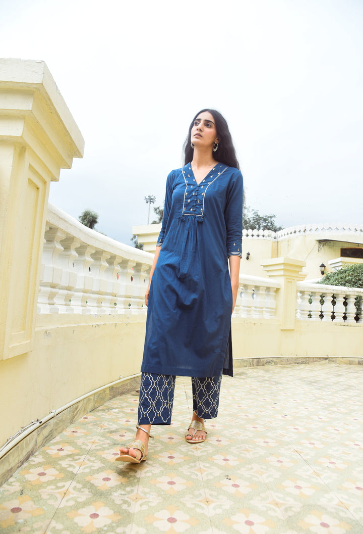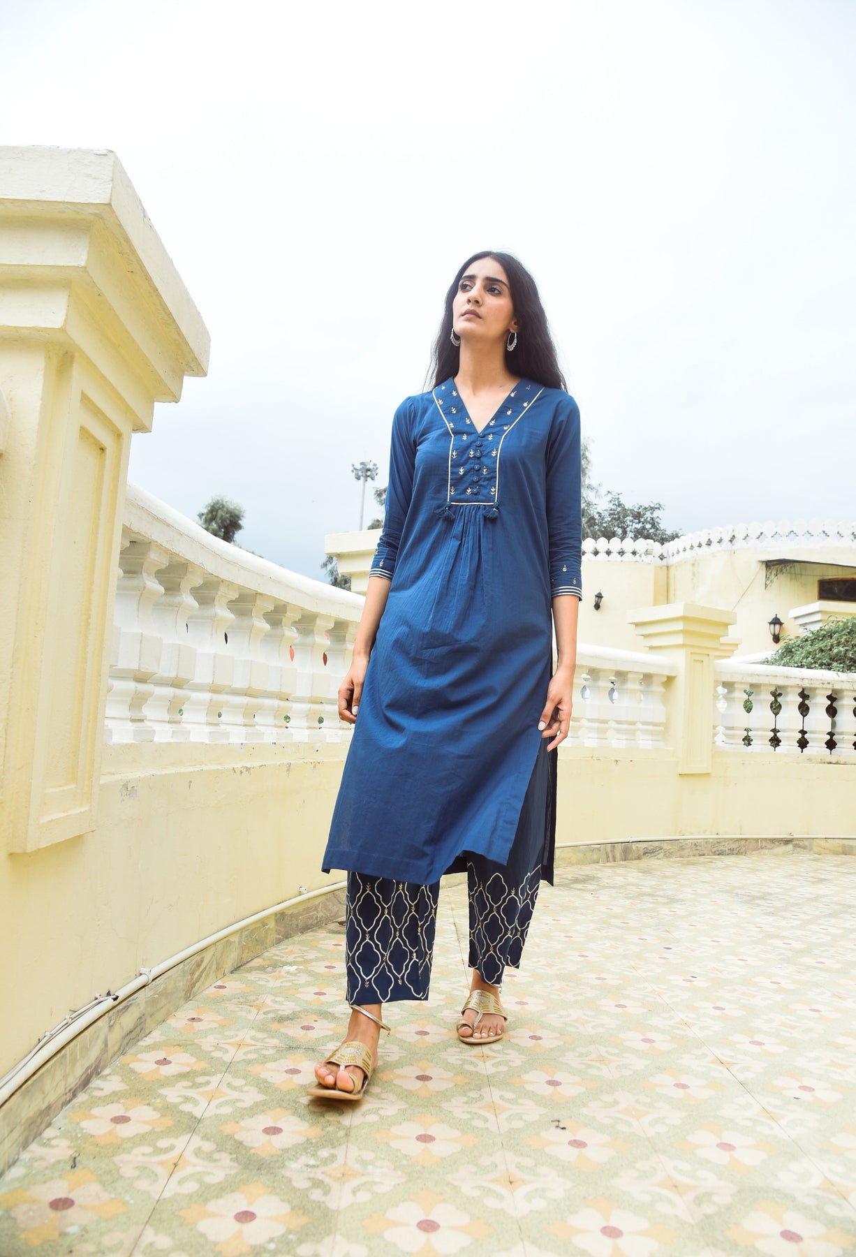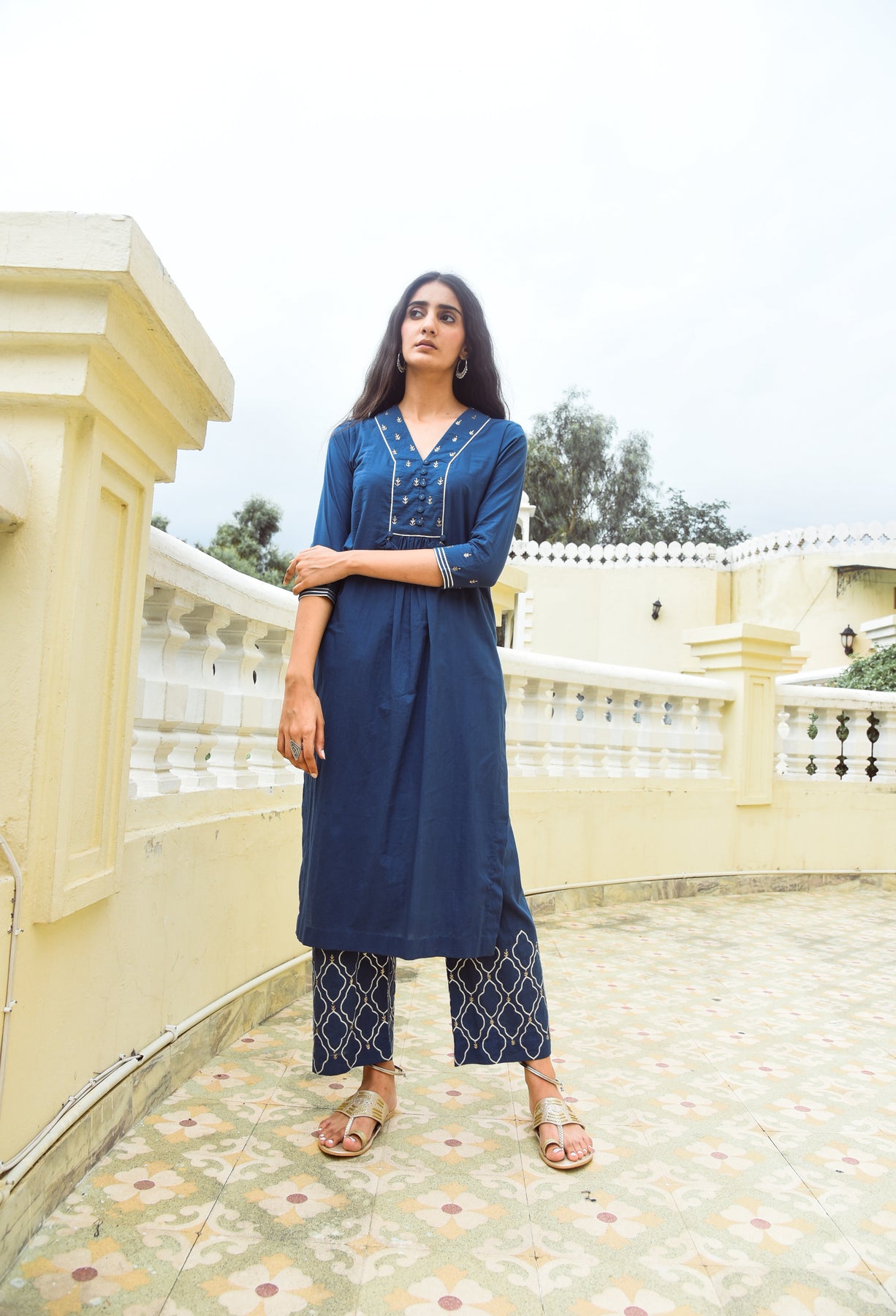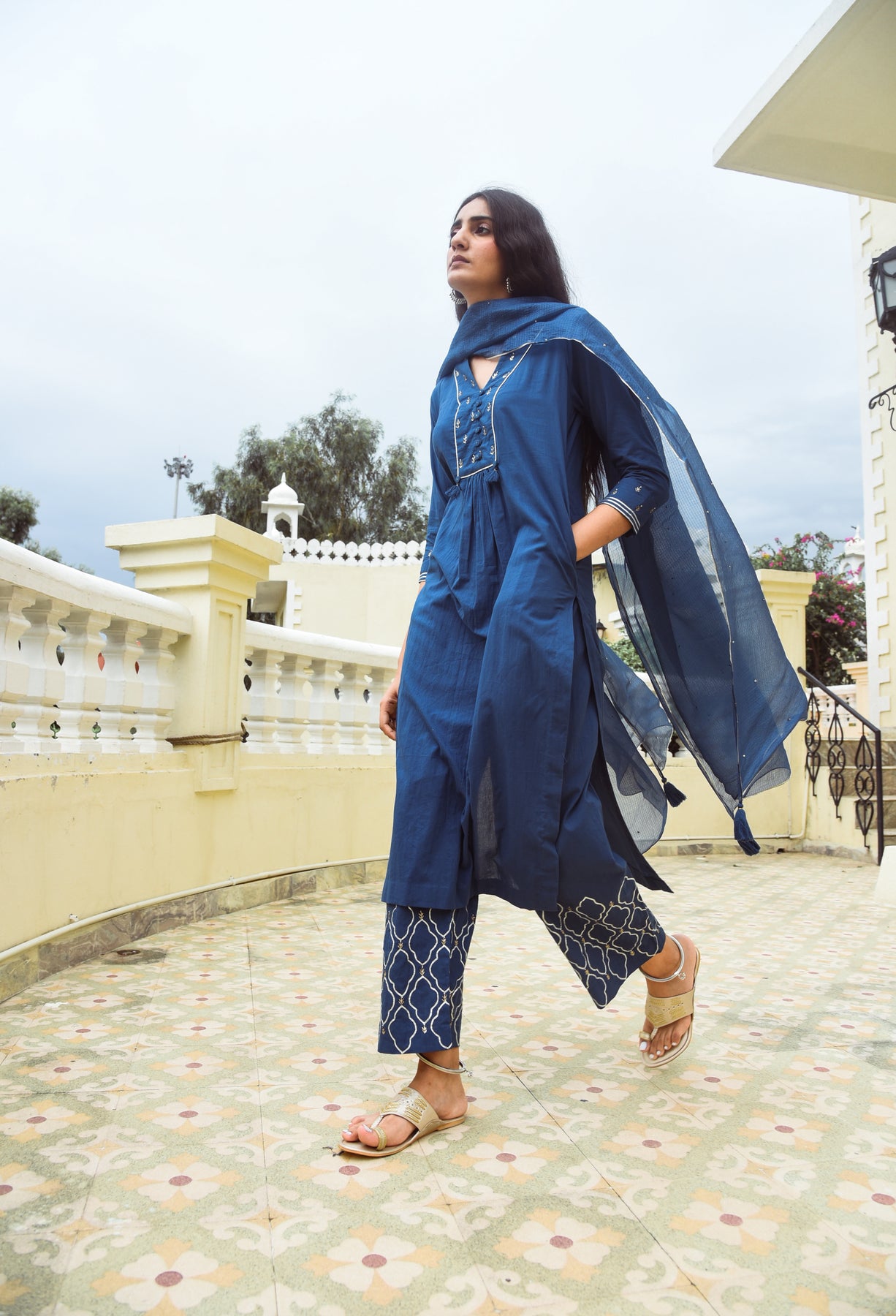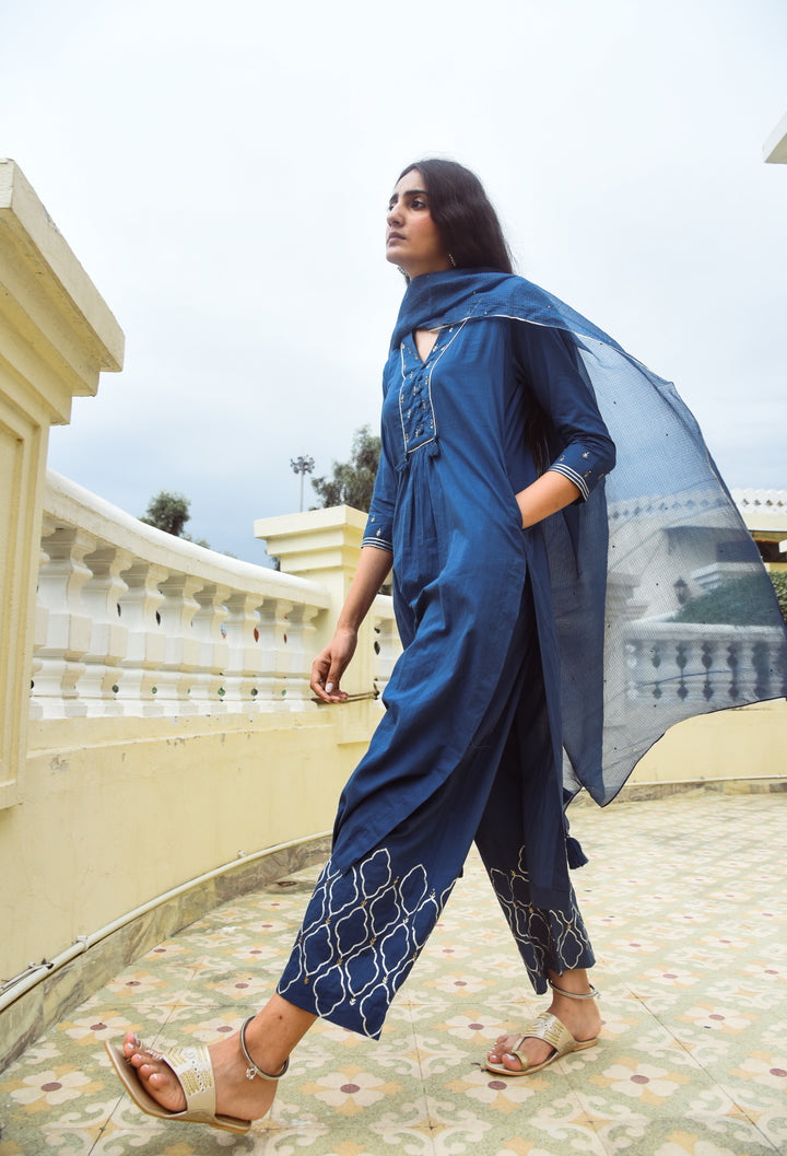 This three piece set includes Kurta, Palazzo and dupatta. Blue front gathered embroidered yoke kurta with palazzo and ivory kota dupatta with bead and sequins detailing.