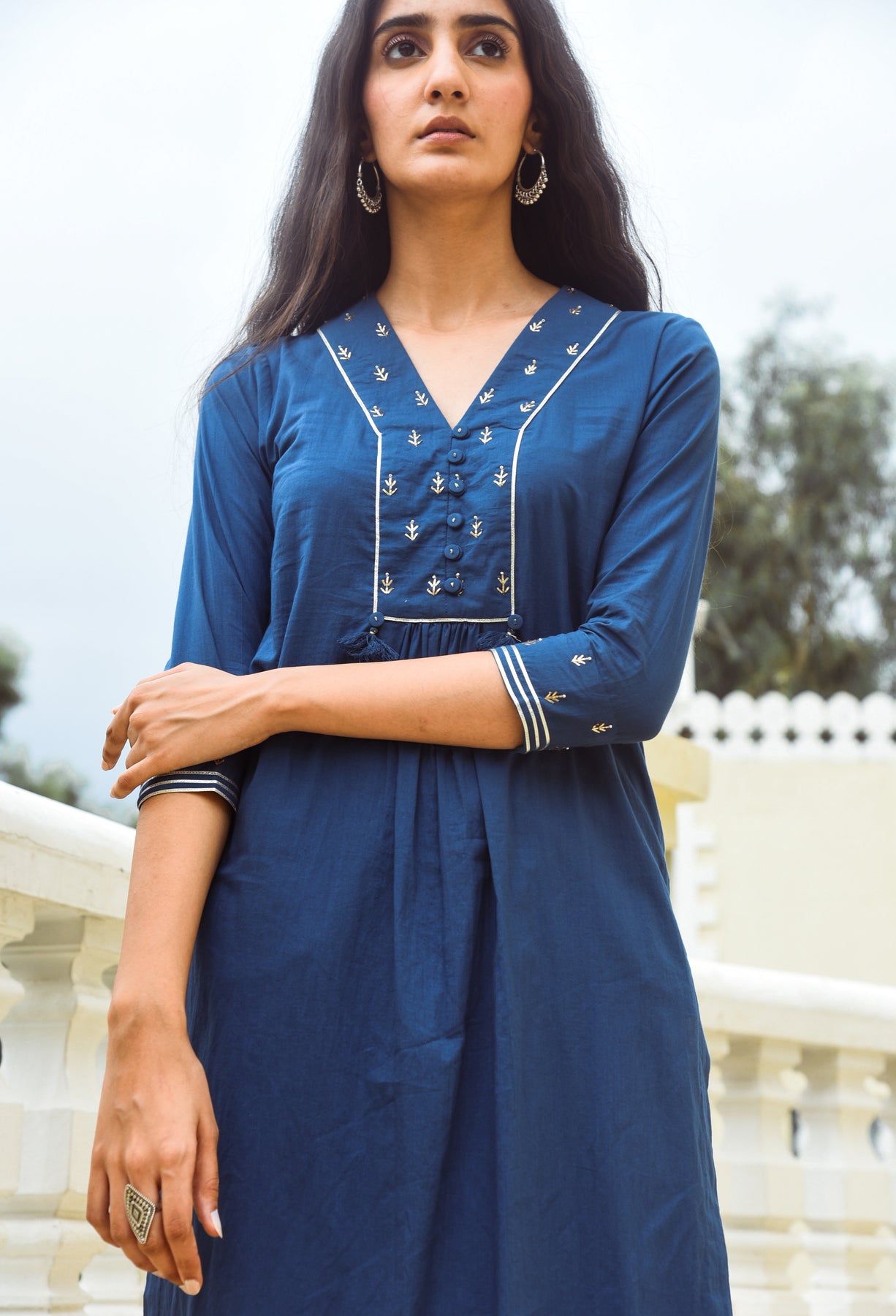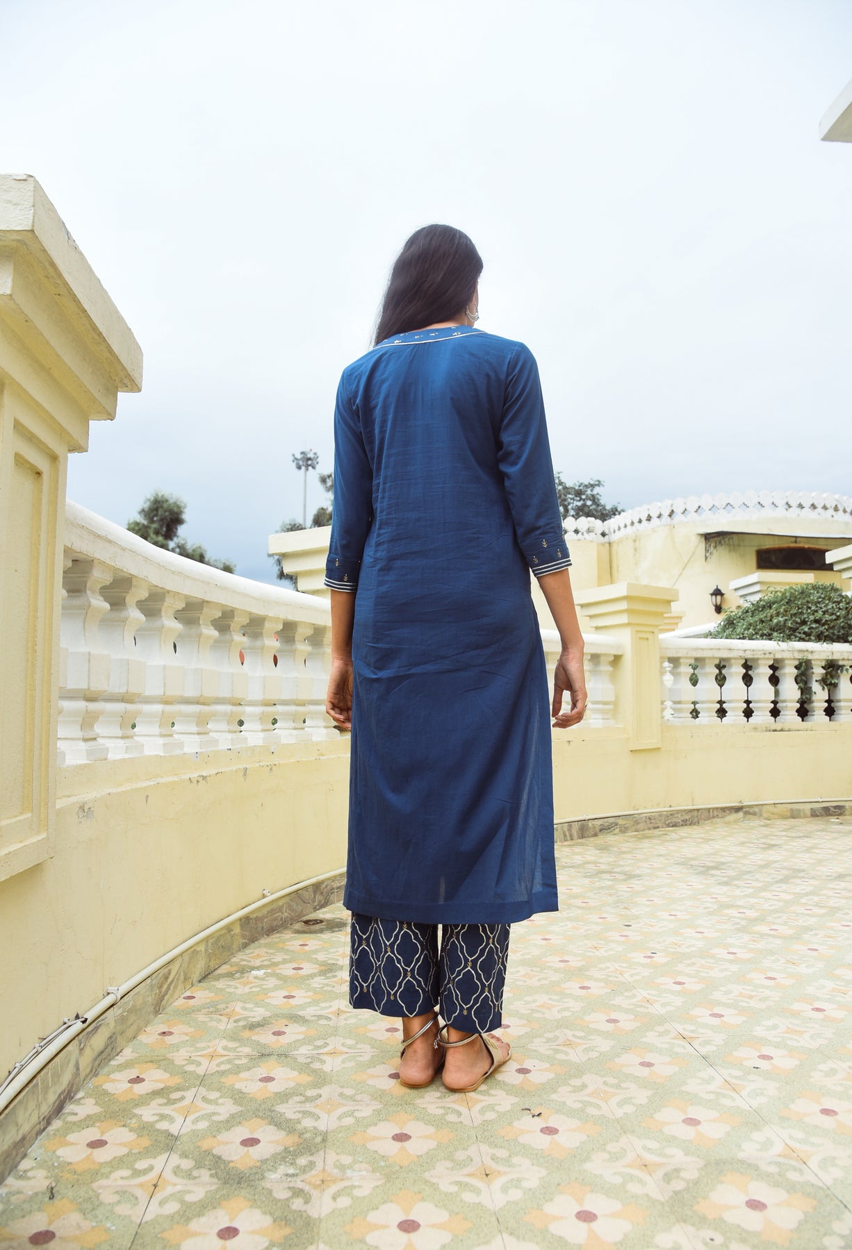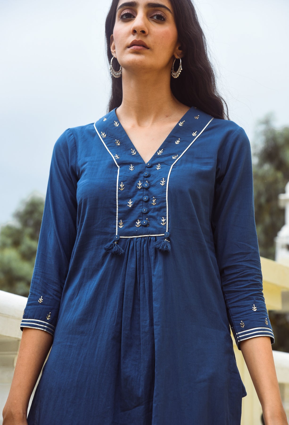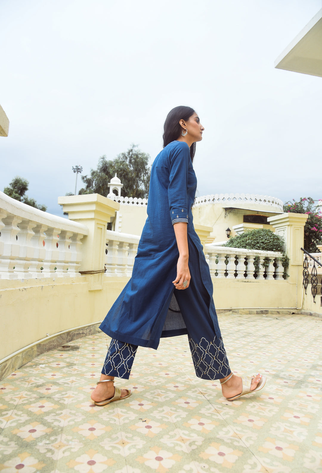 This three piece set includes Kurta, Palazzo and dupatta. Blue front gathered embroidered yoke kurta with palazzo and ivory kota dupatta with bead and sequins detailing.