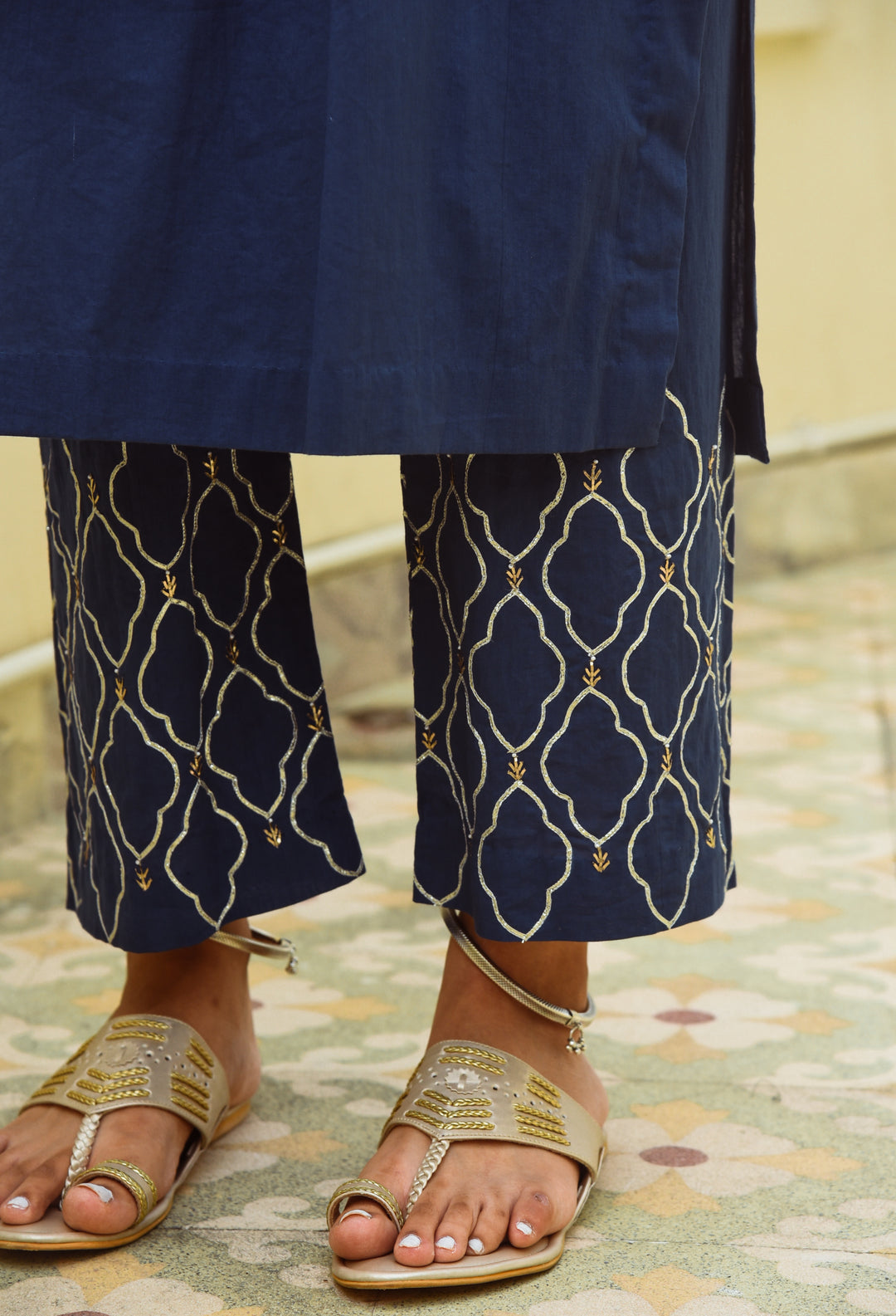 • Pitta and gota embroidery on Kurta, palazzo and dupatta. Dupatta finished with gota and handmade cotton tassels.