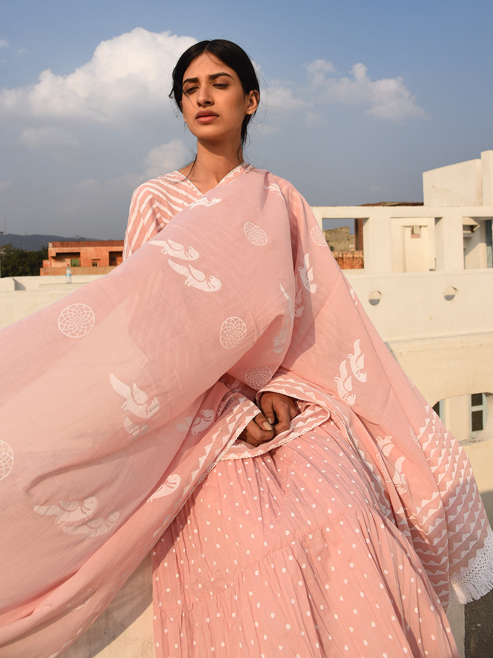 pink cotton dupatta with bird block print.