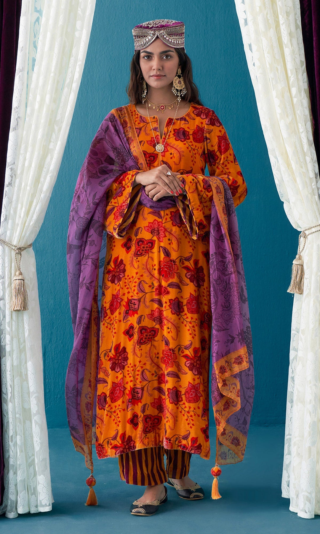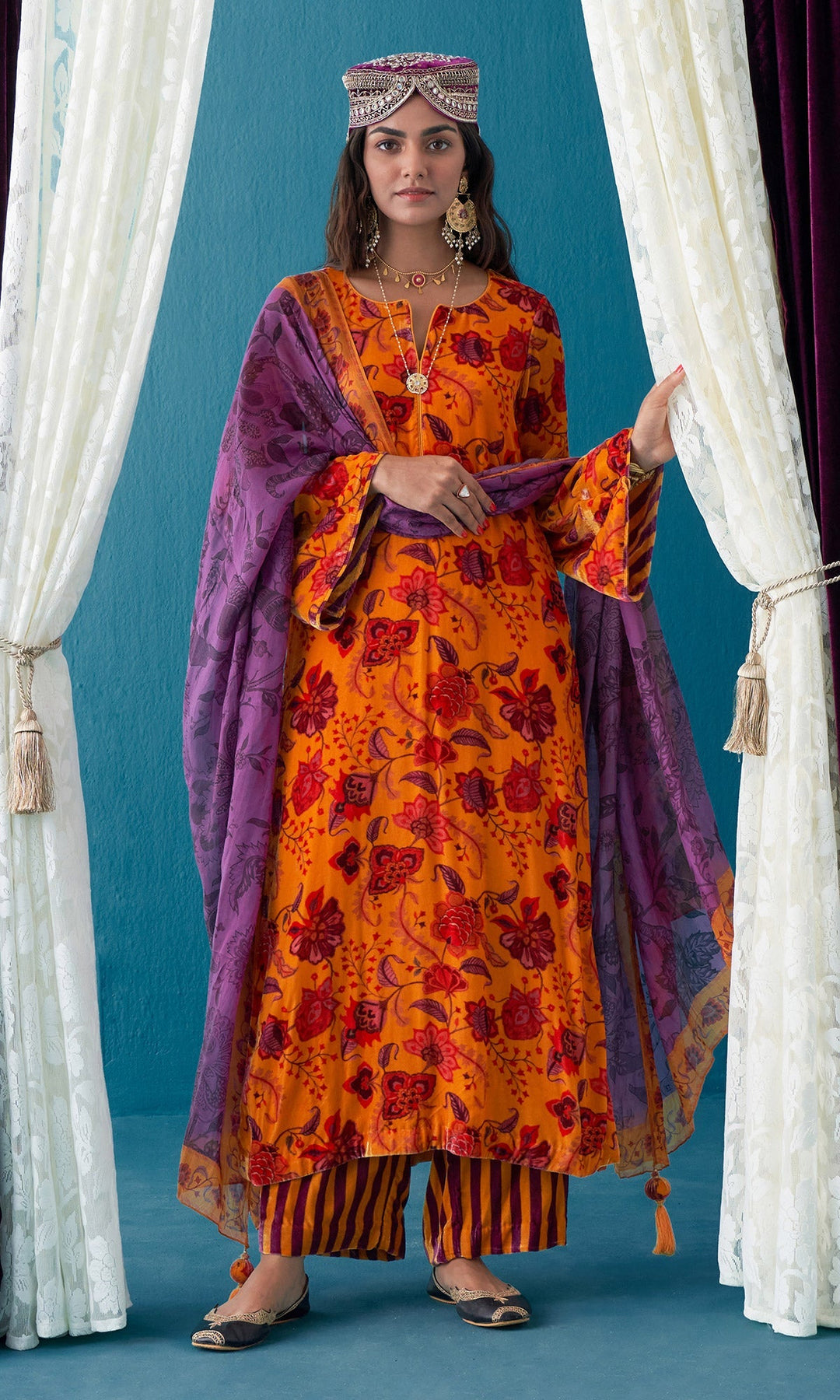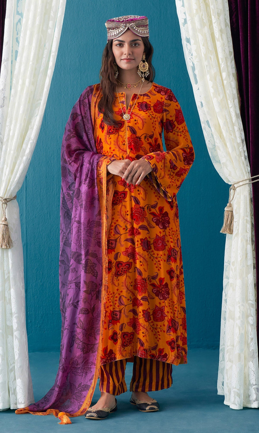 Khizaan Chintz Mustard Straight Velvet Kurta Set With Silk Dupatta Set Of 3 - RTS