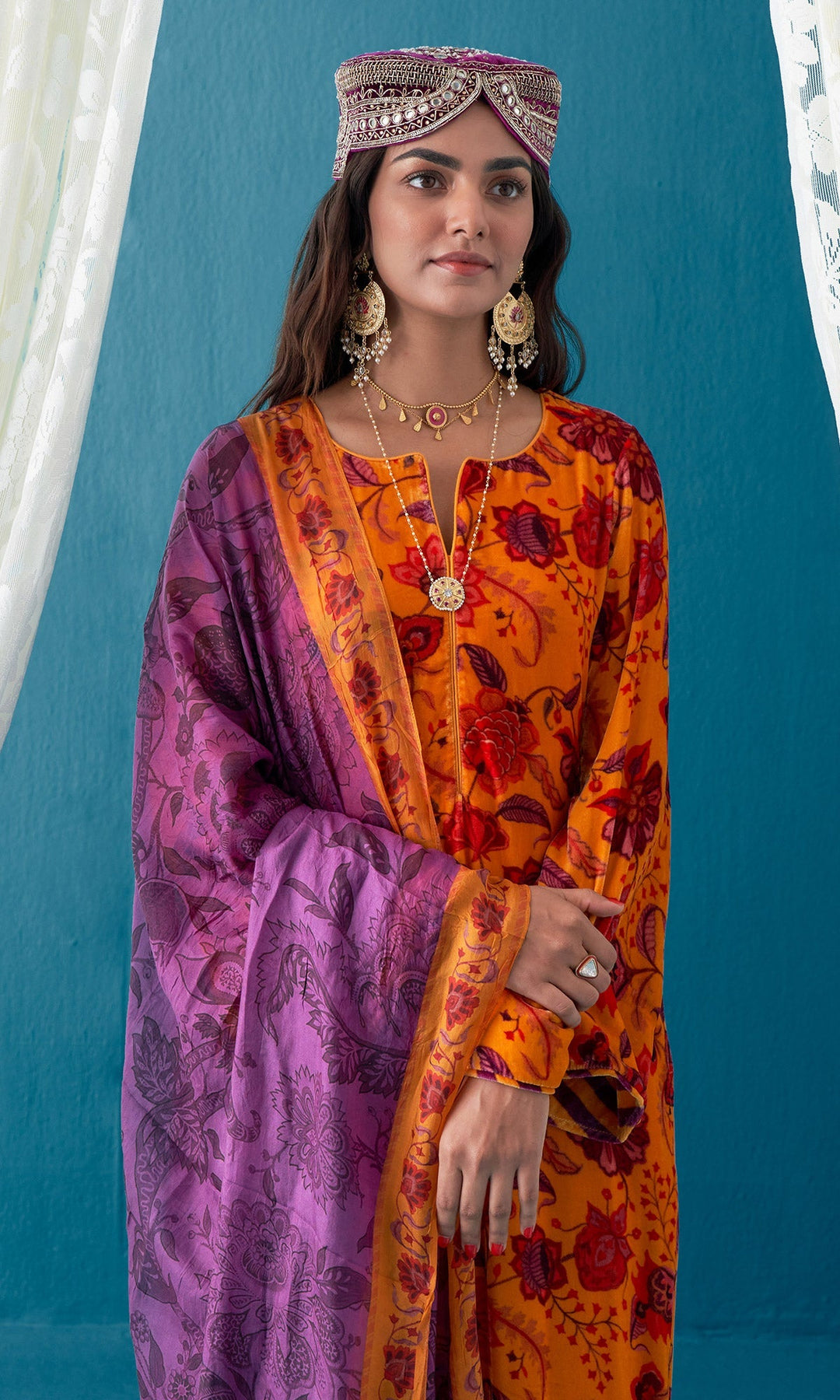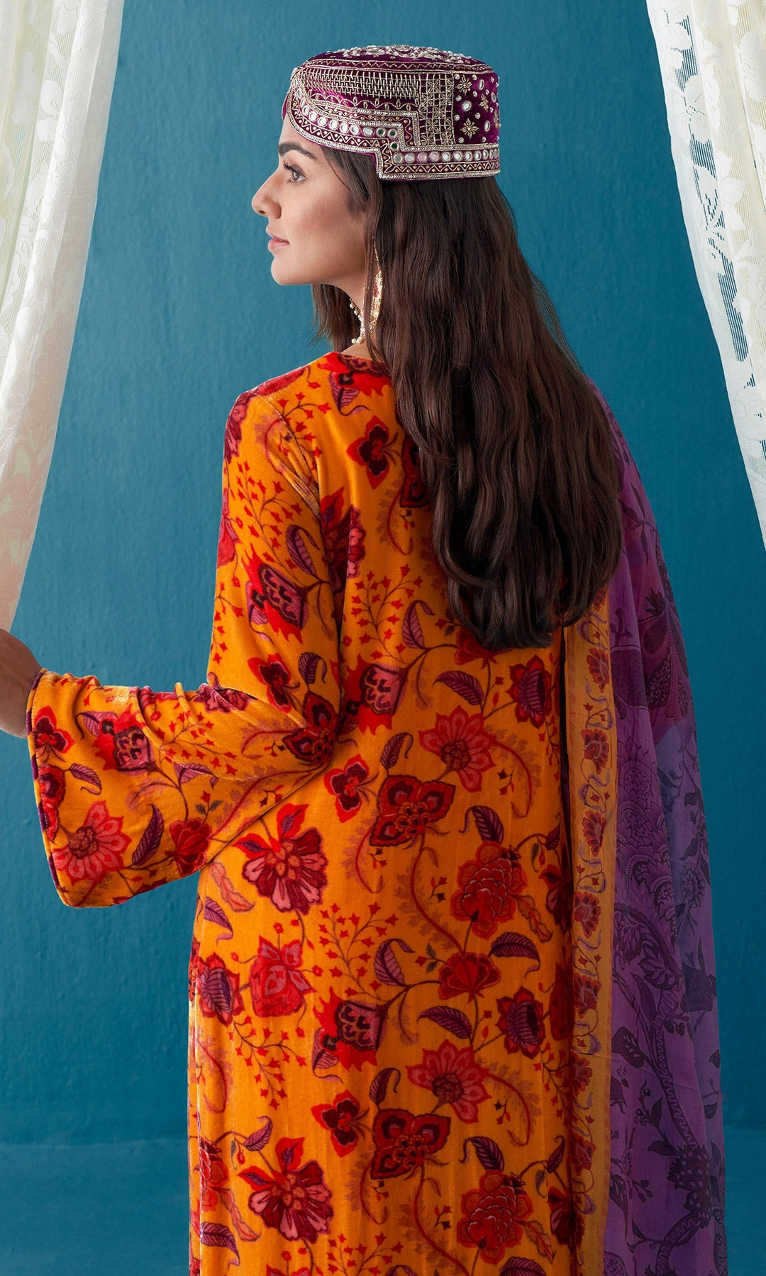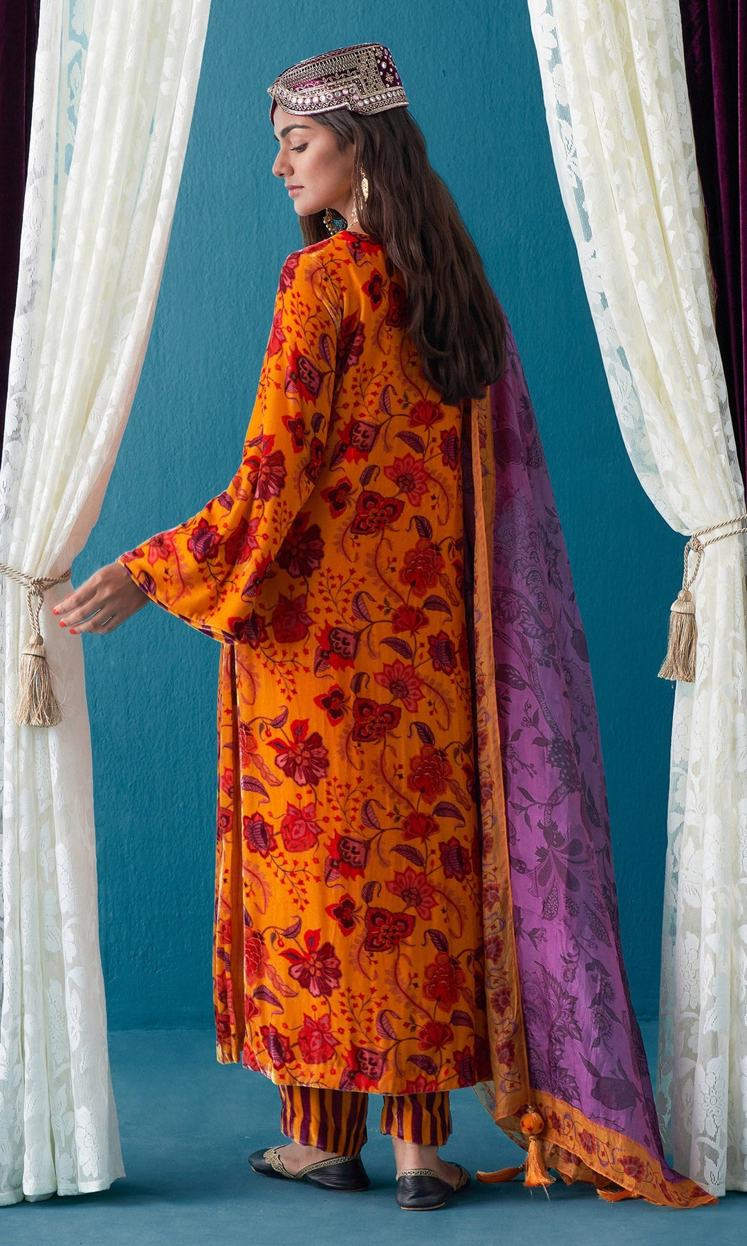 Khizaan Chintz Mustard Straight Velvet Kurta Set With Silk Dupatta Set Of 3 - RTS