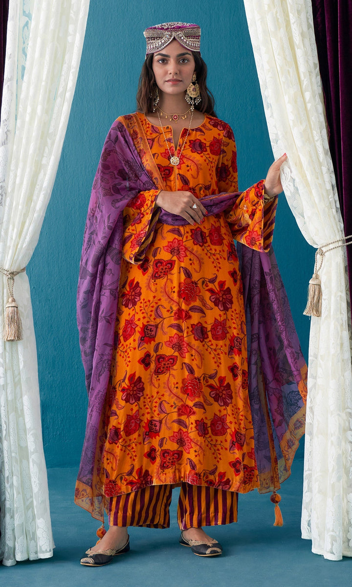 This Set Includes Chintz Velvet Kurta ,Velvet Palazzo And Silk Dupatta . Dupatta Has Tassel Detailing. Pockets Detailing In Kurta.