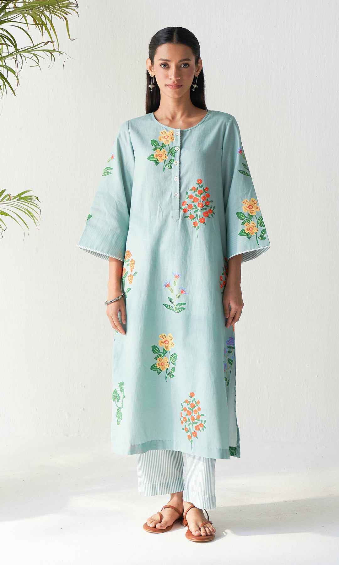 This set includes floral print kurta with palazzo. Kurta is detailed with back stripes fabric facing and side pockets