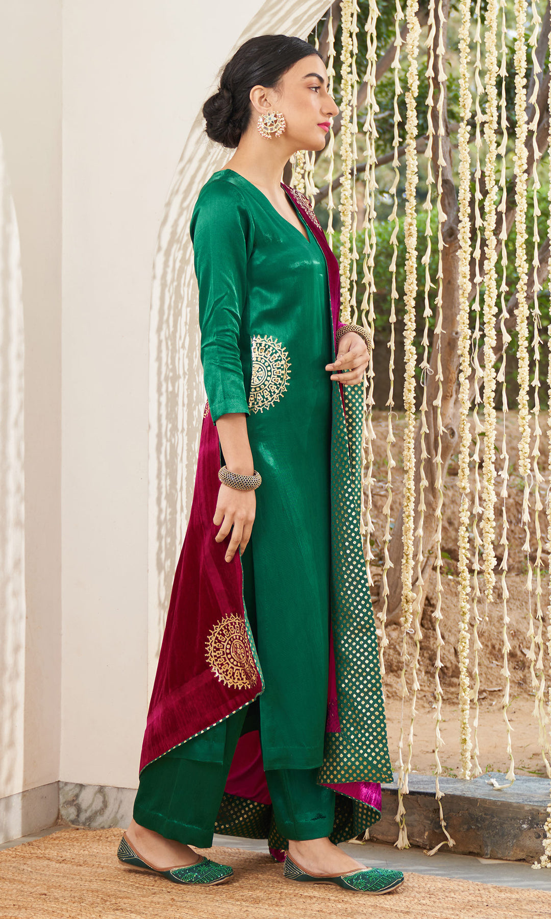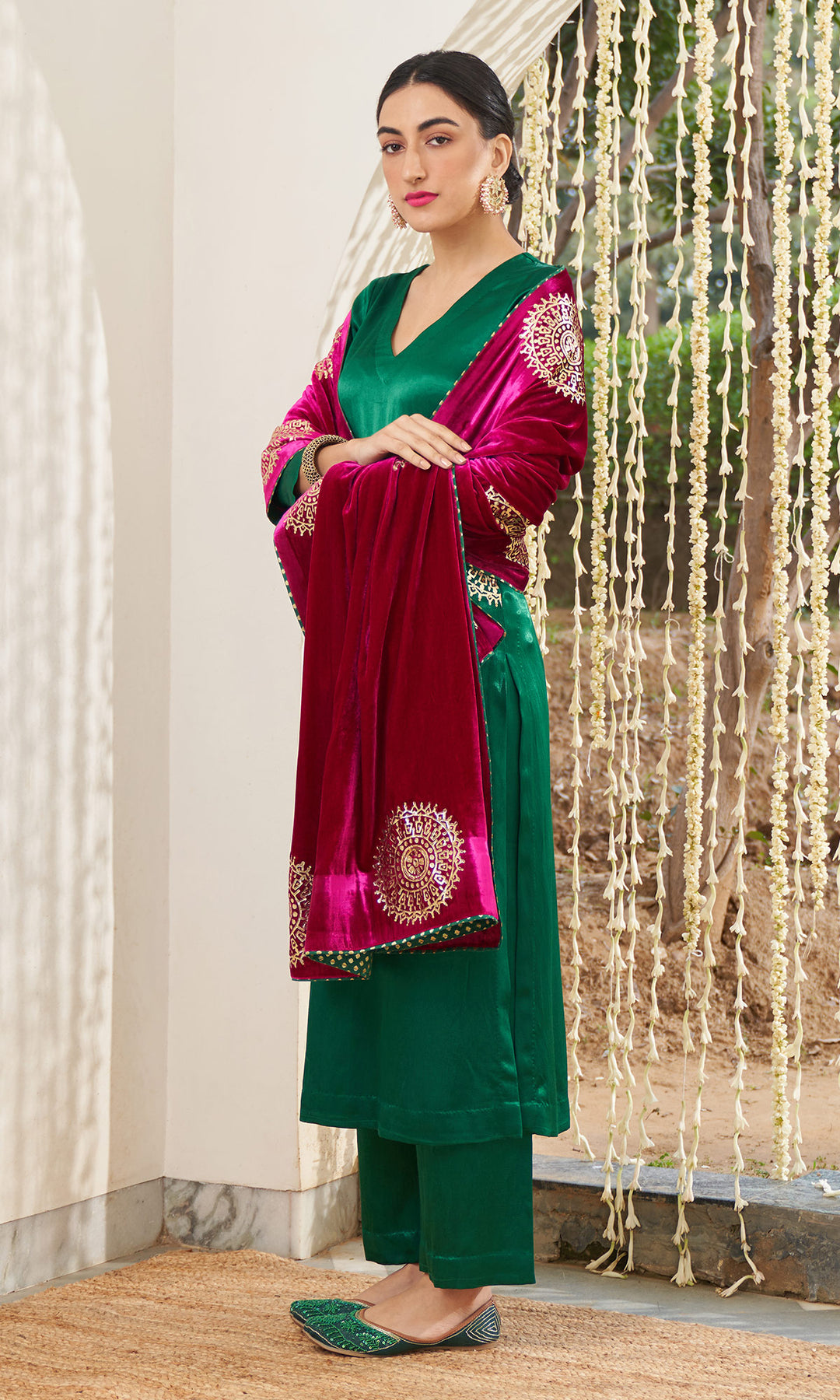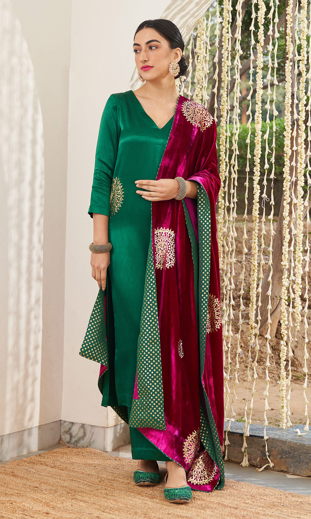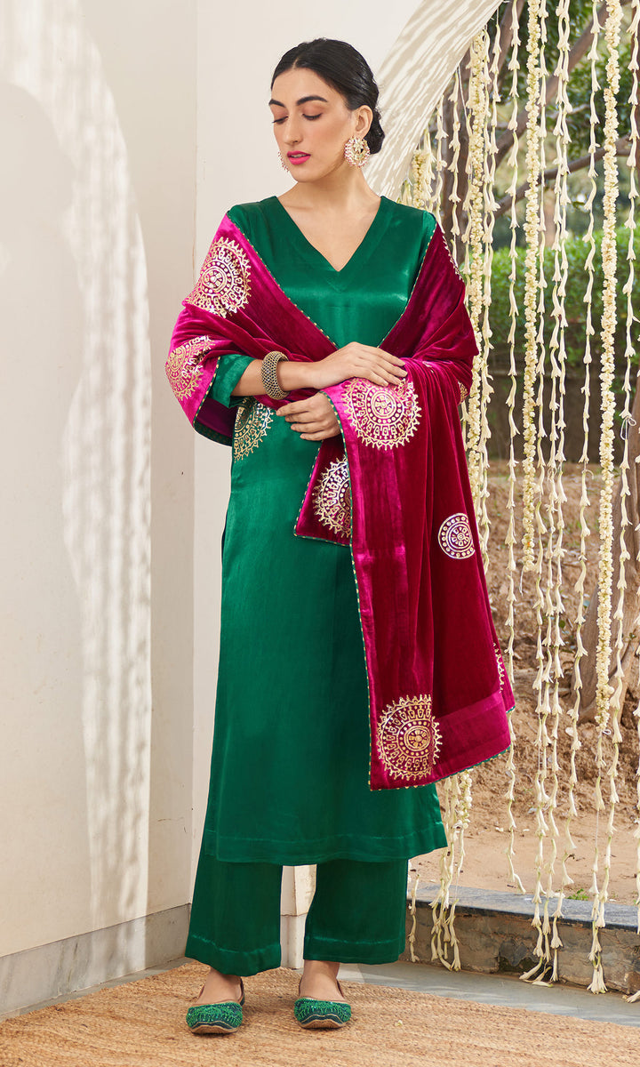 This set includes kurta , Palazzo and shawl. Kurta has pockets embellished with foil and mirror work. It comes with palazzo and foil printed shawl.