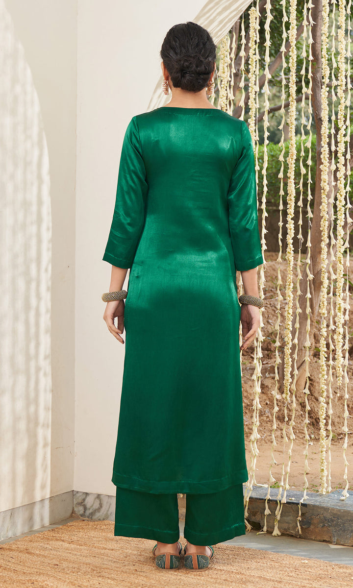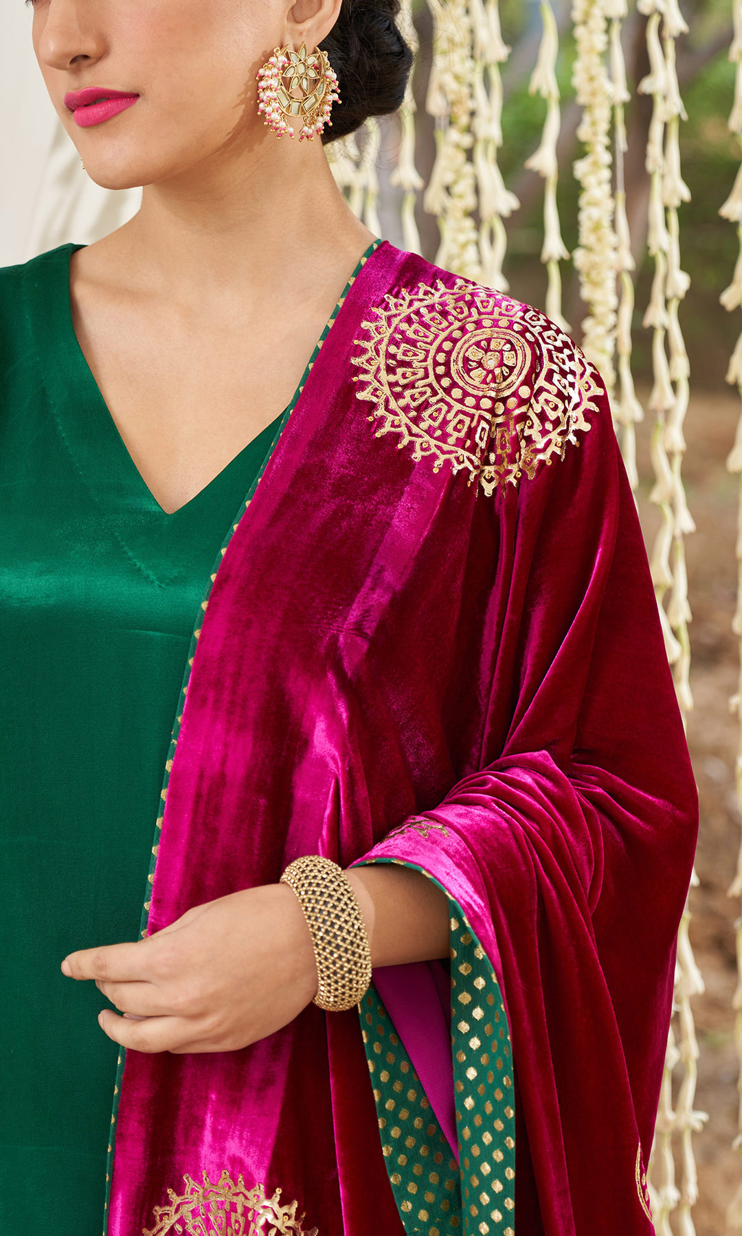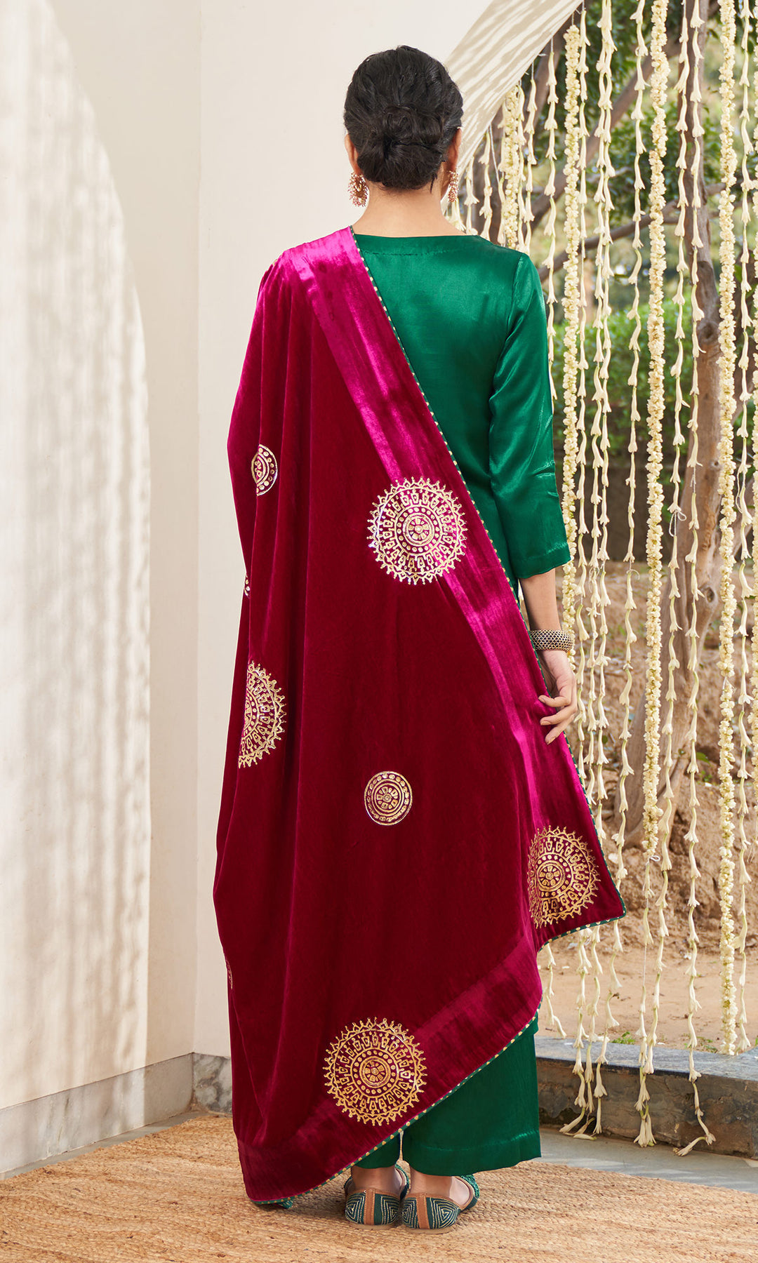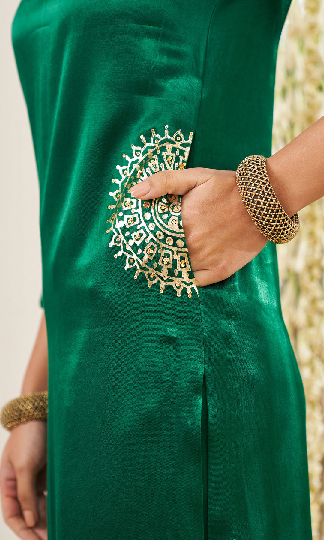 This set includes kurta , Palazzo and shawl. Kurta has pockets embellished with foil and mirror work. It comes with palazzo and foil printed shawl.