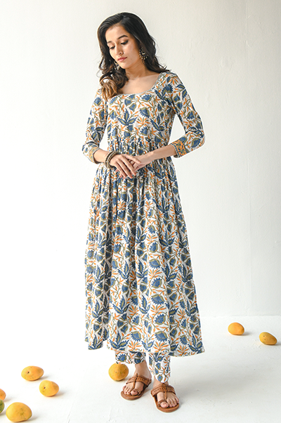 Blue and White Hand Block printed Anarkali kurta and Palazzo with kingri finishing. Chiffon Blue Dupatta with kingri detailing, finished with tassels.